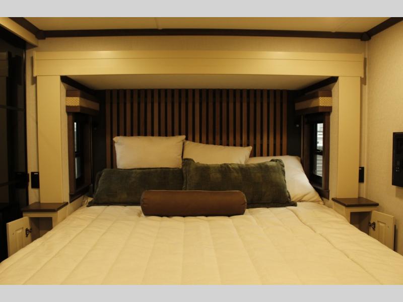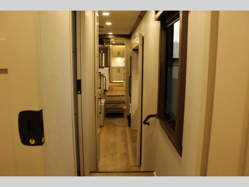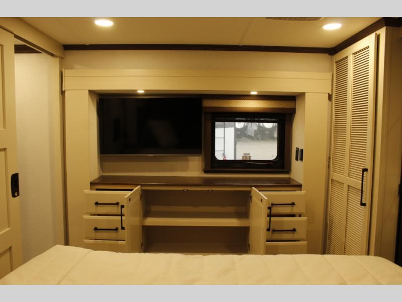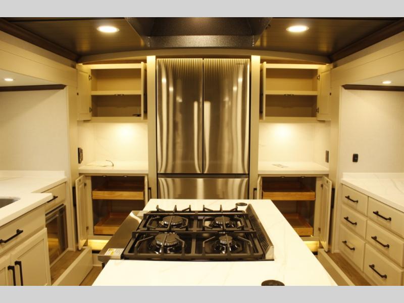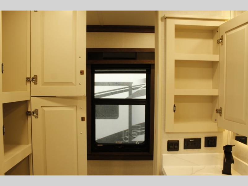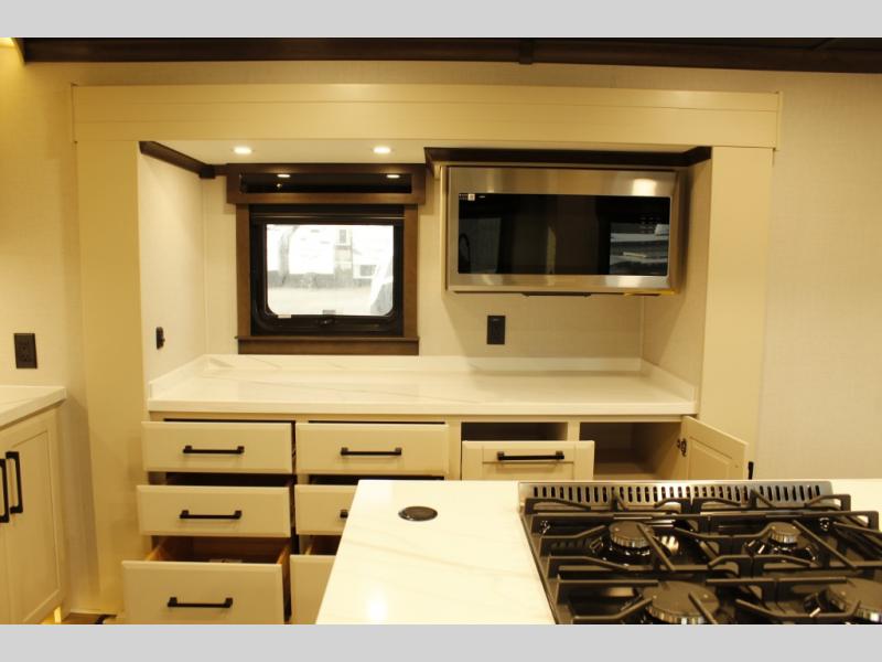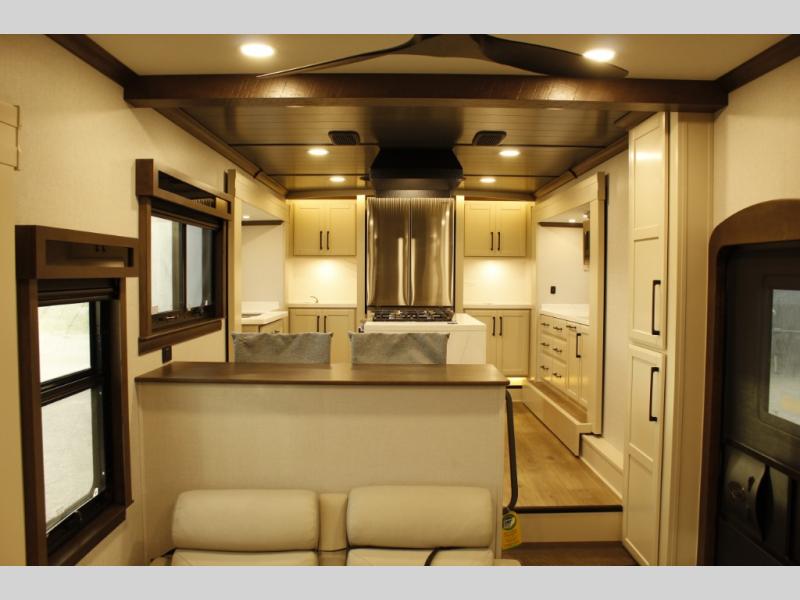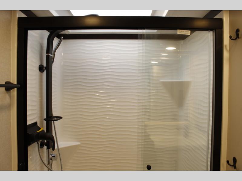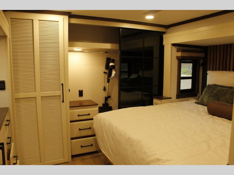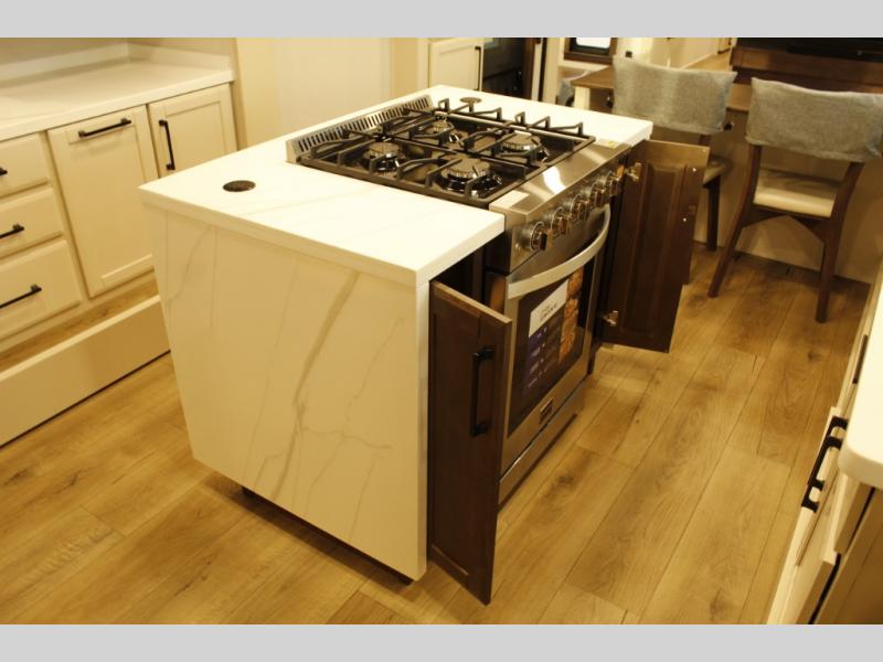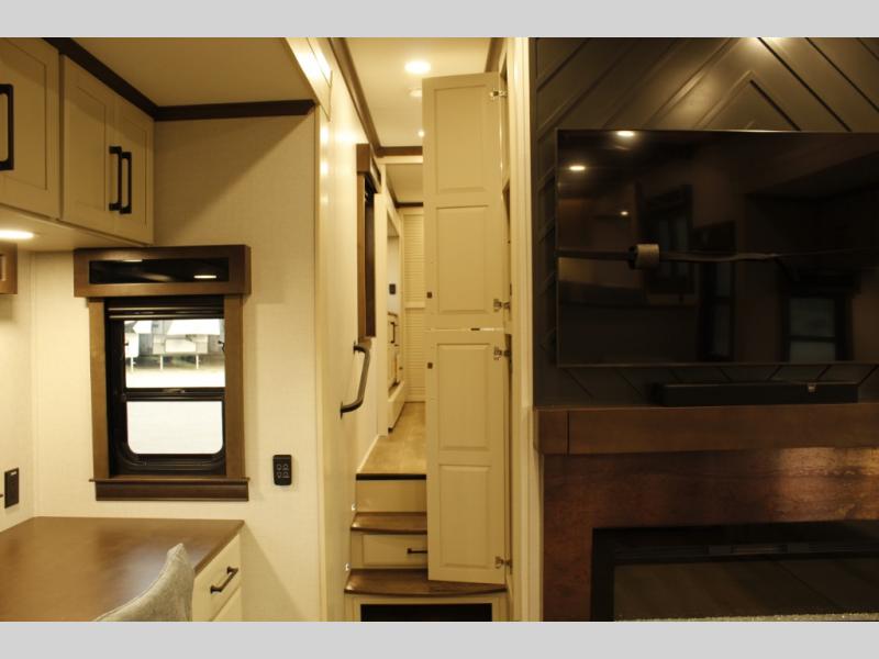 You will feel right at home in this fifth wheel! The rear private bedroom has a 72" x 80" king bed slide for a good night's rest, a rear large wardrobe with the washer and dryer next to it, and even a dresser with a 40" LED TV. And two can get ready at once in the full bathroom with the dual sink vanity. You can then head to either the desk slide to get some work done or whip up some scrambled eggs on the three burner cooktop at the island in the front kitchen. The kitchen even has a dishwasher for easy clean up and two bar stools at the high top dinette that overlooks the middle living area. Relax each night in true comfort on either the E-Z Glide sofa bed slide or the theater seating across from the entertainment center which has a fireplace and 65" Samsung LED Smart TV to watch your favorite movies!