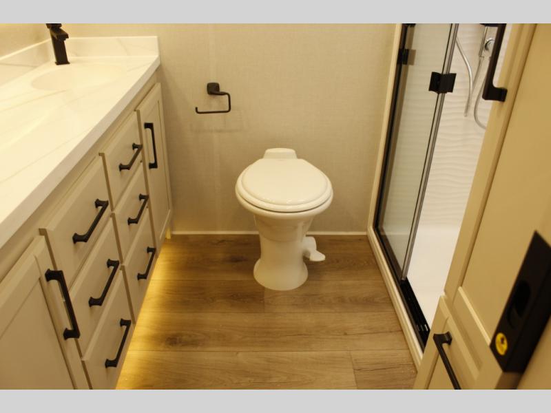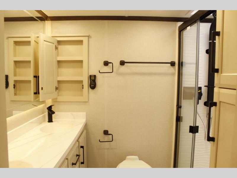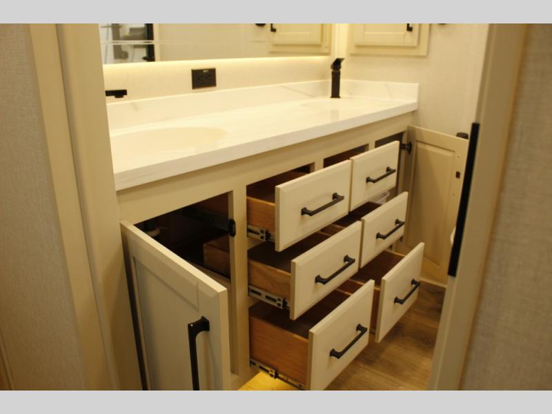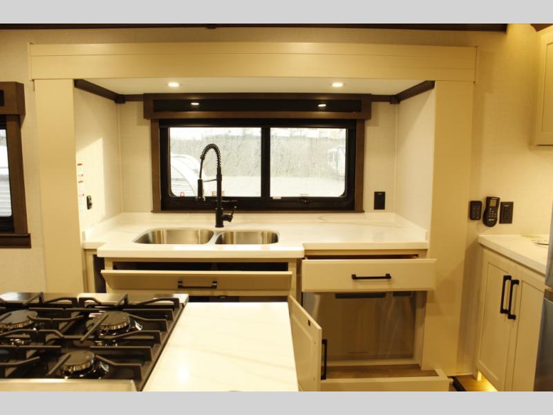The Forest River RiverStone fifth wheels and toy haulers are luxurious units that have it all! You'll find an automatic six-point hydraulic level-up system to keep your unit in place, and there is preparation for a four-camera observation system. The TravlFi Journey XTR 4G/LTE router and WiFi extender will help you stay connected to the outside world, and you'll never have to overpack again since the Splendid “Astral” stackable washer and dryer will let you clean the small amount of clothes you've brought with you. Another high luxury is the Fischer Paykal dishwasher which will allow you to spend more time enjoying your camp life and less time cleaning up. Each unit is built with a LCI Road Armour suspension system, dual-pane frameless windows, a full docking station, a 200W solar panel, and a BMPro touch control system.