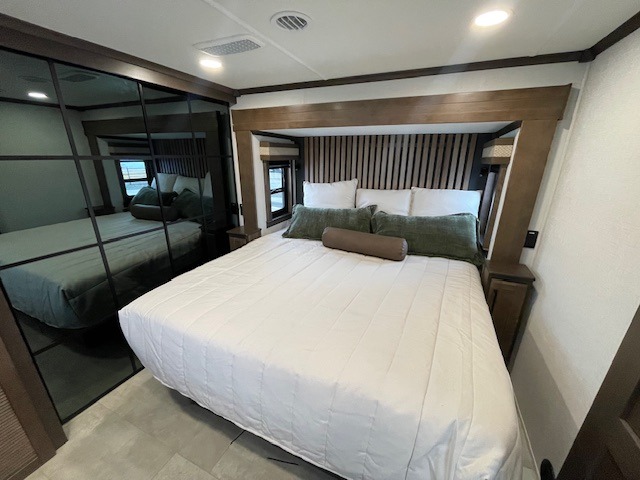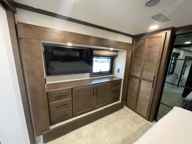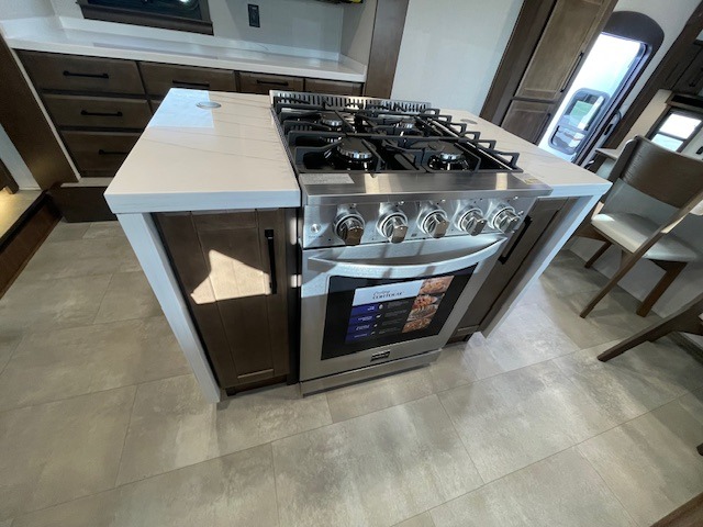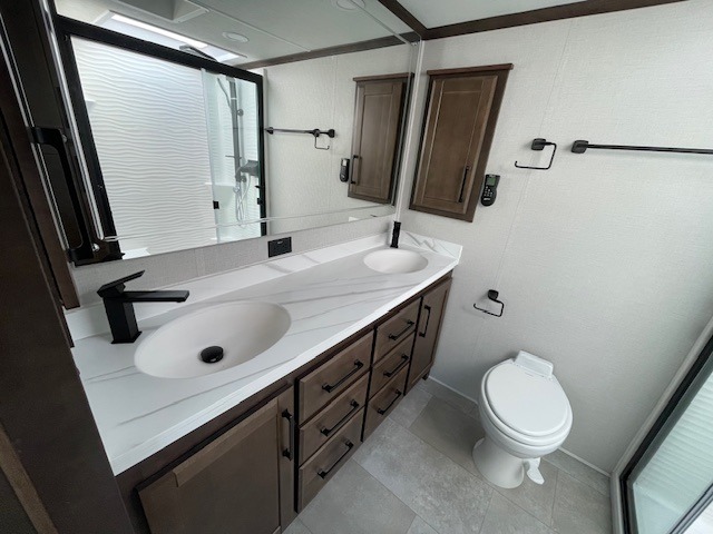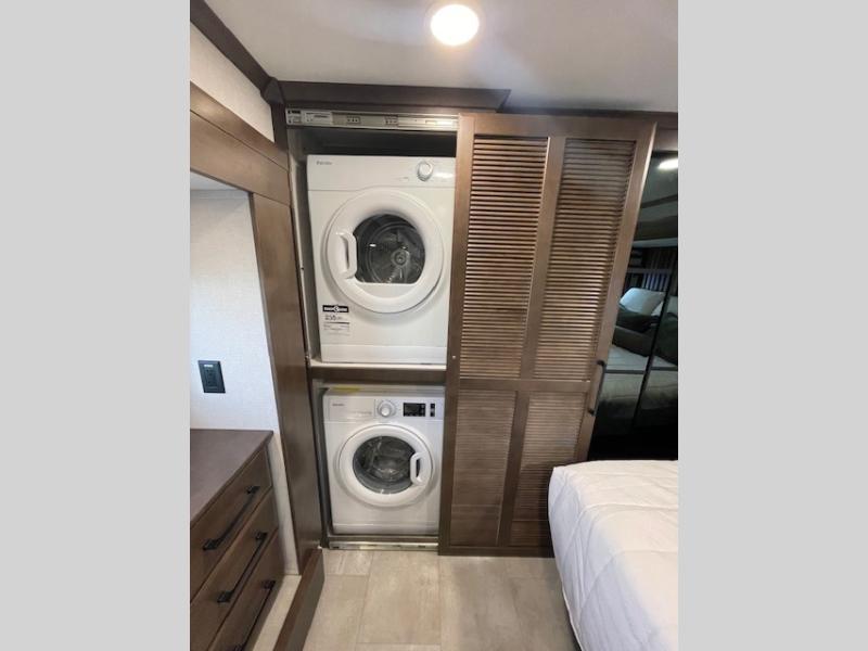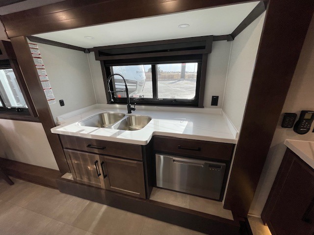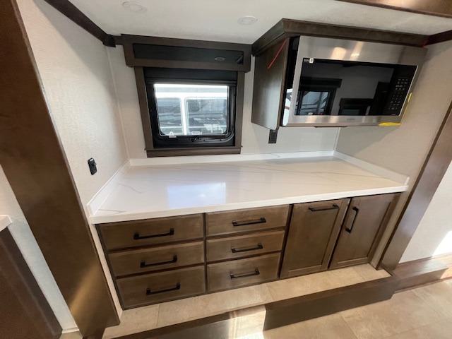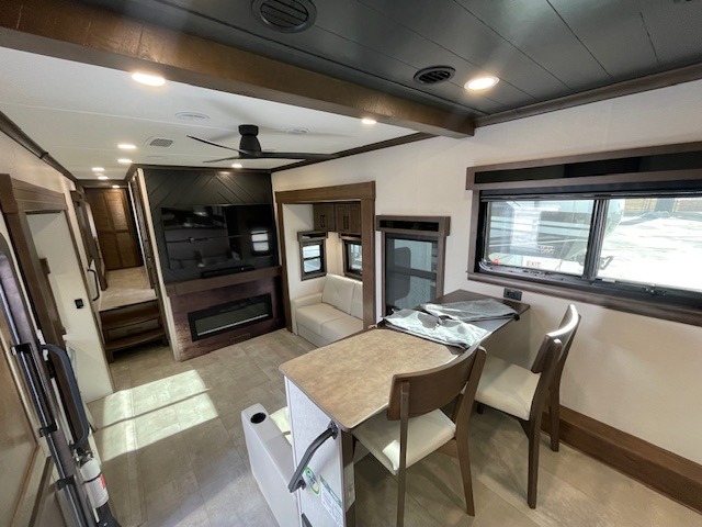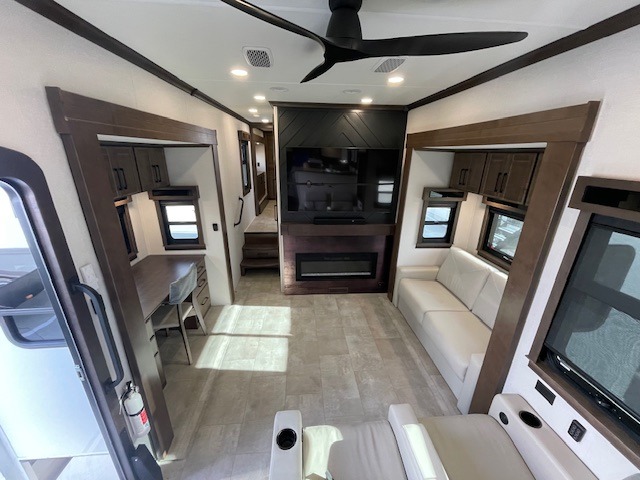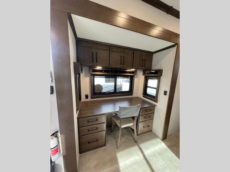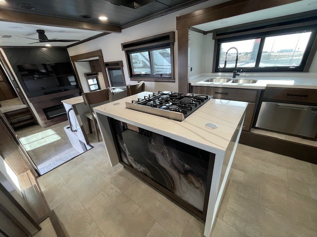 You will feel right at home in this fifth wheel! The rear private bedroom has a 72" x 80" king bed slide for a good night's rest, a rear large wardrobe with the washer and dryer next to it, and even a dresser with a 40" LED TV. And two can get ready at once in the full bathroom with the dual sink vanity. You can then head to either the desk slide to get some work done or whip up some scrambled eggs on the three burner cooktop at the island in the front kitchen. The kitchen even has a dishwasher for easy clean up and two bar stools at the high top dinette that overlooks the middle living area. Relax each night in true comfort on either the E-Z Glide sofa bed slide or the theater seating across from the entertainment center which has a fireplace and 65" Samsung LED Smart TV to watch your favorite movies!
