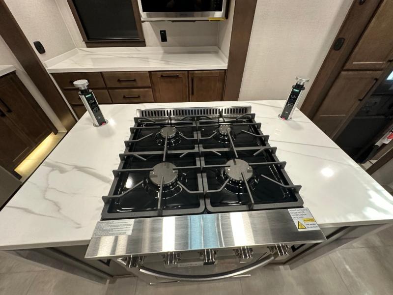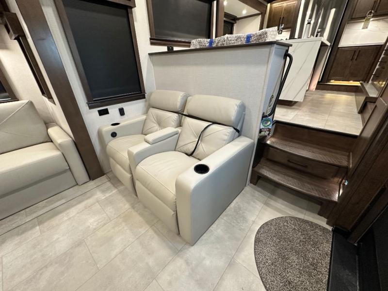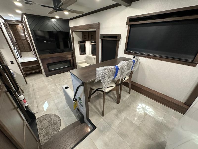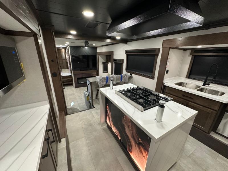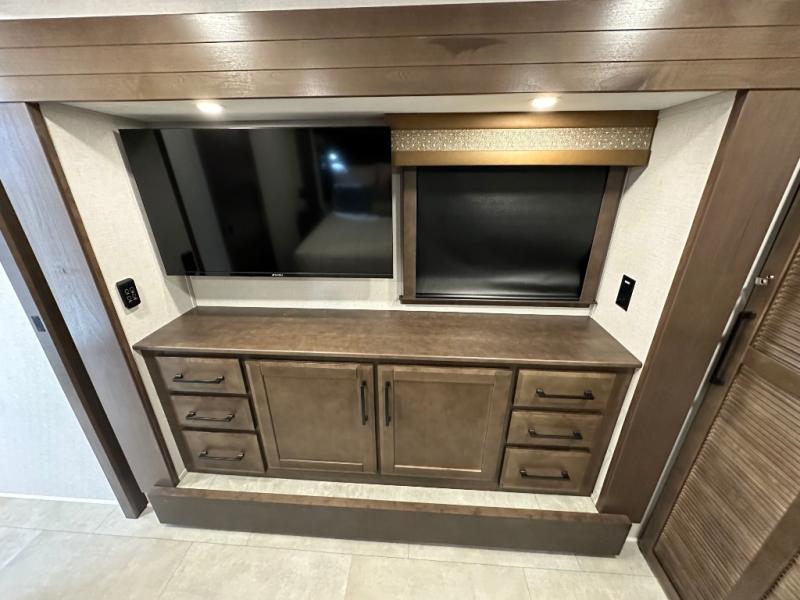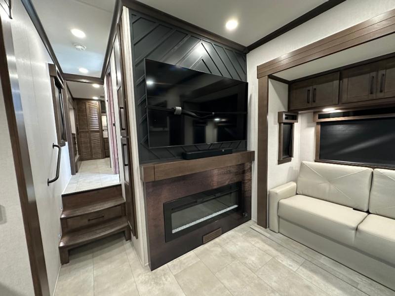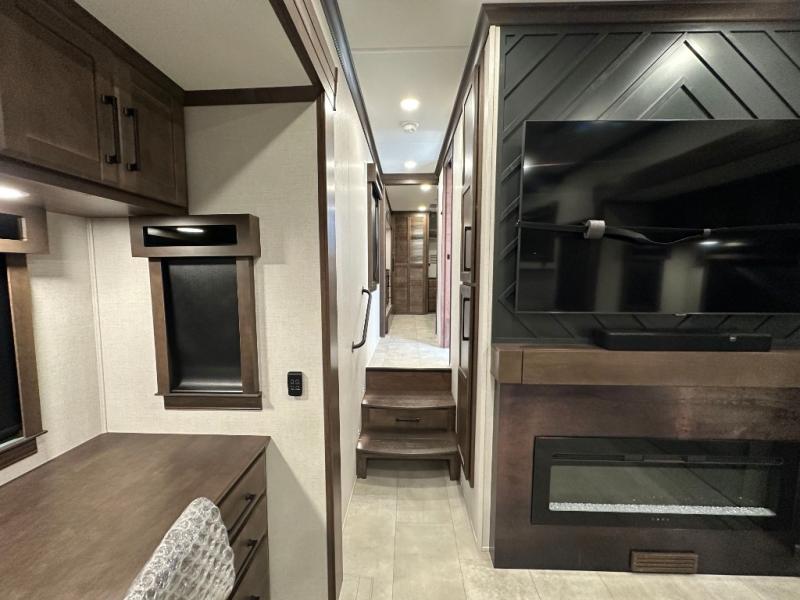 You will feel right at home in this fifth wheel! The rear private bedroom has a 72" x 80" king bed slide for a good night's rest, a rear large wardrobe with the washer and dryer next to it, and even a dresser with a 40" LED TV. And two can get ready at once in the full bathroom with the dual sink vanity. You can then head to either the desk slide to get some work done or whip up some scrambled eggs on the three burner cooktop at the island in the front kitchen. The kitchen even has a dishwasher for easy clean up and two bar stools at the high top dinette that overlooks the middle living area. Relax each night in true comfort on either the E-Z Glide sofa bed slide or the theater seating across from the entertainment center which has a fireplace and 65" Samsung LED Smart TV to watch your favorite movies!