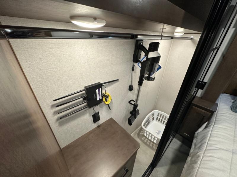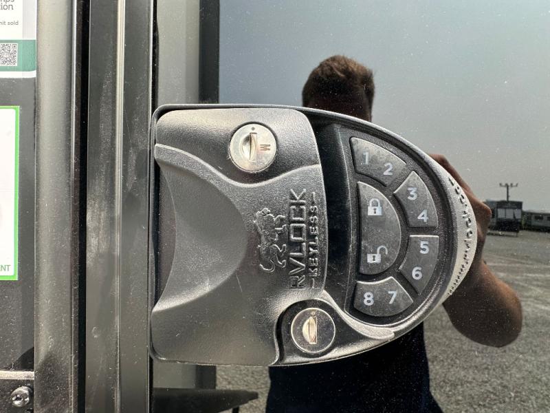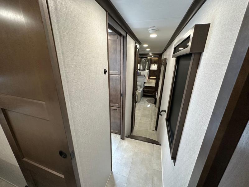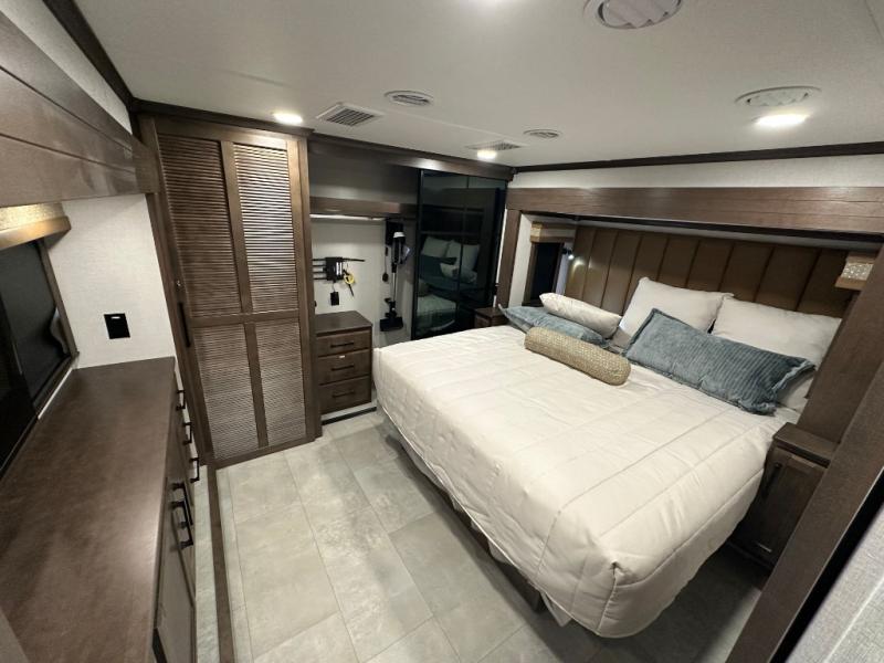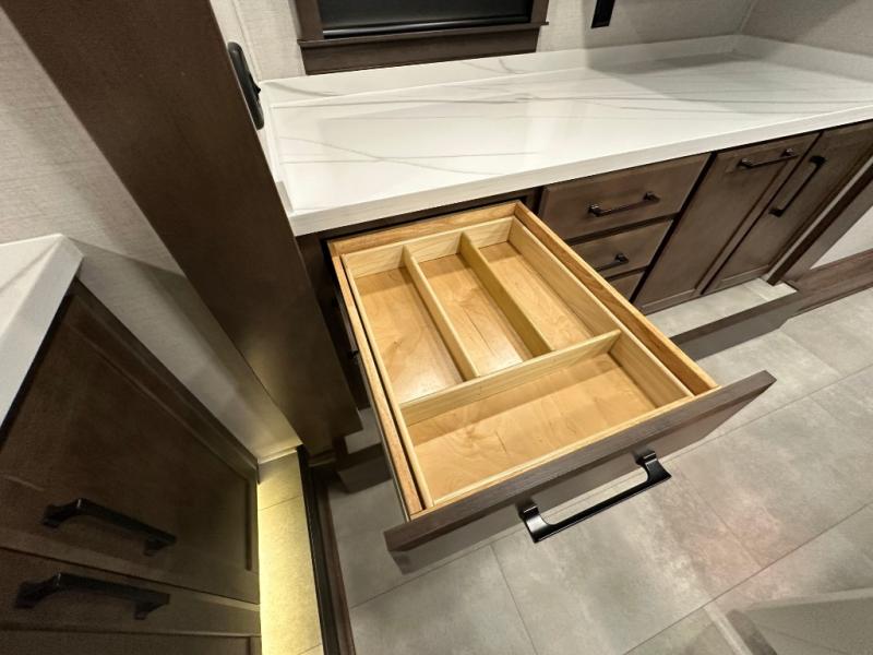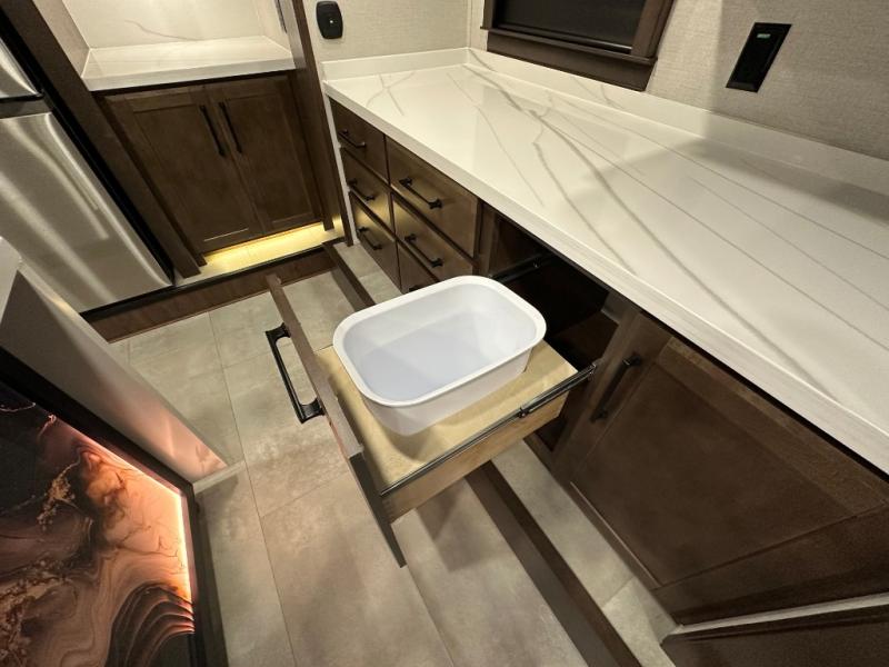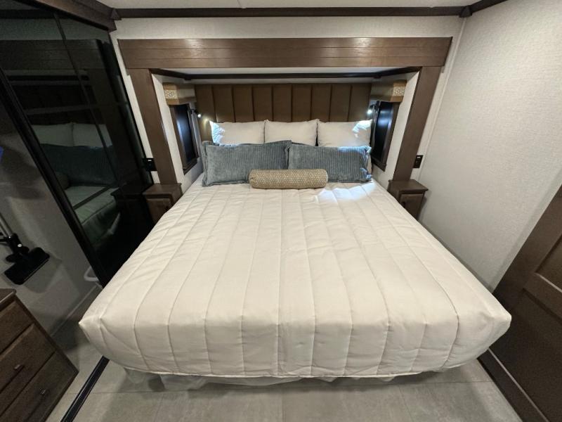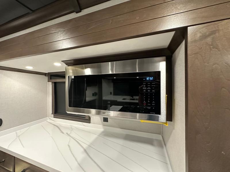 You will feel right at home in this fifth wheel! The rear private bedroom has a 72" x 80" king bed slide for a good night's rest, a rear large wardrobe with the washer and dryer next to it, and even a dresser with a 40" LED TV. And two can get ready at once in the full bathroom with the dual sink vanity. You can then head to either the desk slide to get some work done or whip up some scrambled eggs on the three burner cooktop at the island in the front kitchen. The kitchen even has a dishwasher for easy clean up and two bar stools at the high top dinette that overlooks the middle living area. Relax each night in true comfort on either the E-Z Glide sofa bed slide or the theater seating across from the entertainment center which has a fireplace and 65" Samsung LED Smart TV to watch your favorite movies!