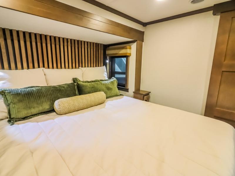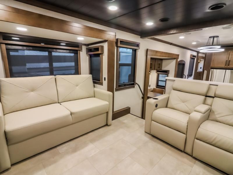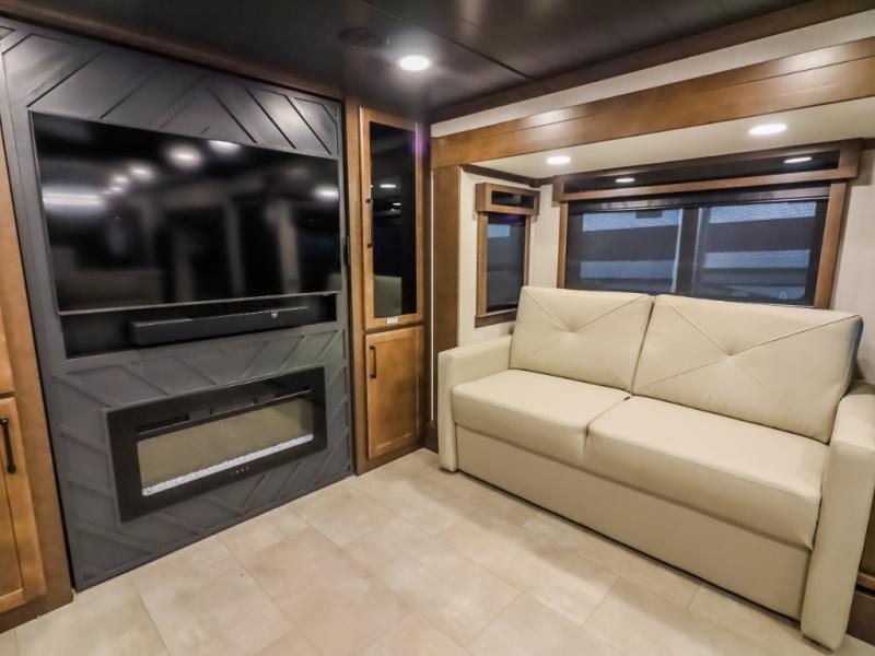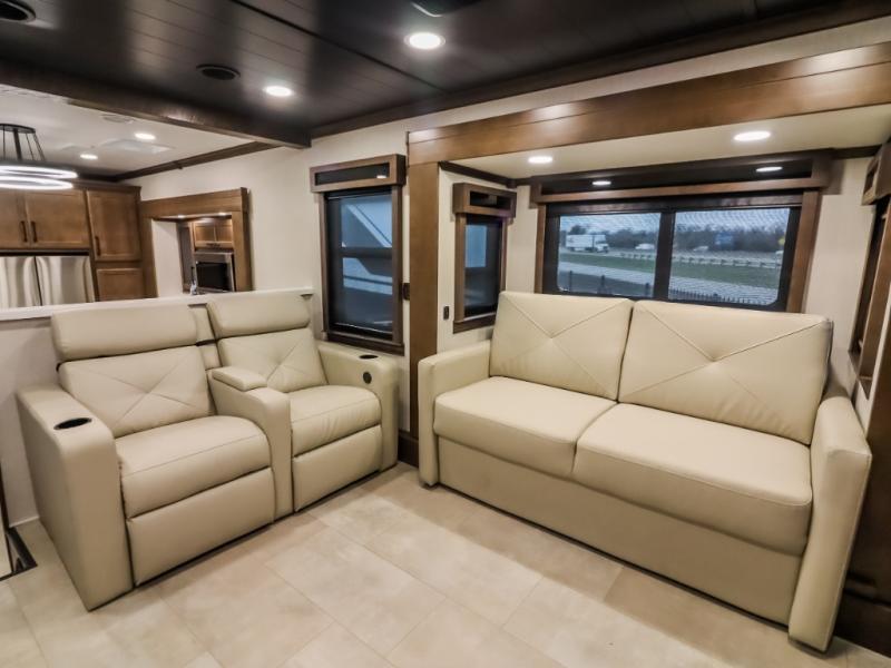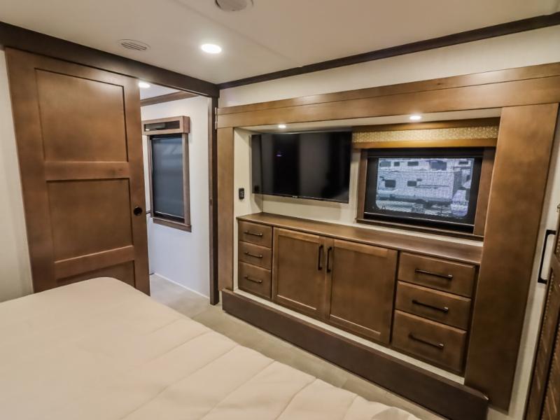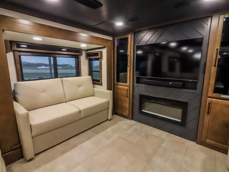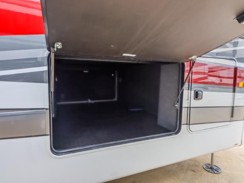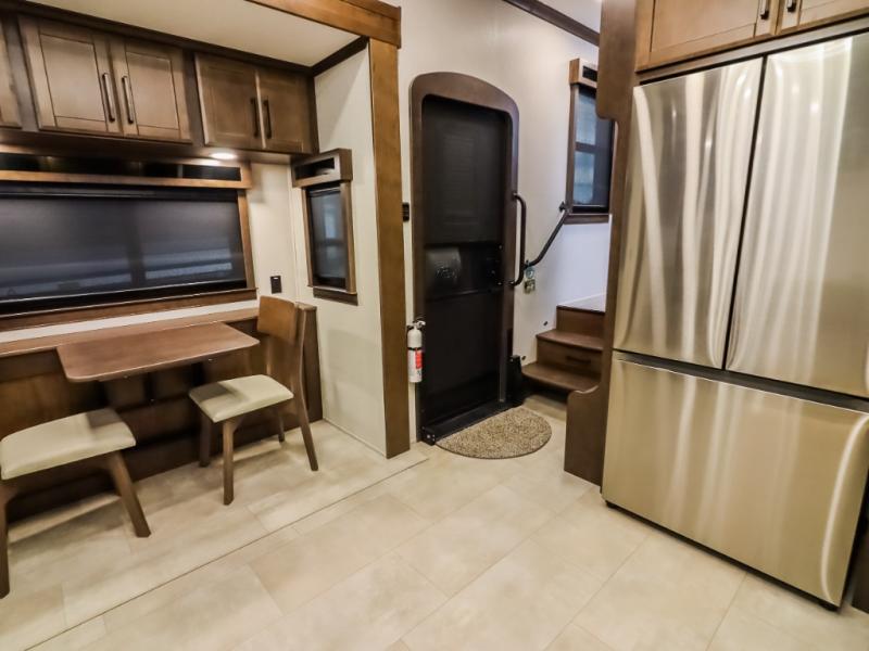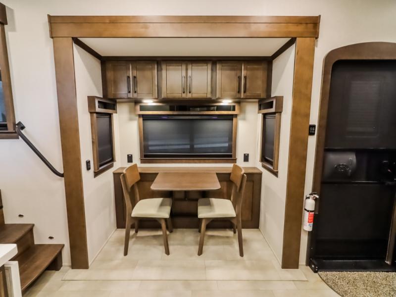 Pack your bags and head to your most comfortable camping trip ever in this packed out fifth wheel! The rear private bedroom has a 72" x 80" king bed slide for a good night's rest, a rear large wardrobe with the washer and dryer next to it, and even a dresser with a 40" LED TV. Get ready in the full bathroom with the shower then head to either the pull-out dinette to read the morning paper or whip up some scrambled eggs on the three burner cooktop in the middle kitchen. The kitchen even has two pantries for all your favorite snacks and a coat rack to hang your jacket. You can relax in the evenings on the two E-Z Glide sofa beds or the theater sofa across from the Samsung LED Smart TV. What's behind the swinging entertainment center is where the real convenience is found with this model; a hidden front office with ample counter space to get your work done!
