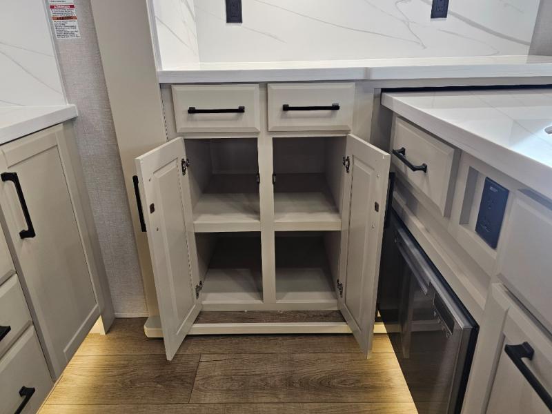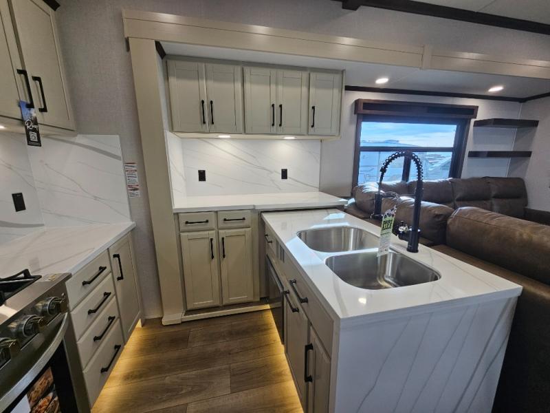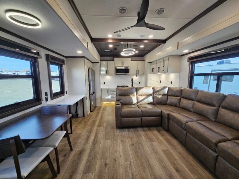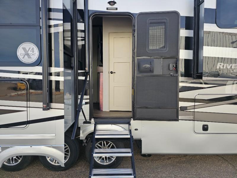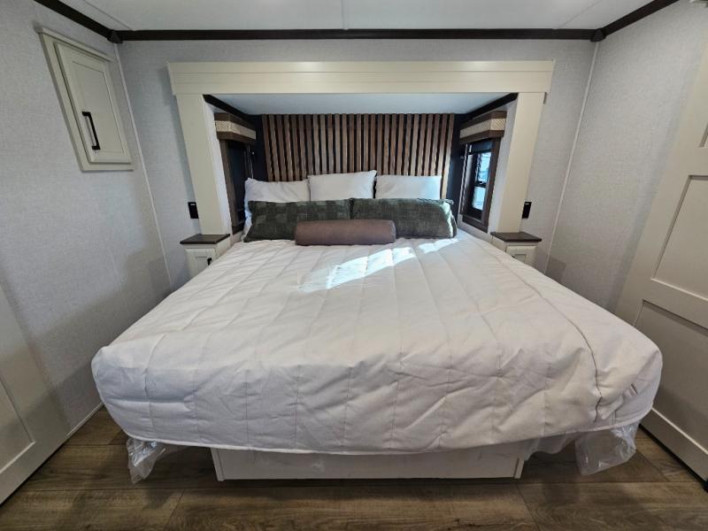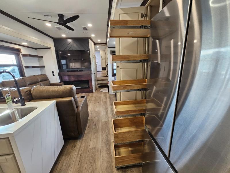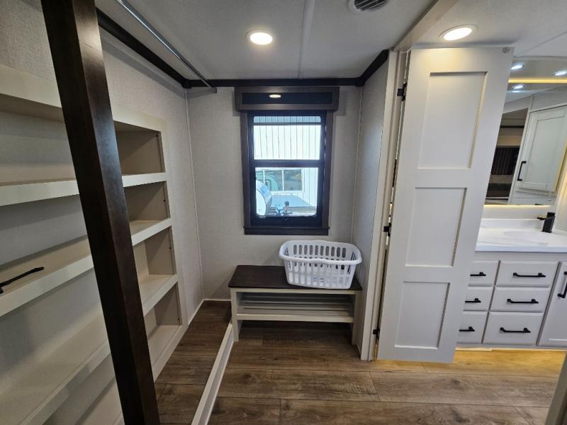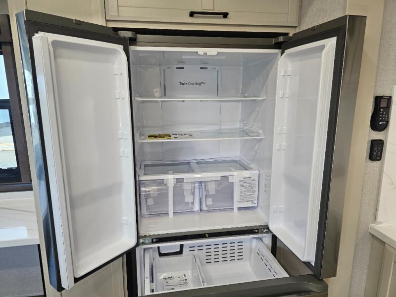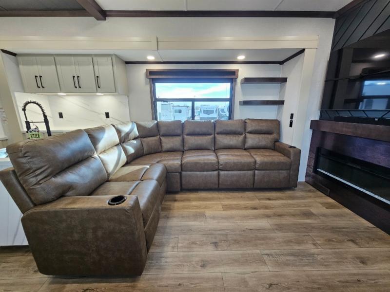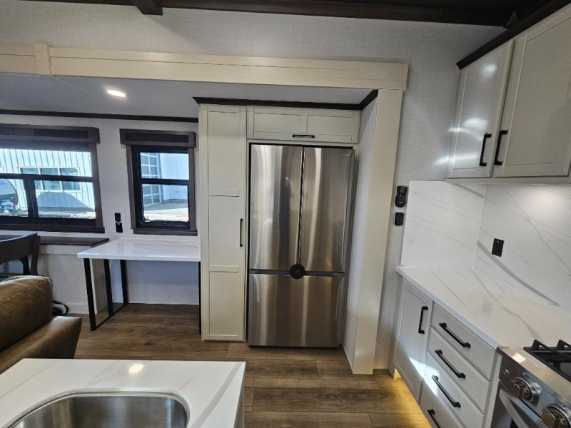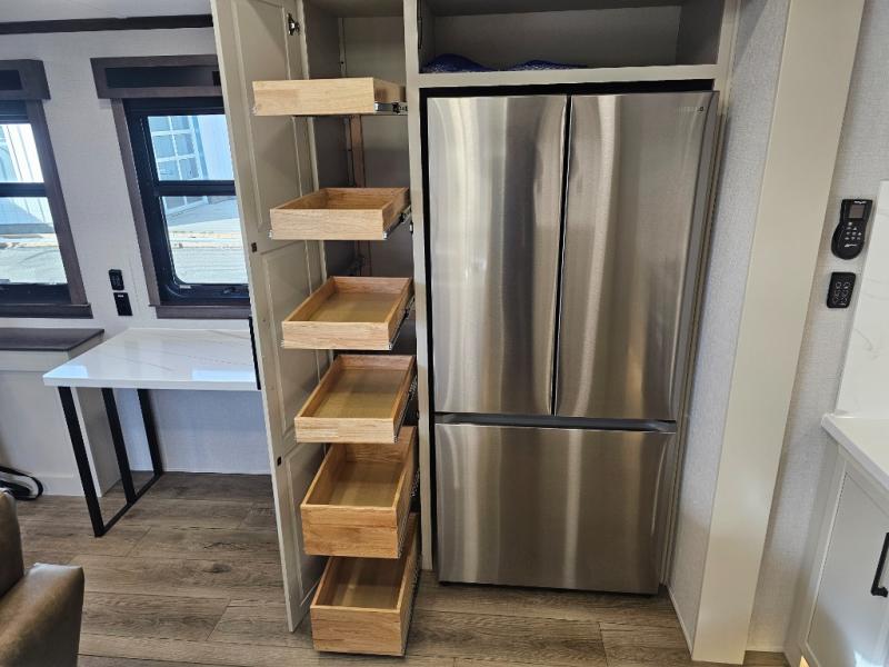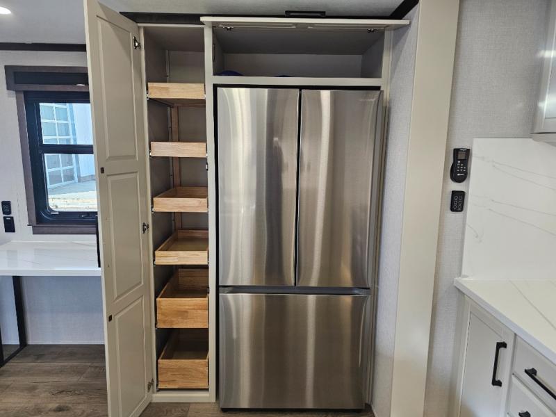 The RiverStone 43BFC isn't just another fifth wheel... it's a residential retreat designed for travelers who want every journey to feel like home. This impressive floor has a designated high-end kitchen space with tons of room, a large pantry, ample counter space and a lovely french door refrigerator will make for unforgettable meals on the go. You can also enjoy a great time with your partner and enjoy all the free time you want at the large sectional sofa you'll never want to leave! After enjoying the living room you will be fascinated by the primary bedroom suite that delivers a quiet, comfortable and spacious sanctuary featuring a dresser and dedicated shoe storage to organize all your personal belongings.
