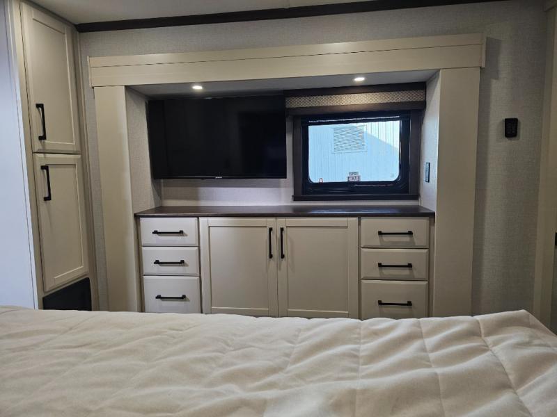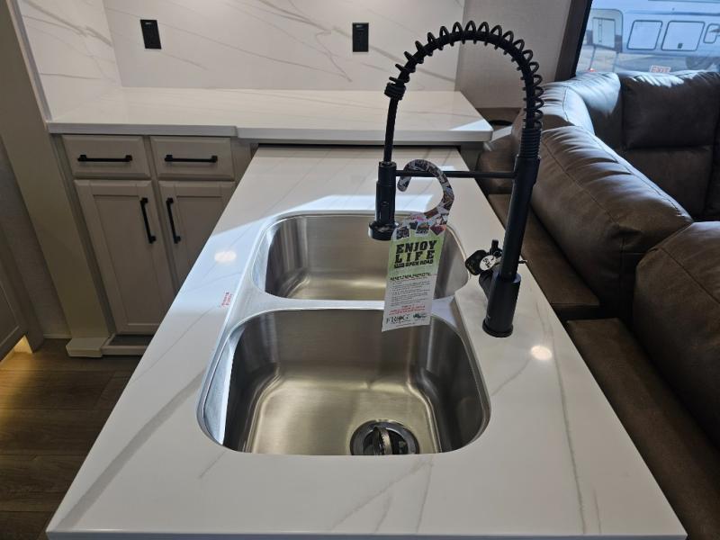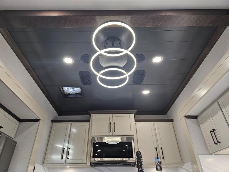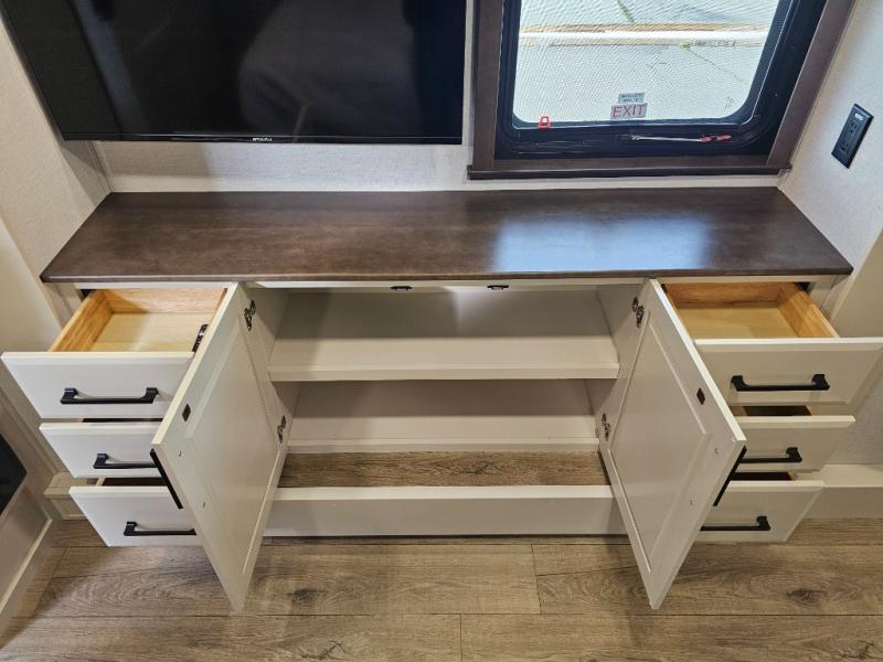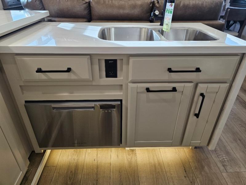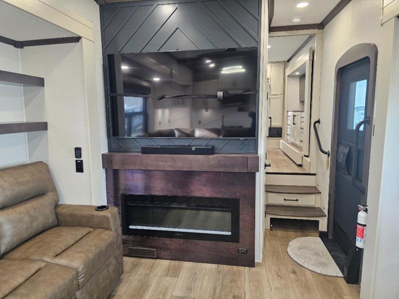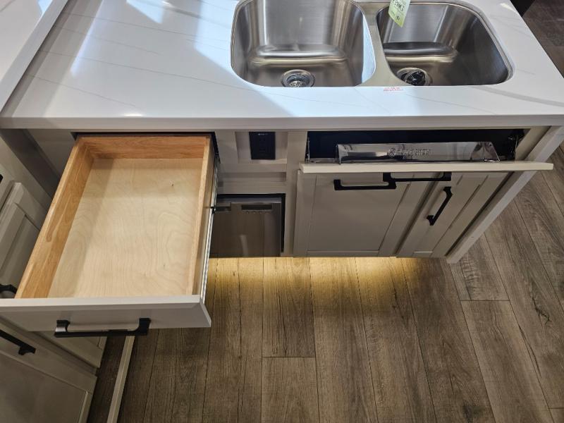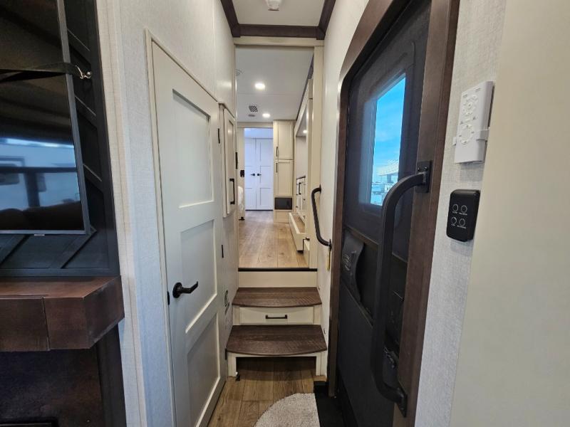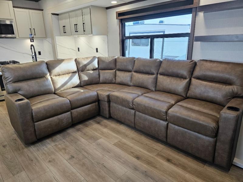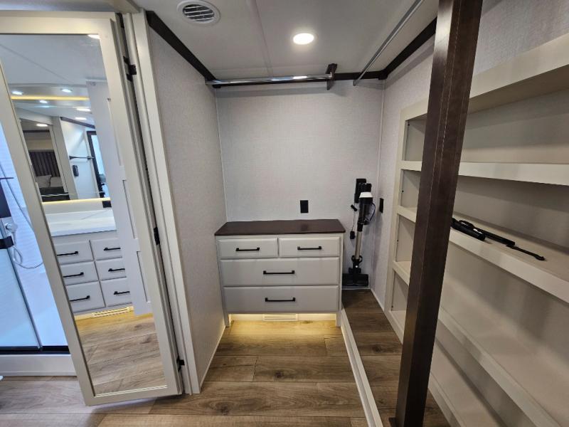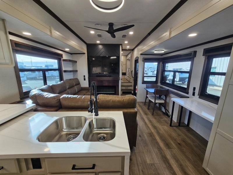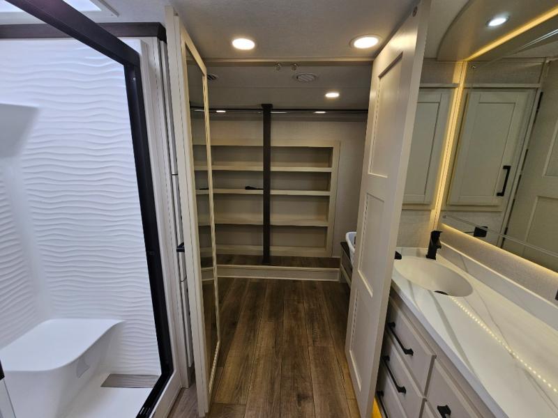 The RiverStone 43BFC isn't just another fifth wheel... it's a residential retreat designed for travelers who want every journey to feel like home. This impressive floor has a designated high-end kitchen space with tons of room, a large pantry, ample counter space and a lovely french door refrigerator will make for unforgettable meals on the go. You can also enjoy a great time with your partner and enjoy all the free time you want at the large sectional sofa you'll never want to leave! After enjoying the living room you will be fascinated by the primary bedroom suite that delivers a quiet, comfortable and spacious sanctuary featuring a dresser and dedicated shoe storage to organize all your personal belongings.