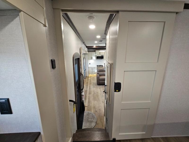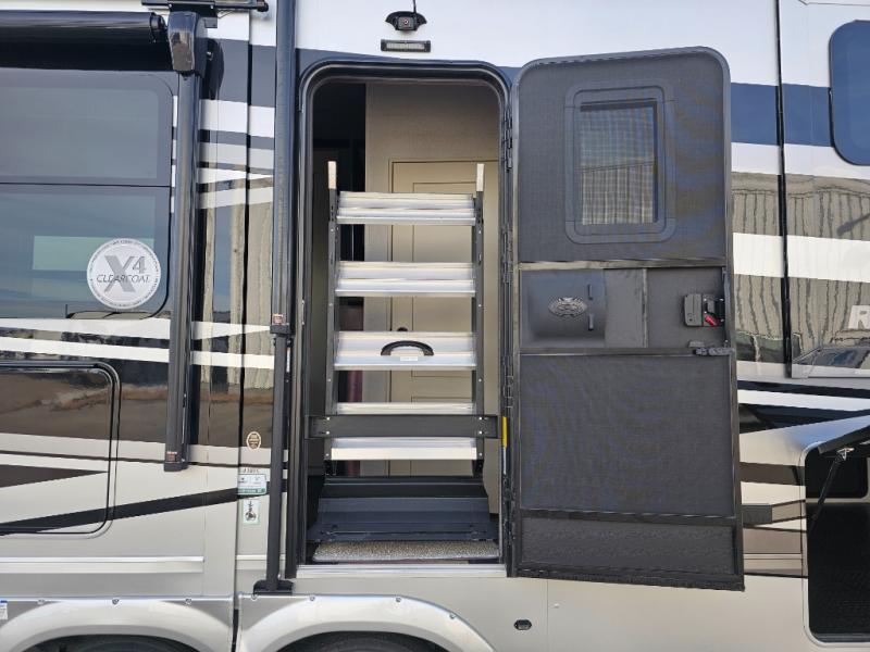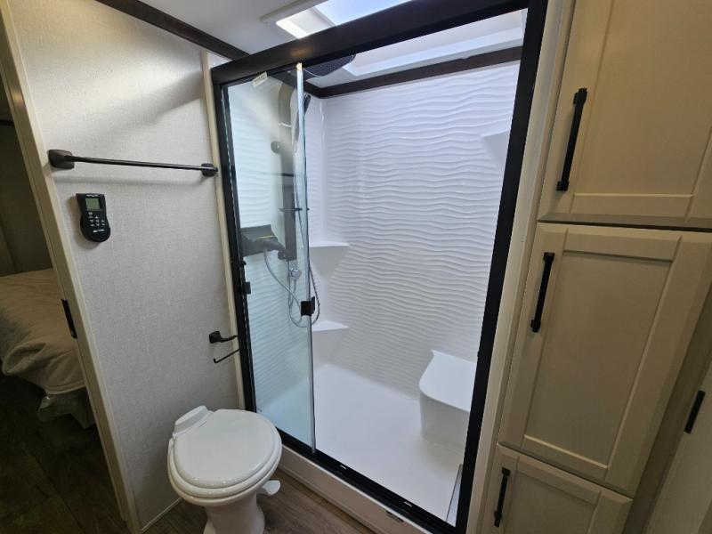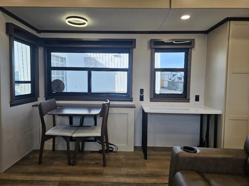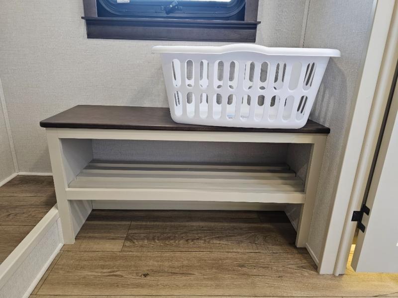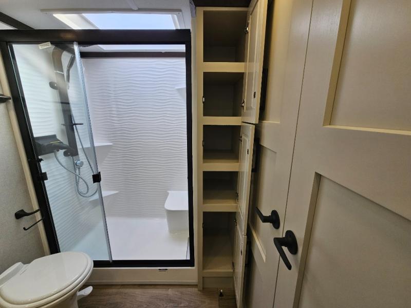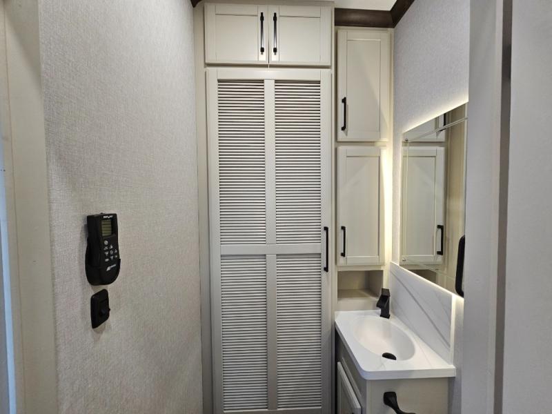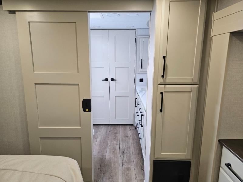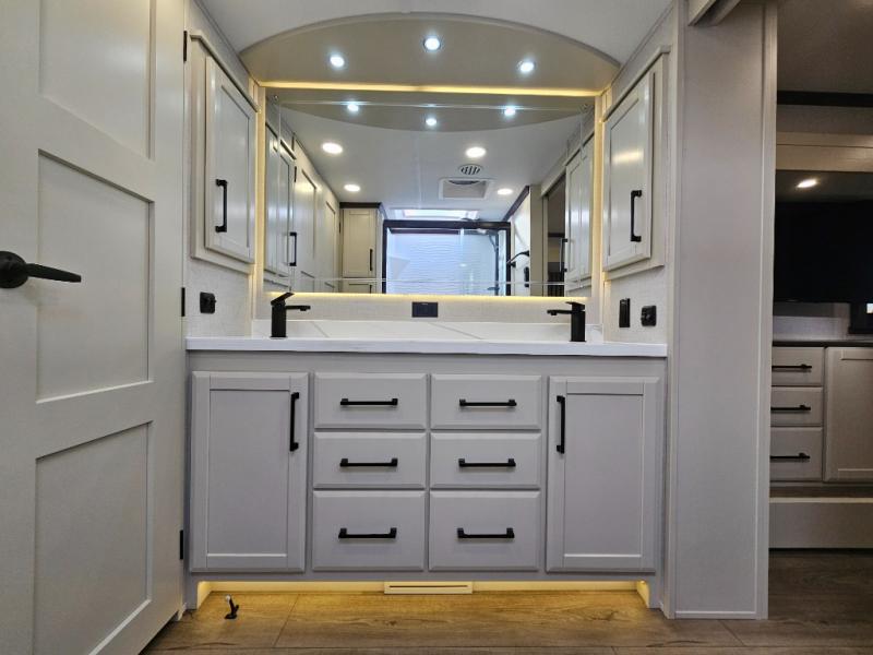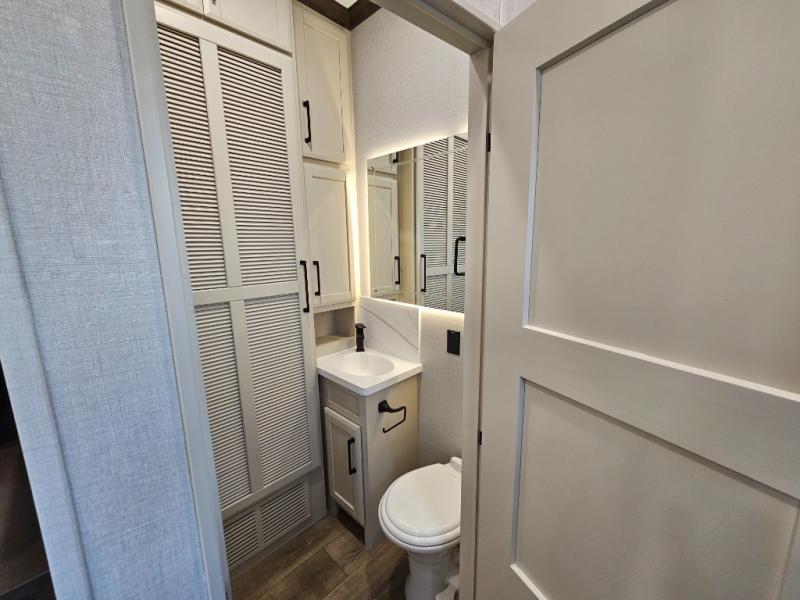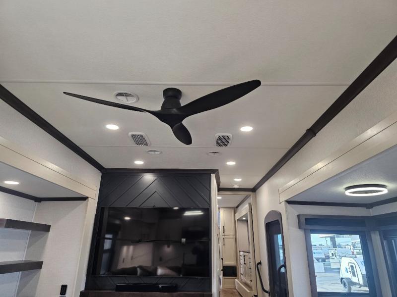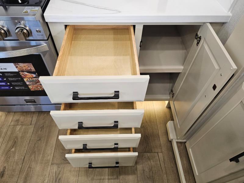 The RiverStone 43BFC isn't just another fifth wheel... it's a residential retreat designed for travelers who want every journey to feel like home. This impressive floor has a designated high-end kitchen space with tons of room, a large pantry, ample counter space and a lovely french door refrigerator will make for unforgettable meals on the go. You can also enjoy a great time with your partner and enjoy all the free time you want at the large sectional sofa you'll never want to leave! After enjoying the living room you will be fascinated by the primary bedroom suite that delivers a quiet, comfortable and spacious sanctuary featuring a dresser and dedicated shoe storage to organize all your personal belongings.