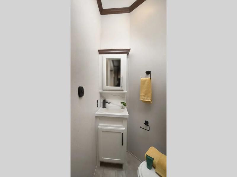 This RiverStone fifth wheel has an amazing den in the back! This area is not only an excellent lounging space with its theater sofa, hide-a-bed sofa, and entertainment center, but it is also a comfortable guest suite because it contains its own half bathroom and a drop-down queen bed. Each section of this unit has opposing slides, so you'll have plenty of living space, and the kitchen area has a pull-out dinette so that you can sit down with hot meals each night. You have a large pantry for snacks and an 18-cubic foot French door refrigerator with ice maker for cold beverages. The ceiling fan allows you to cool off the interior without overworking the AC, and the central vacuum system will help you clean up messes.