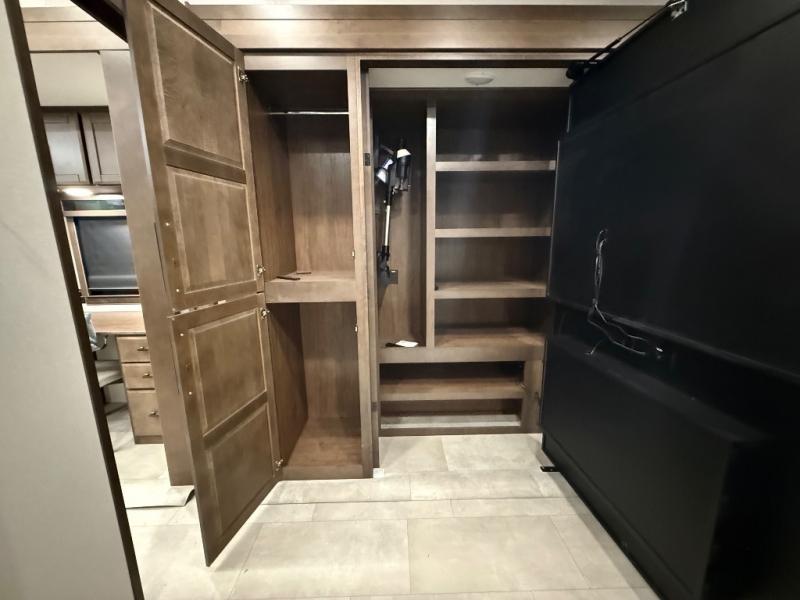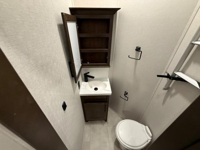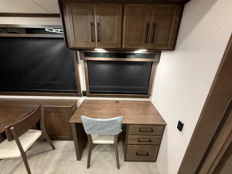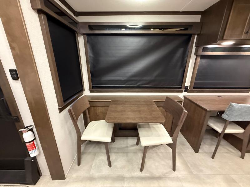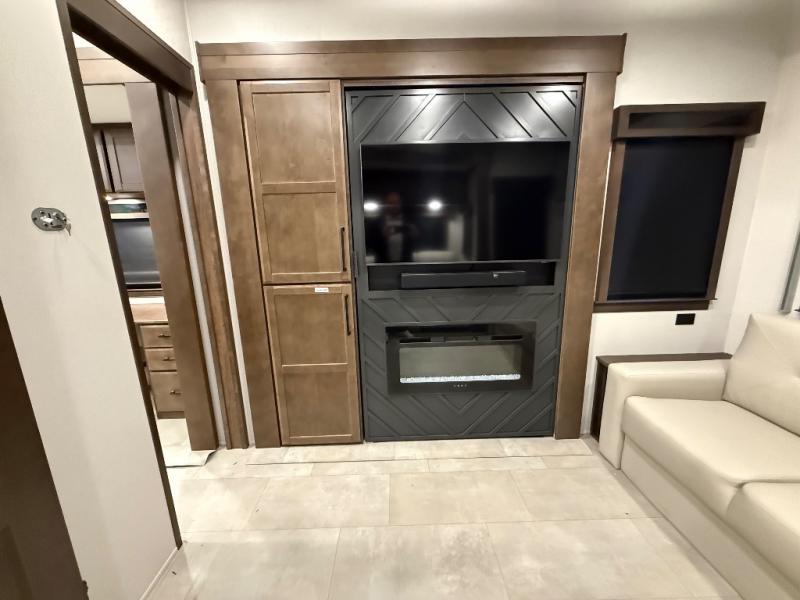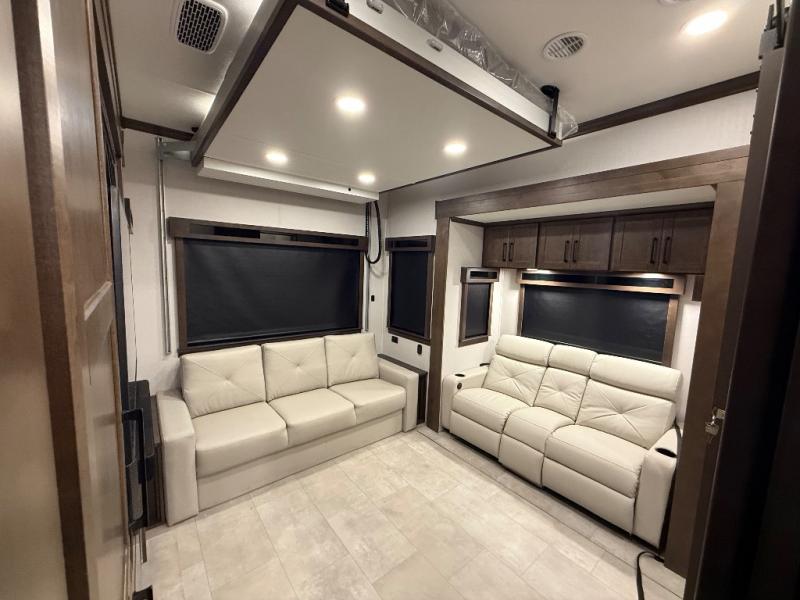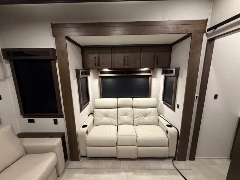 This RiverStone fifth wheel has an amazing den in the back! This area is not only an excellent lounging space with its theater sofa, hide-a-bed sofa, and entertainment center, but it is also a comfortable guest suite because it contains its own half bathroom and a drop-down queen bed. Each section of this unit has opposing slides, so you'll have plenty of living space, and the kitchen area has a pull-out dinette so that you can sit down with hot meals each night. You have a large pantry for snacks and an 18-cubic foot French door refrigerator with ice maker for cold beverages. The ceiling fan allows you to cool off the interior without overworking the AC, and the cordless vacuum will help you clean up messes.