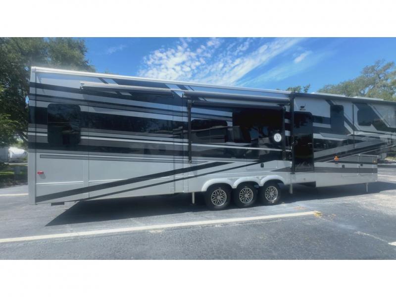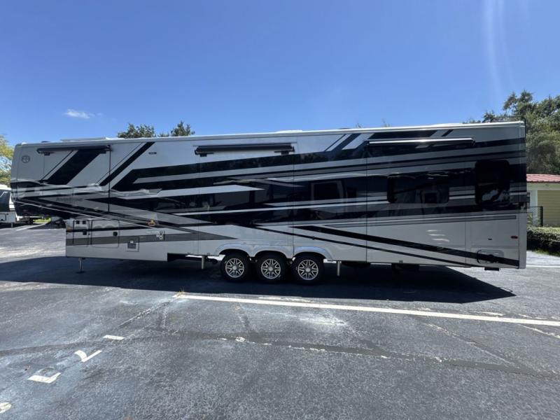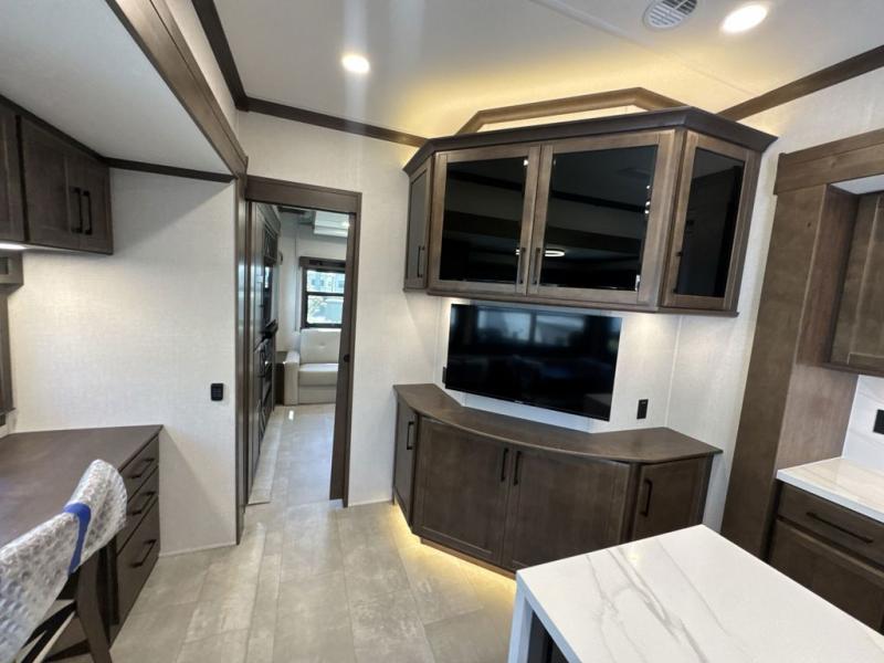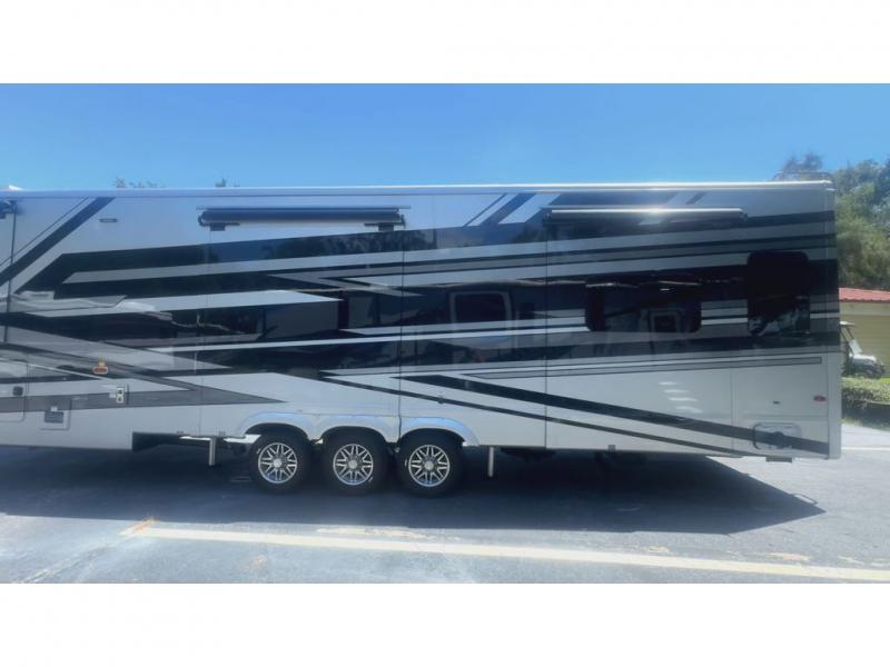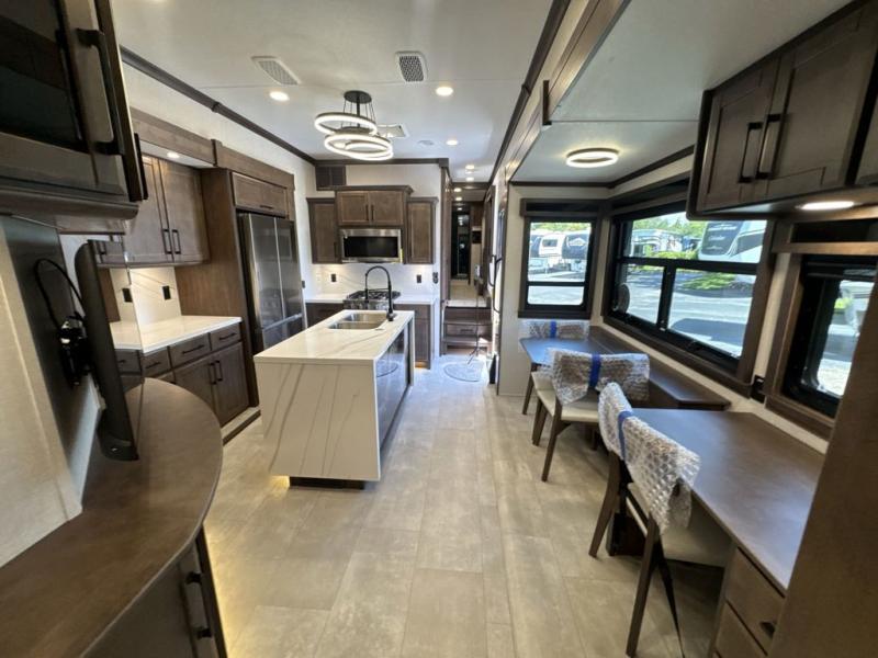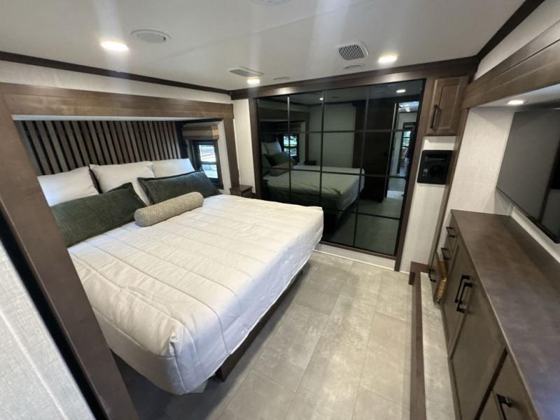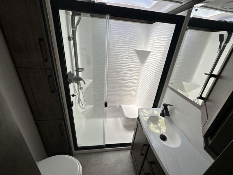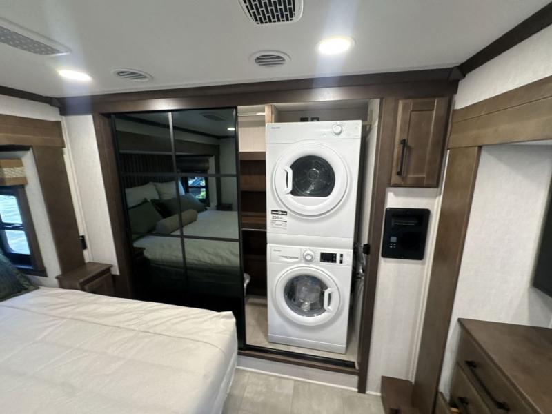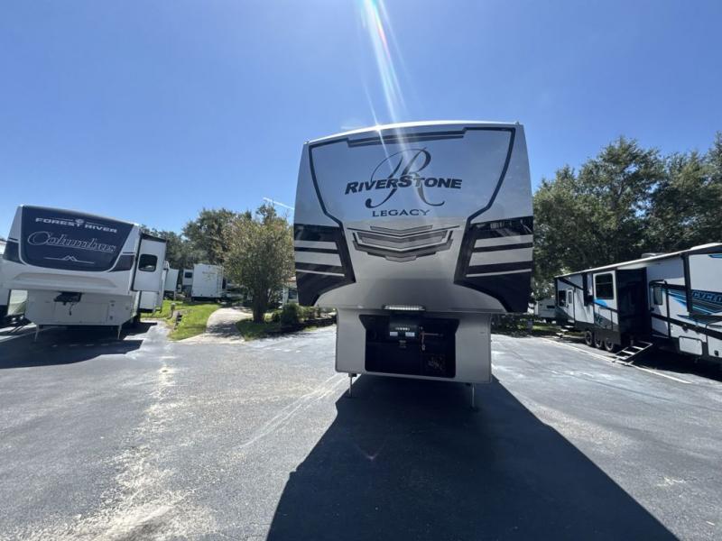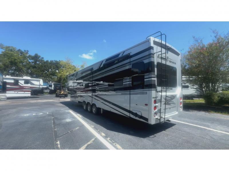 The Forest River RiverStone fifth wheels and toy haulers are luxurious units that have it all! You'll find an automatic six-point hydraulic level-up system to keep your unit in place, and there is preparation for a four-camera observation system. The TravlFi Journey XTR 4G/LTE router and WiFi extender will help you stay connected to the outside world, and you'll never have to overpack again since the Splendid “Astral” stackable washer and dryer will let you clean the small amount of clothes you've brought with you. Another high luxury is the Fischer Paykal dishwasher which will allow you to spend more time enjoying your camp life and less time cleaning up. Each unit is built with a LCI Road Armour suspension system, dual-pane frameless windows, a full docking station, a 200W solar panel, and a BMPro touch control system.