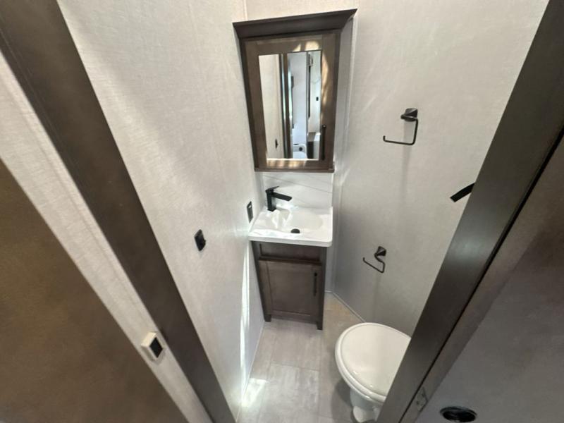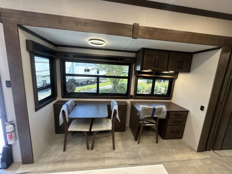 This RiverStone fifth wheel has an amazing den in the back! This area is not only an excellent lounging space with its theater sofa, hide-a-bed sofa, and entertainment center, but it is also a comfortable guest suite because it contains its own half bathroom and a drop-down queen bed. Each section of this unit has opposing slides, so you'll have plenty of living space, and the kitchen area has a pull-out dinette so that you can sit down with hot meals each night. You have a large pantry for snacks and an 18-cubic foot French door refrigerator with ice maker for cold beverages. The ceiling fan allows you to cool off the interior without overworking the AC, and the cordless vacuum will help you clean up messes.