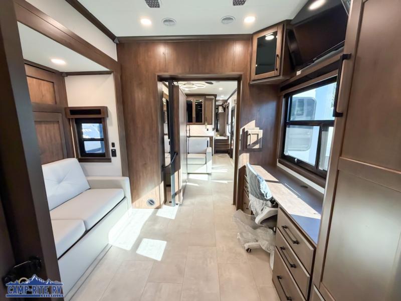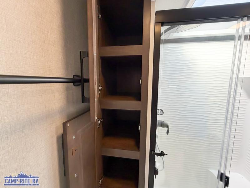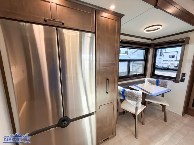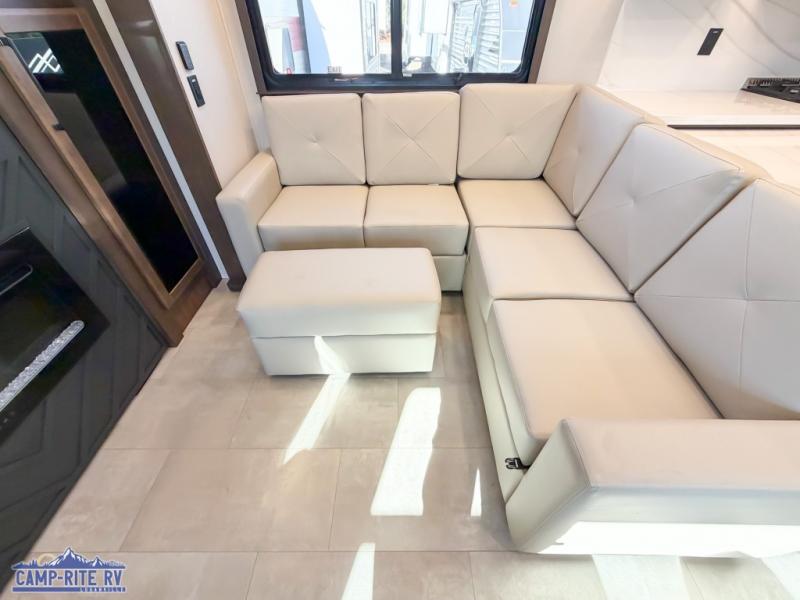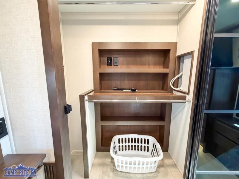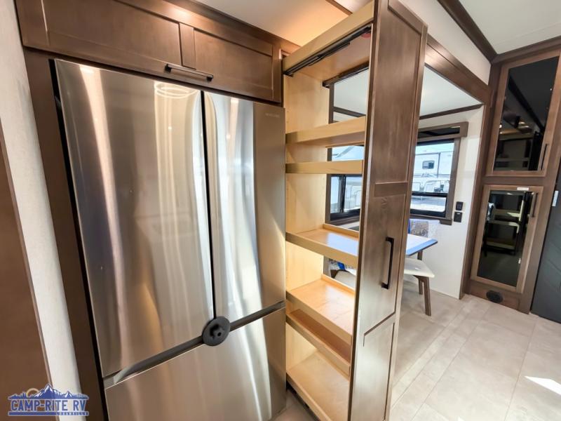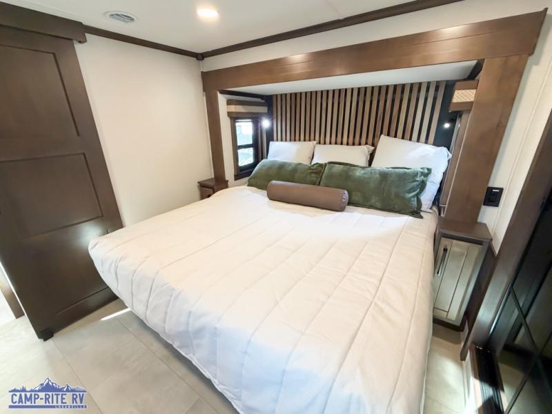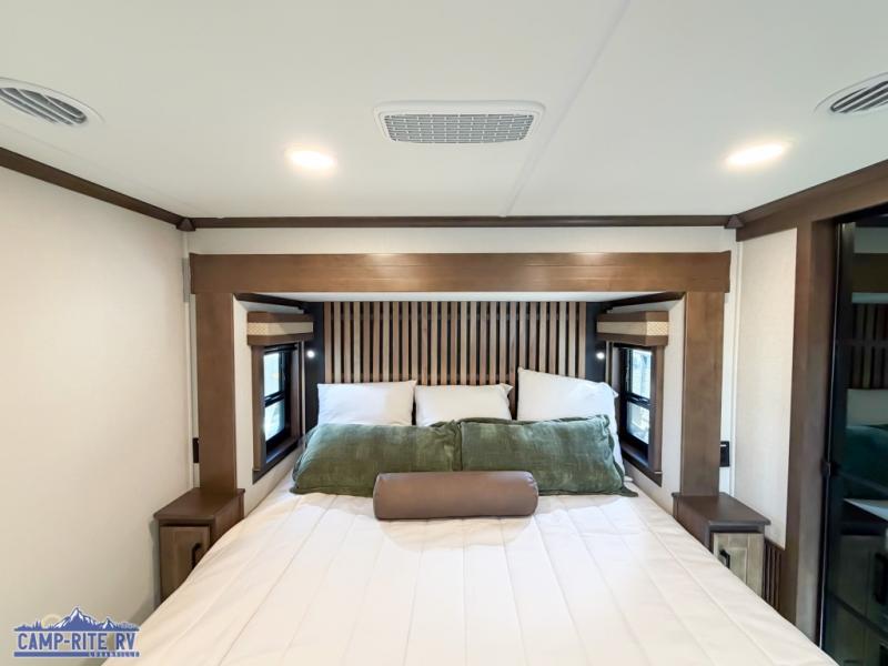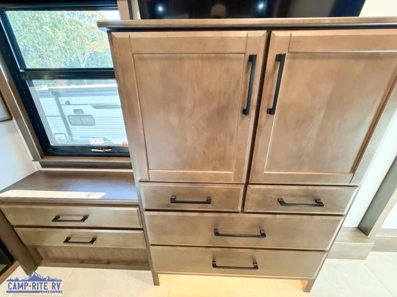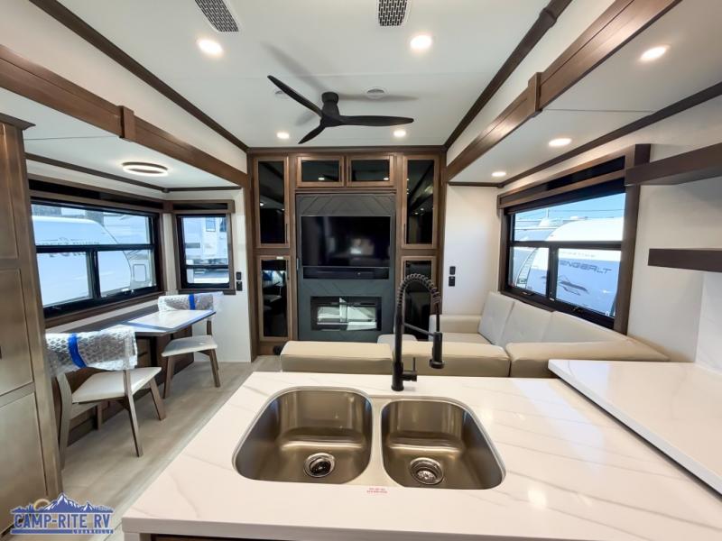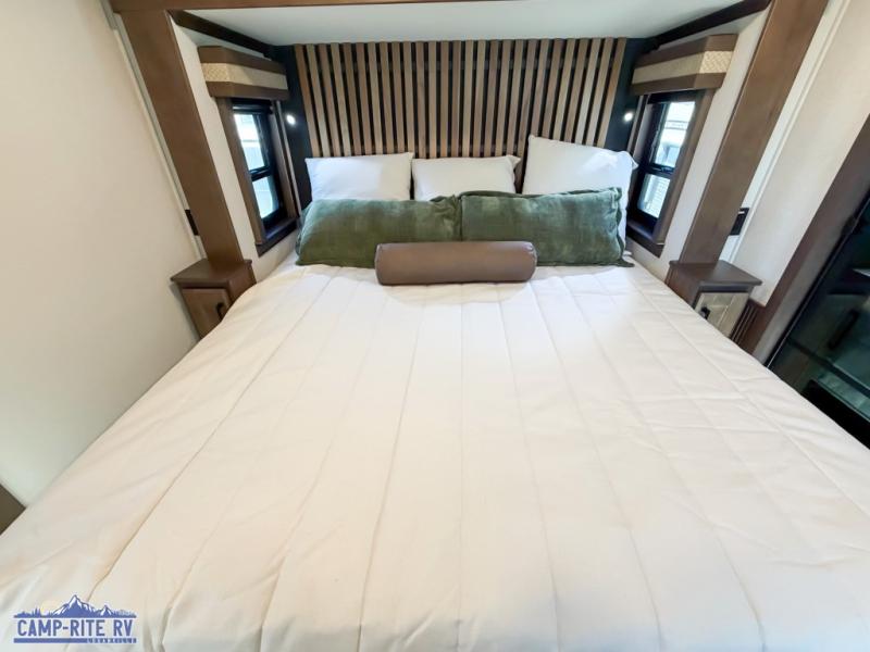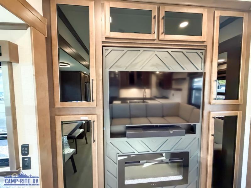This is the perfect fifth wheel to travel with friends since there are two private bedrooms, one of which is a rear master with a full bath and its own exterior entry door. There is also a Murphy sofa here for your guests to sleep on, along with a wardrobe for their clothes and overhead storage. Head to the front private bedroom where you'll find a king bed slide, a dresser and a bench, a front wardrobe, plus a washer and dryer to make life at the campground easier than ever. The middle of this unit features the kitchen and living area. There is plenty of counter space plus a hutch and pantry for added storage. A sectional sofa provides tons of comfort, especially since its in perfect view of the fireplace and swinging entertainment center. There is also a dinette with four chairs where you can dine together and play a game of cards in the evening!