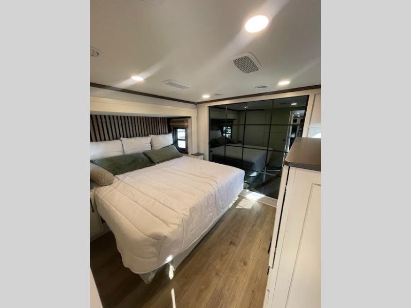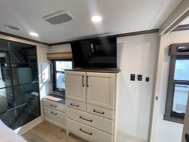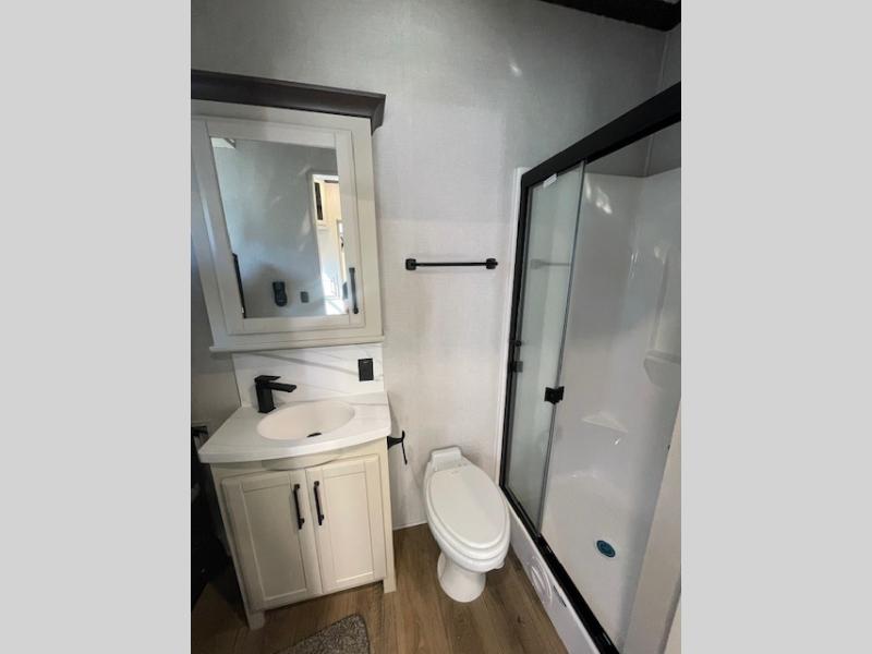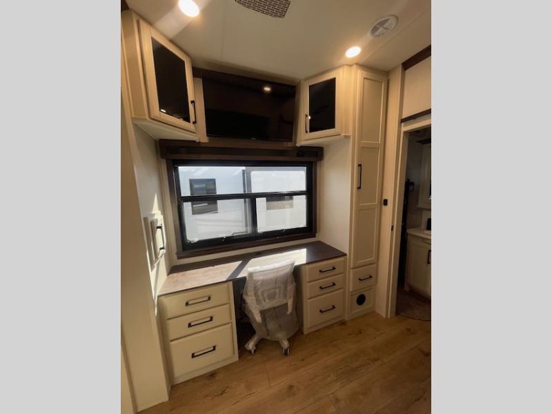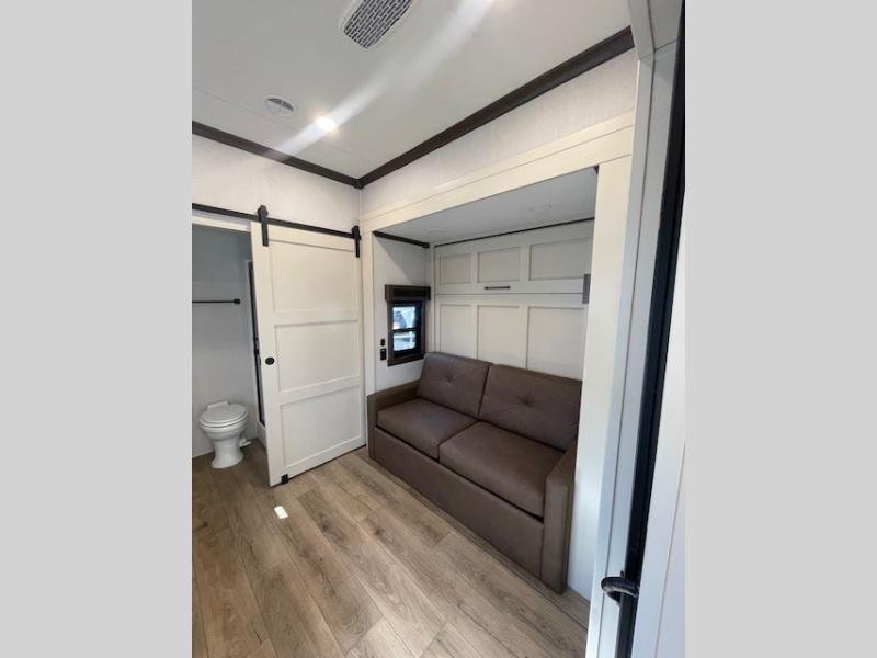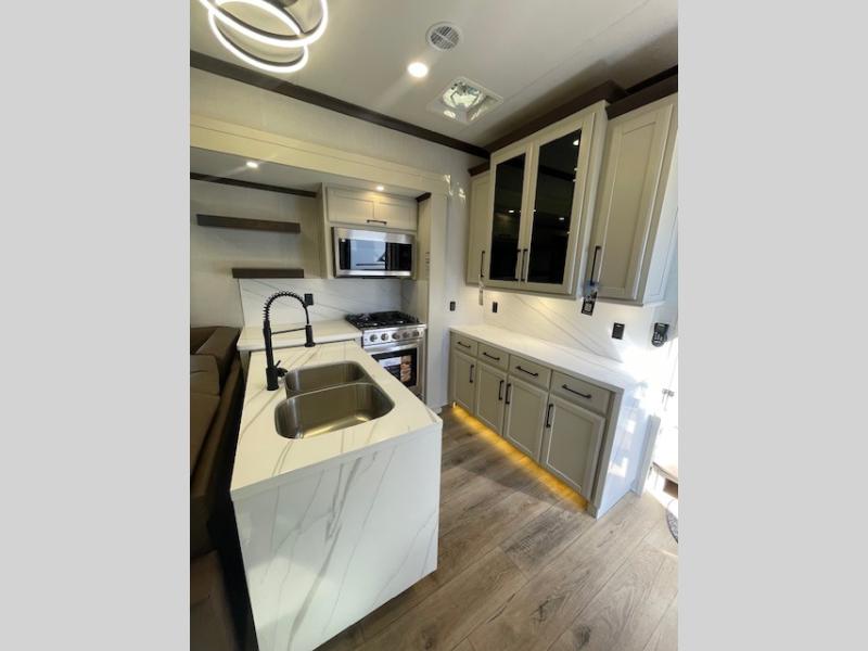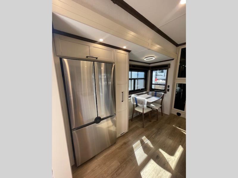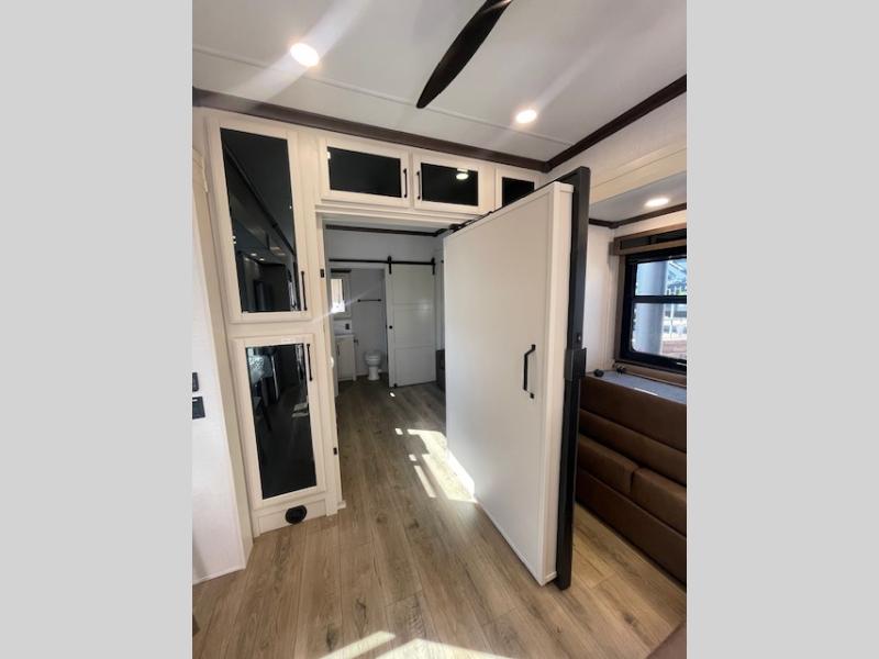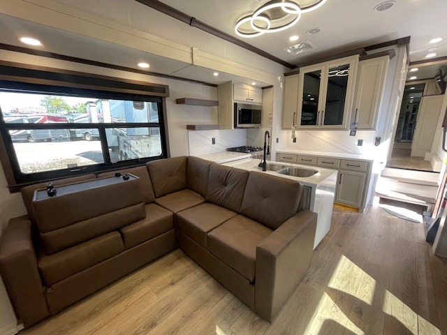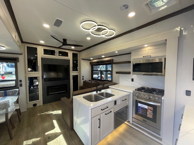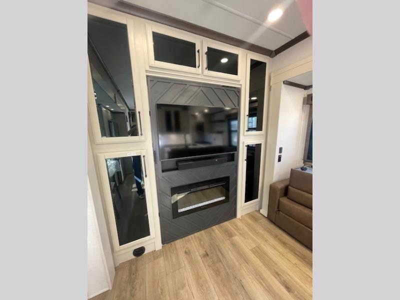 This is the perfect fifth wheel to travel with friends since there are two private bedrooms, one of which is a rear master with a full bath and its own exterior entry door. There is also a Murphy sofa here for your guests to sleep on, along with a wardrobe for their clothes and overhead storage. Head to the front private bedroom where you'll find a king bed slide, a dresser and a bench, a front wardrobe, plus a washer and dryer to make life at the campground easier than ever. The middle of this unit features the kitchen and living area. There is plenty of counter space plus a hutch and pantry for added storage. A sectional sofa provides tons of comfort, especially since its in perfect view of the fireplace and swinging entertainment center. There is also a dinette with four chairs where you can dine together and play a game of cards in the evening!