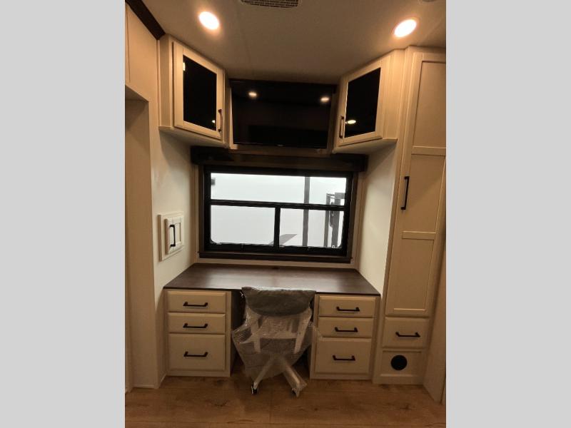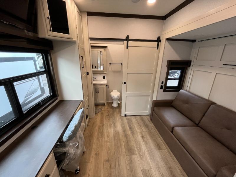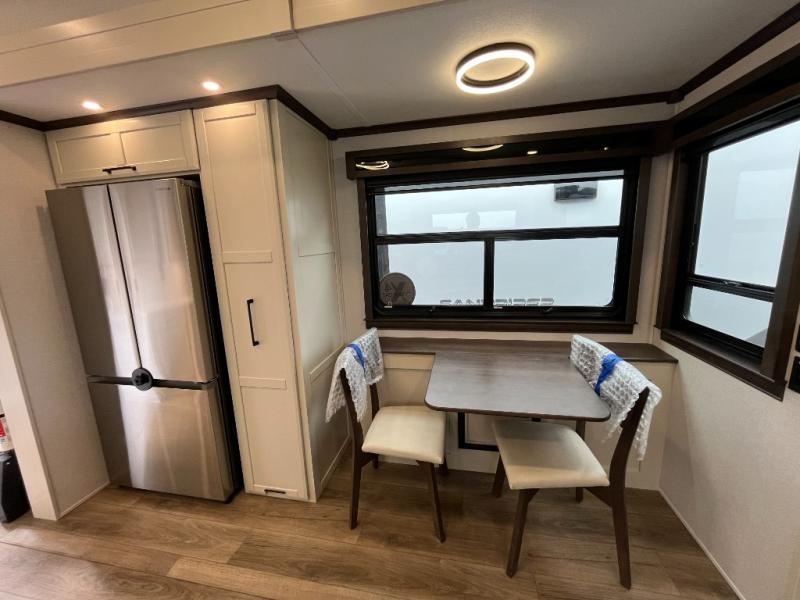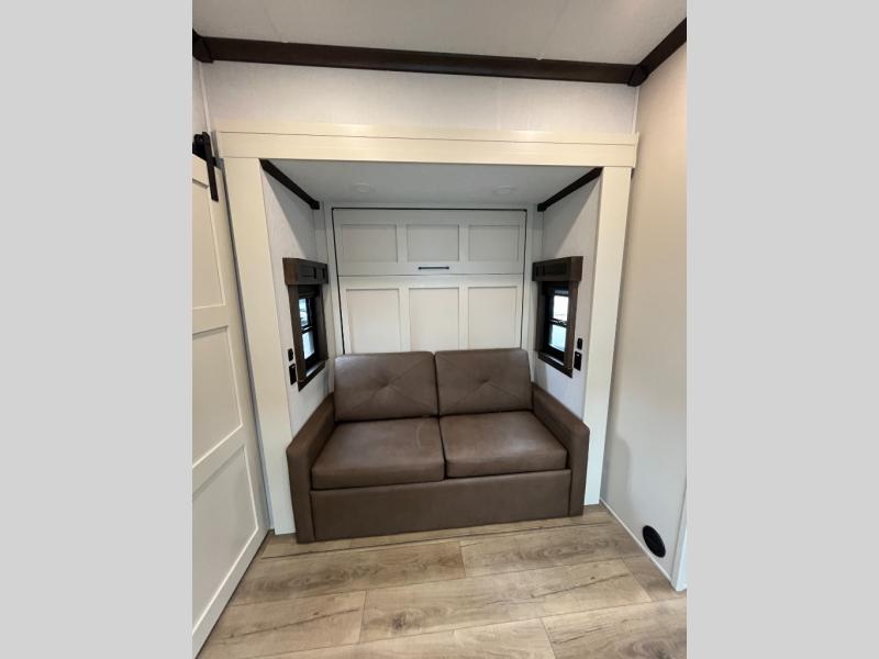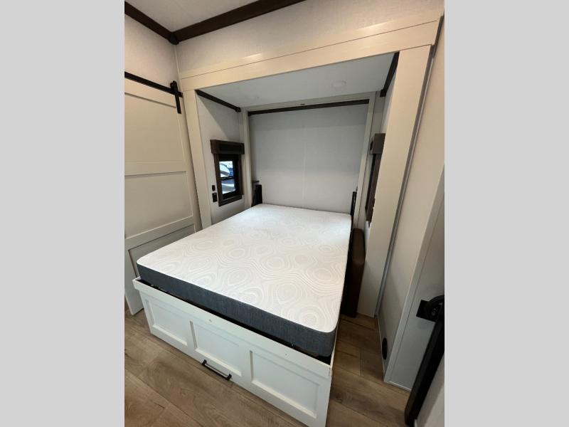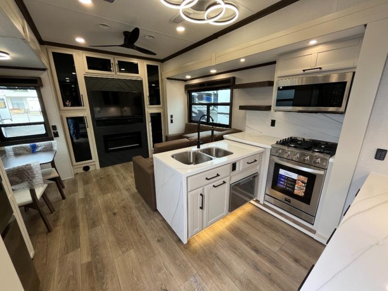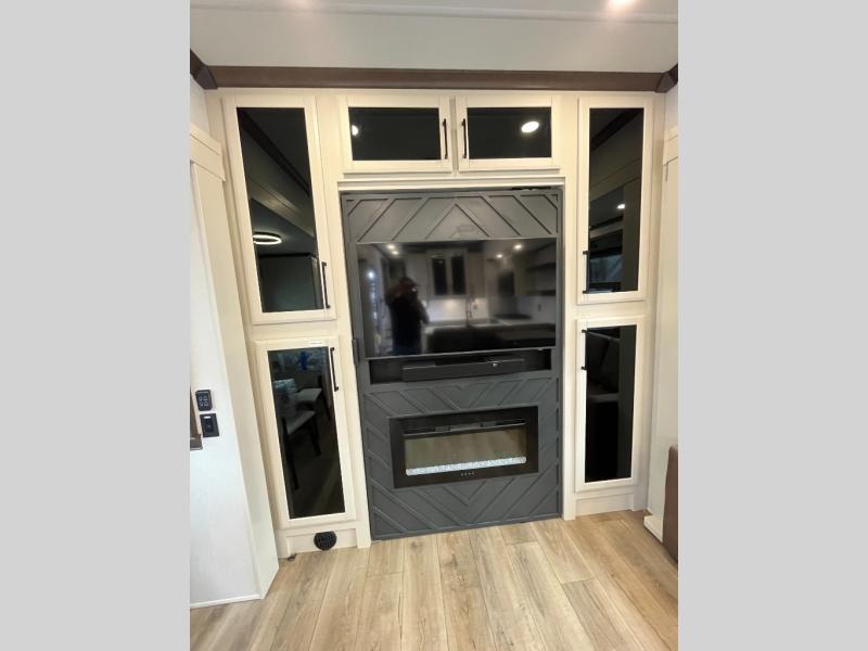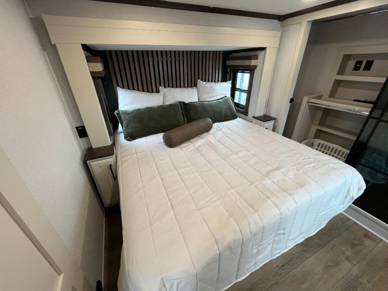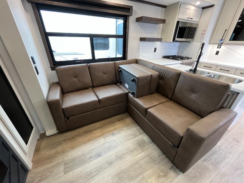 This is the perfect fifth wheel to travel with friends since there are two private bedrooms, one of which is a rear master with a full bath and its own exterior entry door. There is also a Murphy sofa here for your guests to sleep on, along with a wardrobe for their clothes and overhead storage. Head to the front private bedroom where you'll find a king bed slide, a dresser and a bench, a front wardrobe, plus a washer and dryer to make life at the campground easier than ever. The middle of this unit features the kitchen and living area. There is plenty of counter space plus a hutch and pantry for added storage. A sectional sofa provides tons of comfort, especially since its in perfect view of the fireplace and swinging entertainment center. There is also a dinette with four chairs where you can dine together and play a game of cards in the evening!