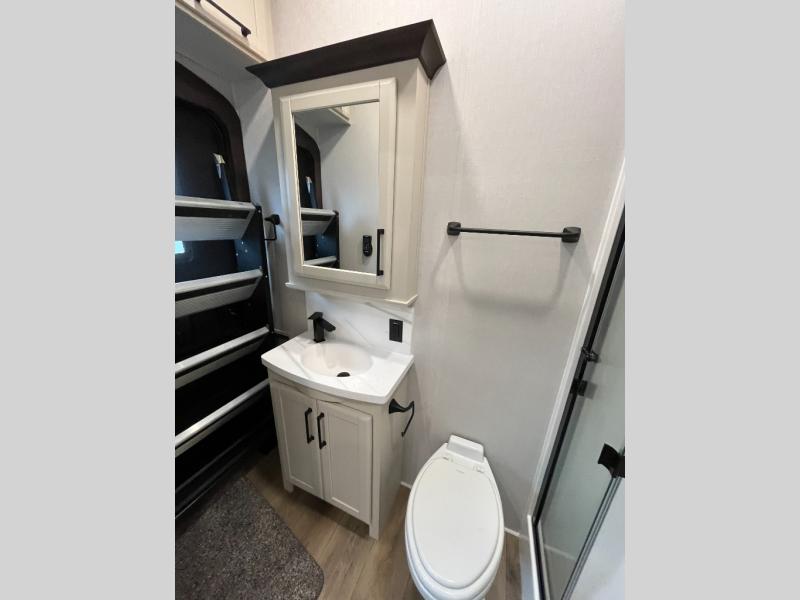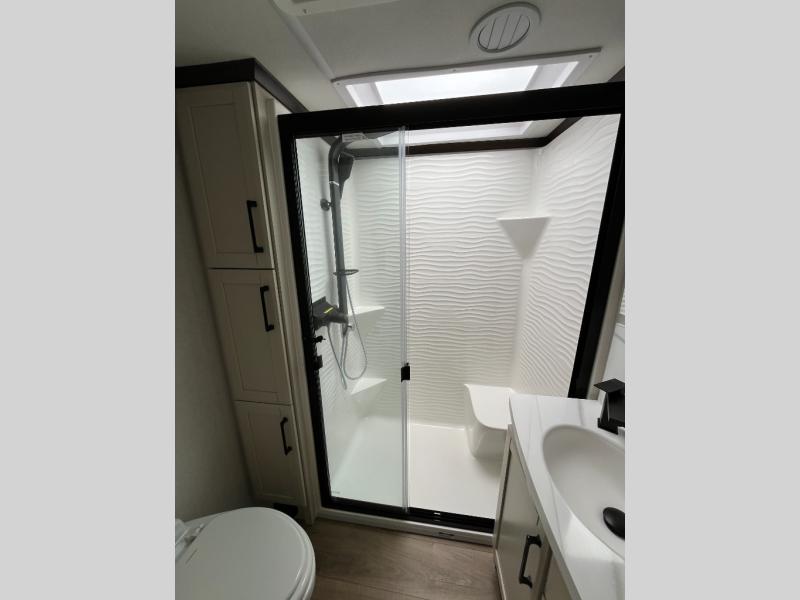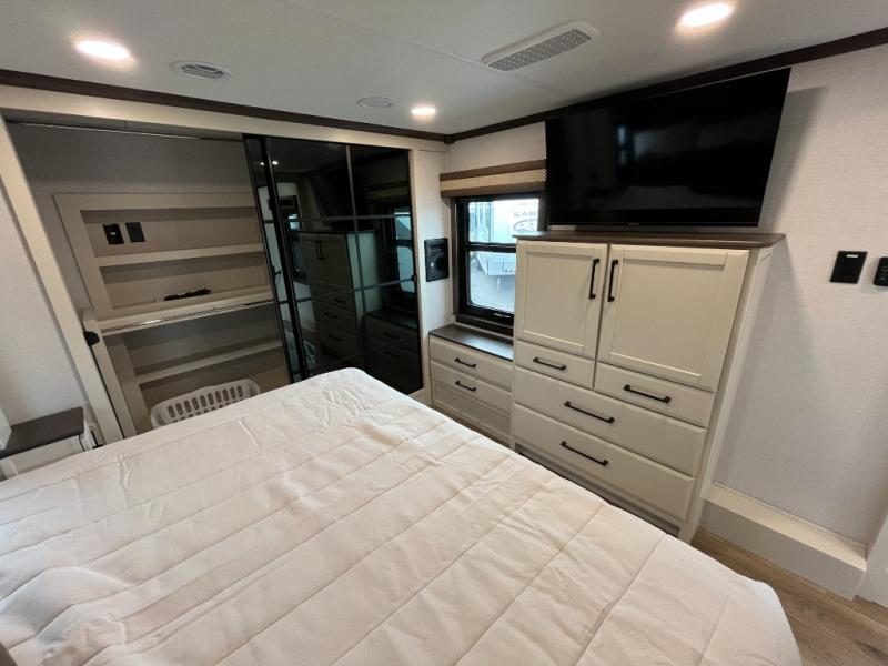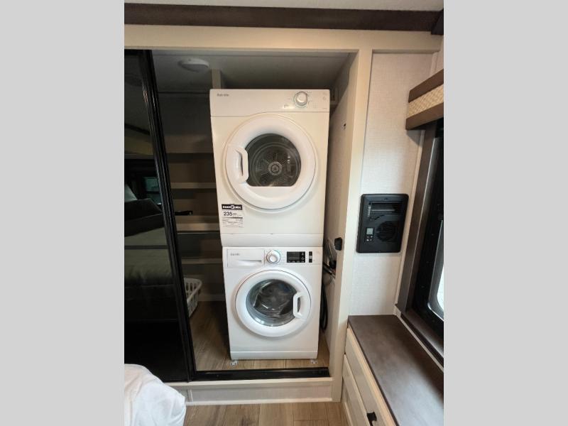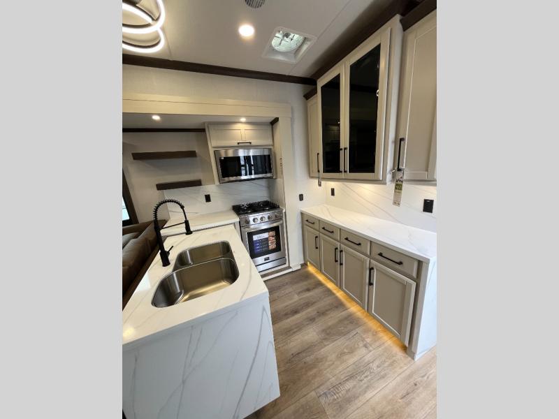 The Forest River RiverStone fifth wheels and toy haulers are luxurious units that have it all! You'll find an automatic six-point hydraulic level-up system to keep your unit in place, and there is preparation for a four-camera observation system. The TravlFi Journey XTR 4G/LTE router and WiFi extender will help you stay connected to the outside world, and you'll never have to overpack again since the Splendid “Astral” stackable washer and dryer will let you clean the small amount of clothes you've brought with you. Another high luxury is the Fischer Paykal dishwasher which will allow you to spend more time enjoying your camp life and less time cleaning up. Each unit is built with an LCI Road Armour suspension system, dual-pane frameless windows, a full docking station, a 200W solar panel, and a BMPro touch control system.