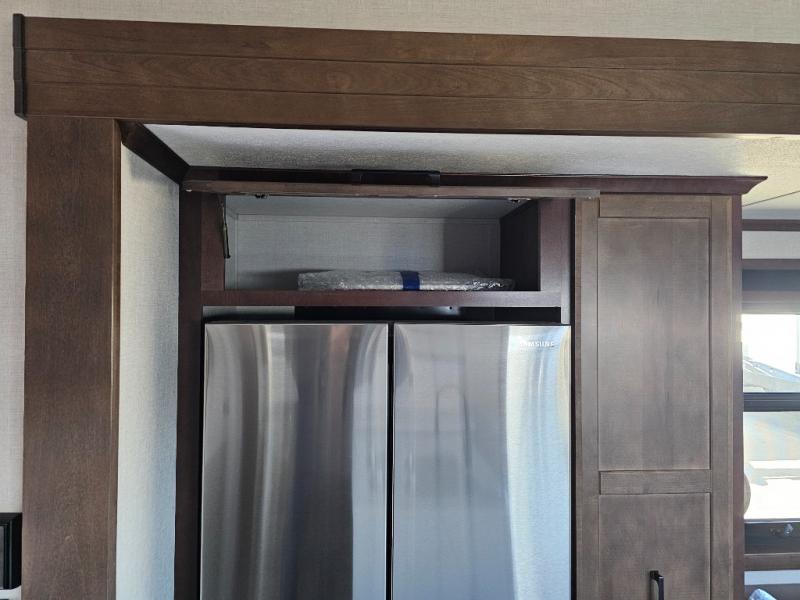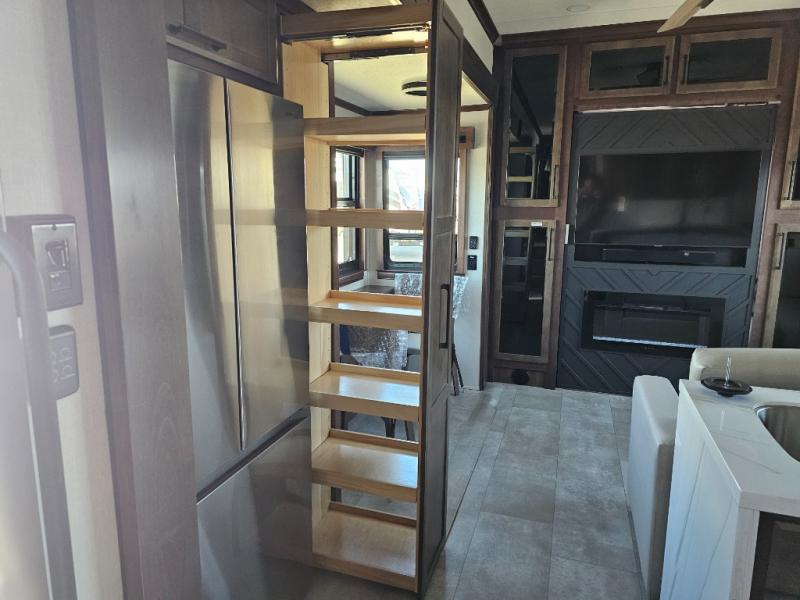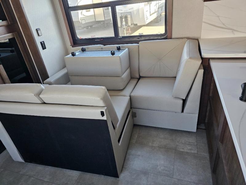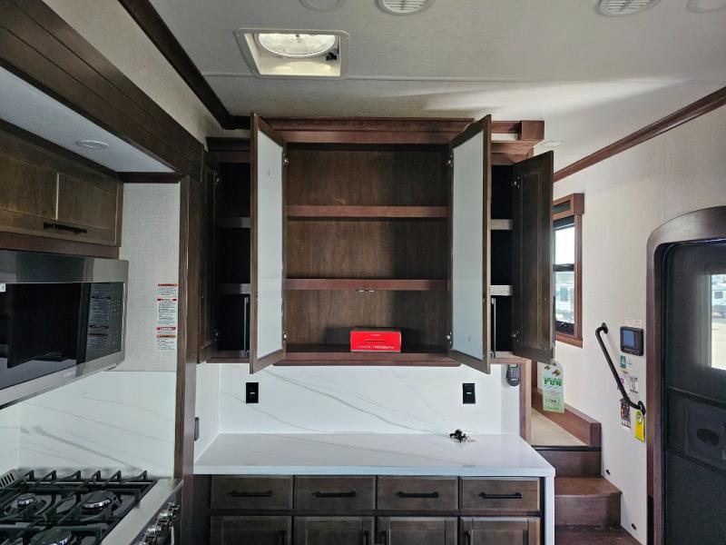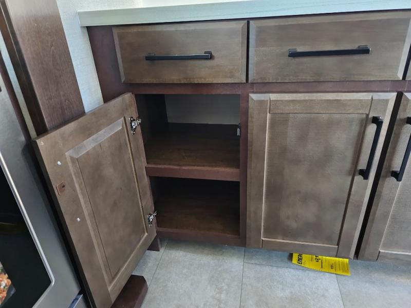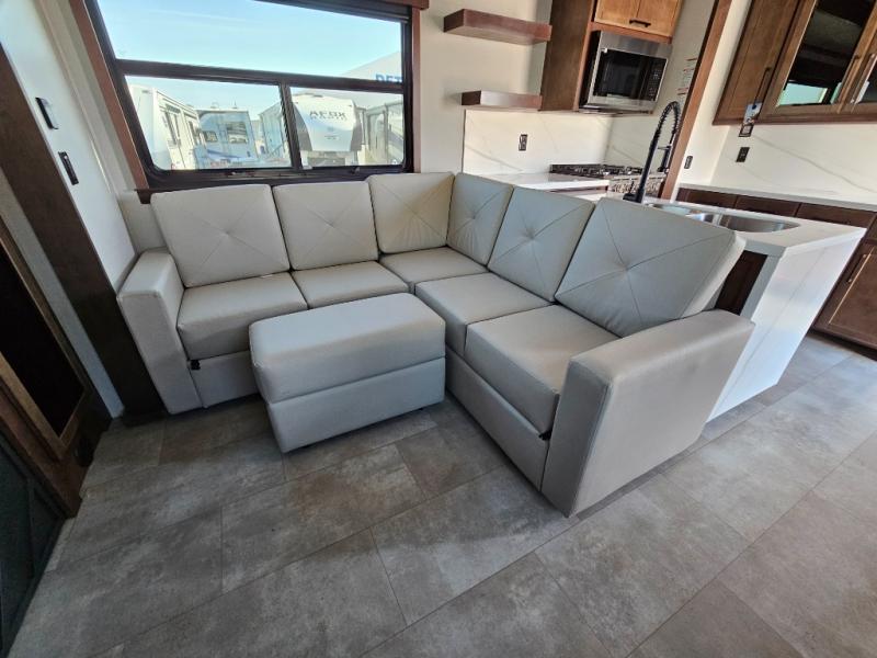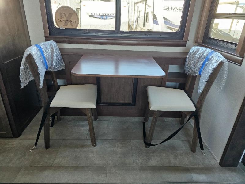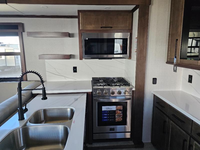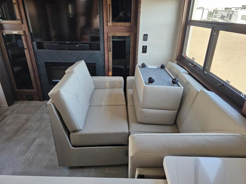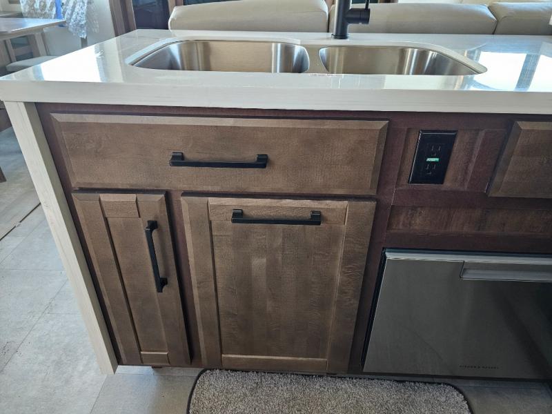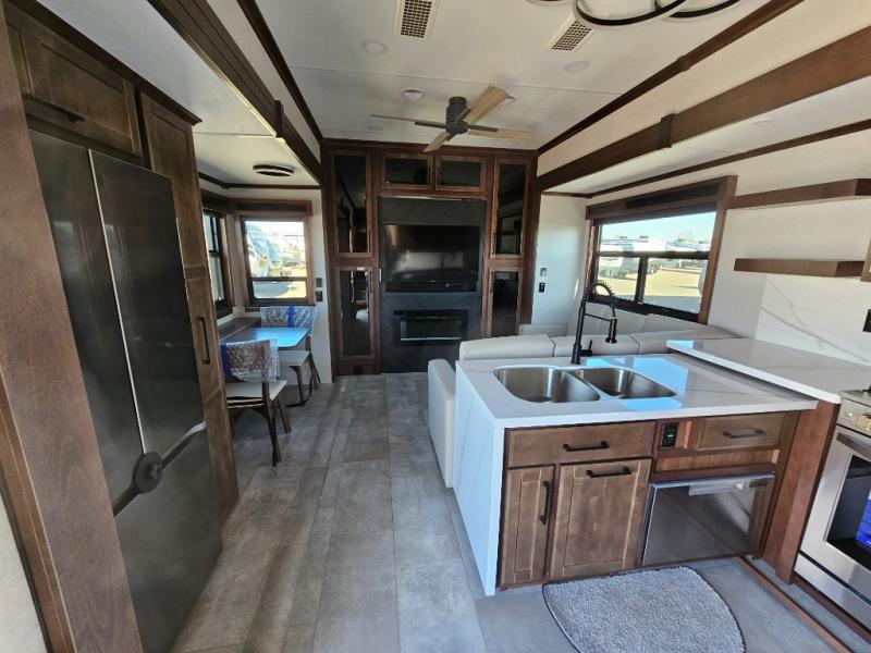 This is the perfect fifth wheel to travel with friends since there are two private bedrooms, one of which is a rear master with a full bath and its own exterior entry door. There is also a Murphy sofa here for your guests to sleep on, along with a wardrobe for their clothes and overhead storage. Head to the front private bedroom where you'll find a king bed slide, a dresser and a bench, a front wardrobe, plus a washer and dryer to make life at the campground easier than ever. The middle of this unit features the kitchen and living area. There is plenty of counter space plus a hutch and pantry for added storage. A sectional sofa provides tons of comfort, especially since its in perfect view of the fireplace and swinging entertainment center. There is also a dinette with four chairs where you can dine together and play a game of cards in the evening!