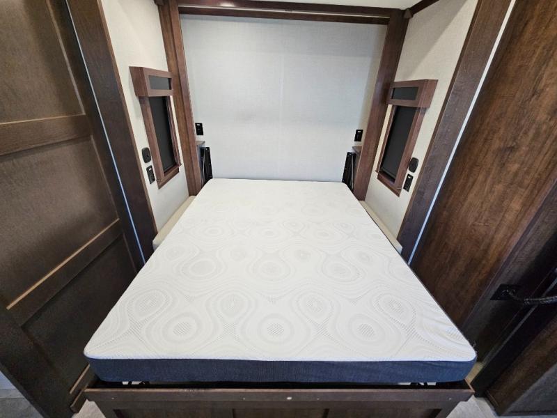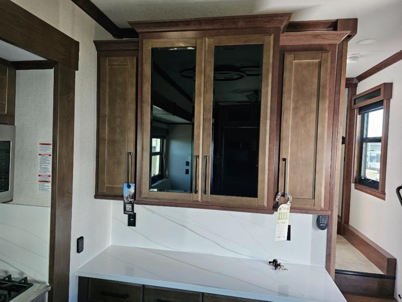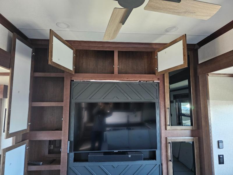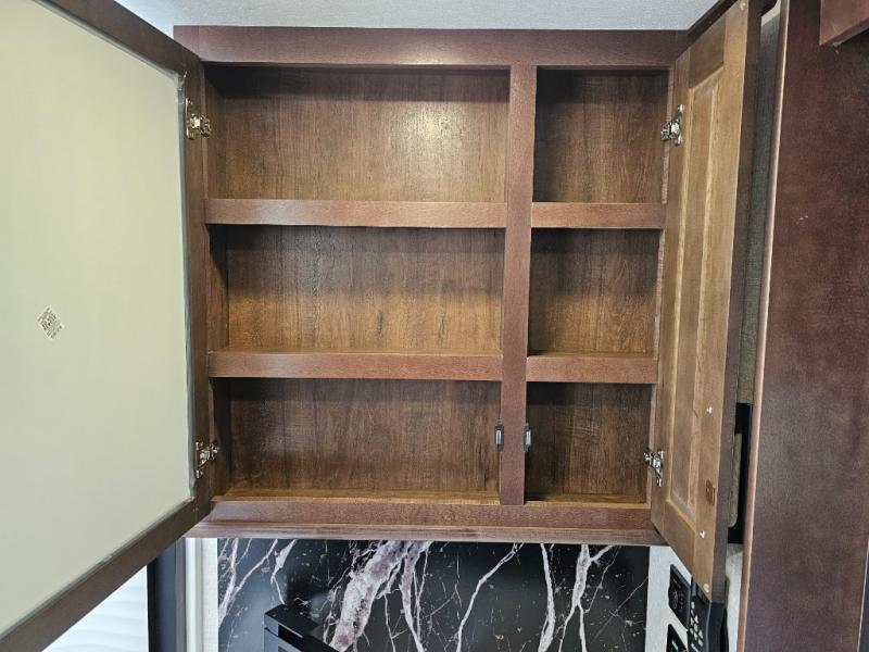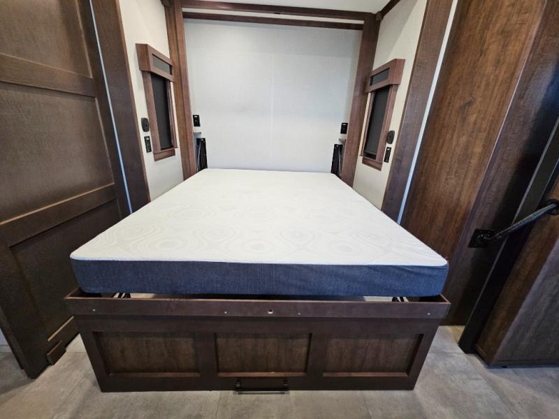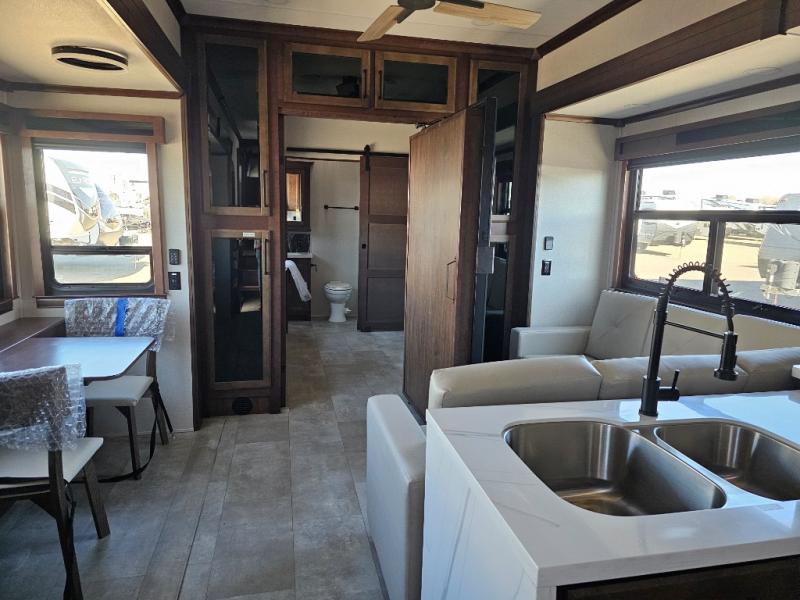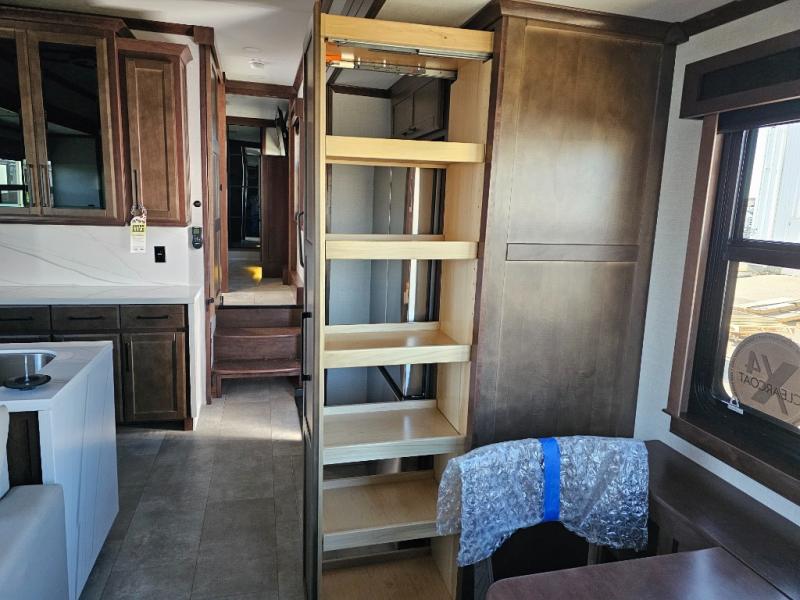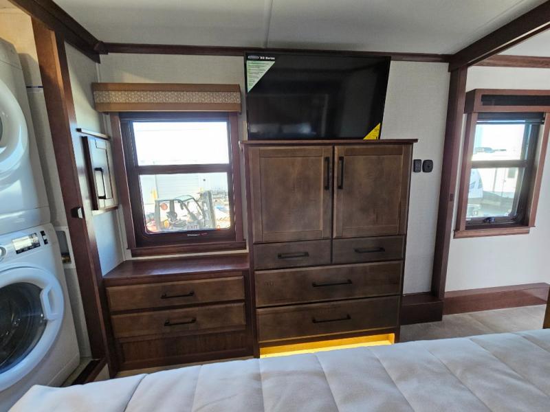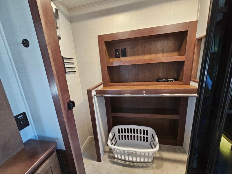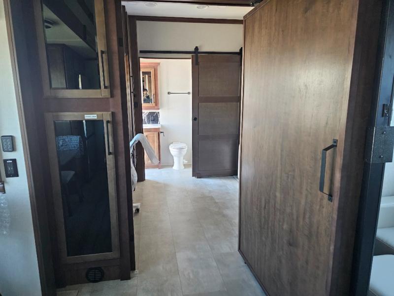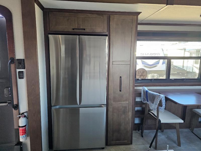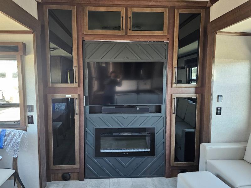 This is the perfect fifth wheel to travel with friends since there are two private bedrooms, one of which is a rear master with a full bath and its own exterior entry door. There is also a Murphy sofa here for your guests to sleep on, along with a wardrobe for their clothes and overhead storage. Head to the front private bedroom where you'll find a king bed slide, a dresser and a bench, a front wardrobe, plus a washer and dryer to make life at the campground easier than ever. The middle of this unit features the kitchen and living area. There is plenty of counter space plus a hutch and pantry for added storage. A sectional sofa provides tons of comfort, especially since its in perfect view of the fireplace and swinging entertainment center. There is also a dinette with four chairs where you can dine together and play a game of cards in the evening!