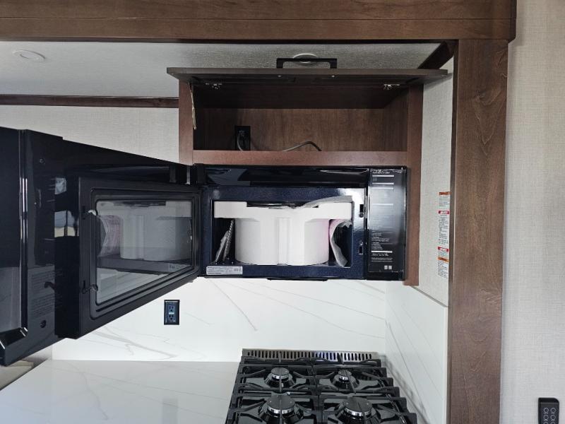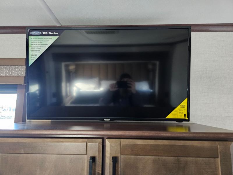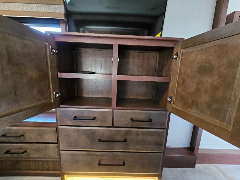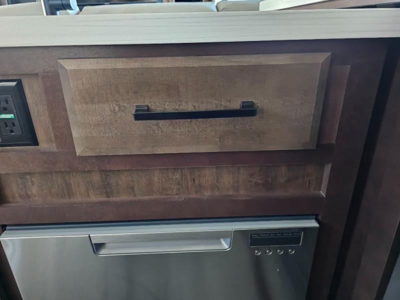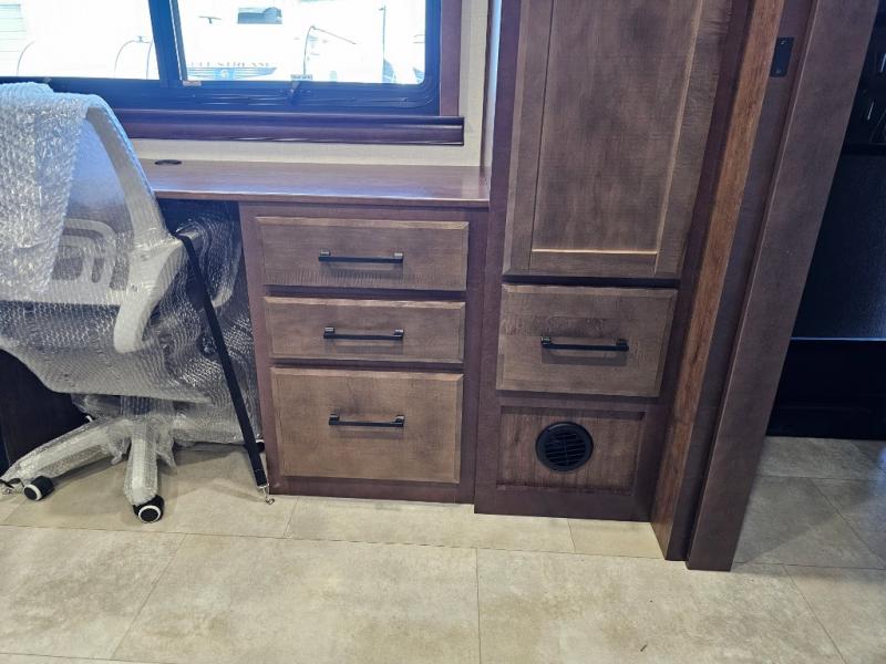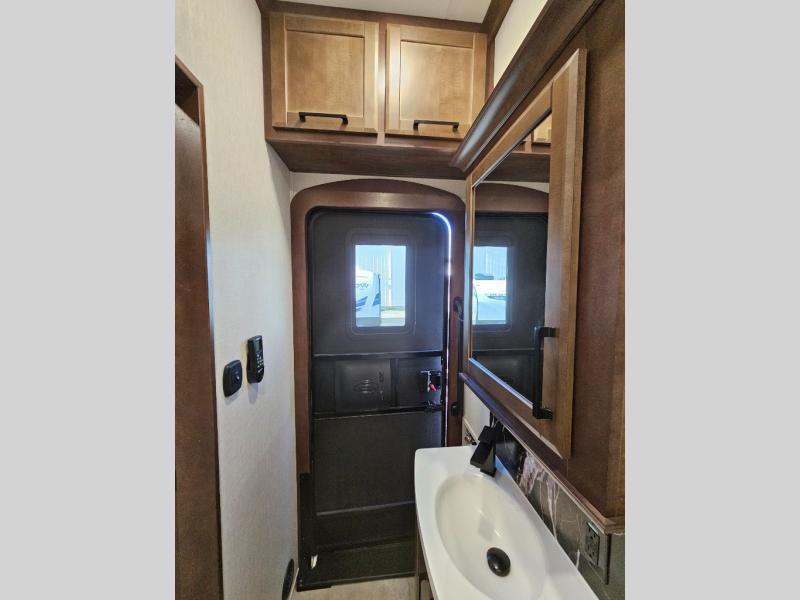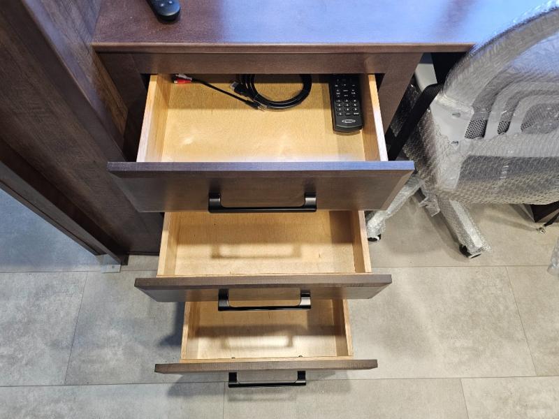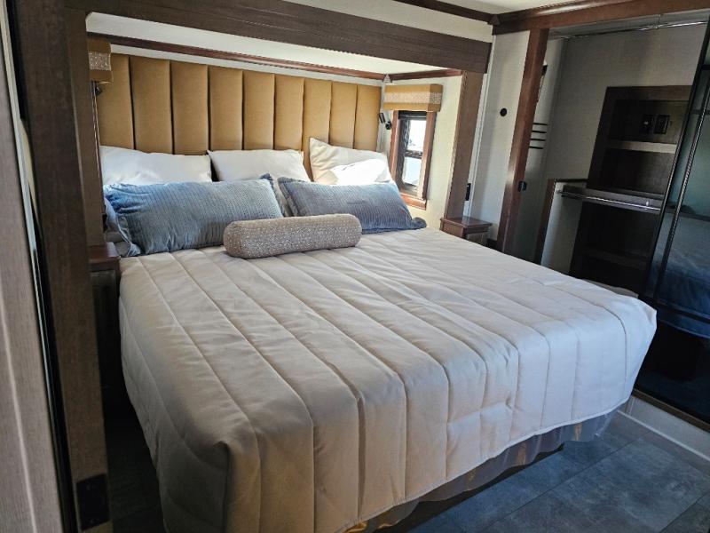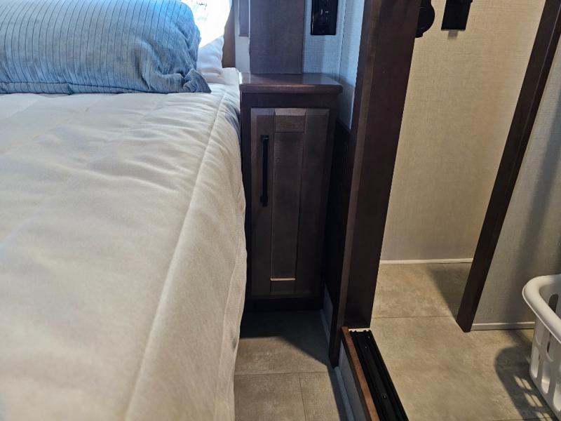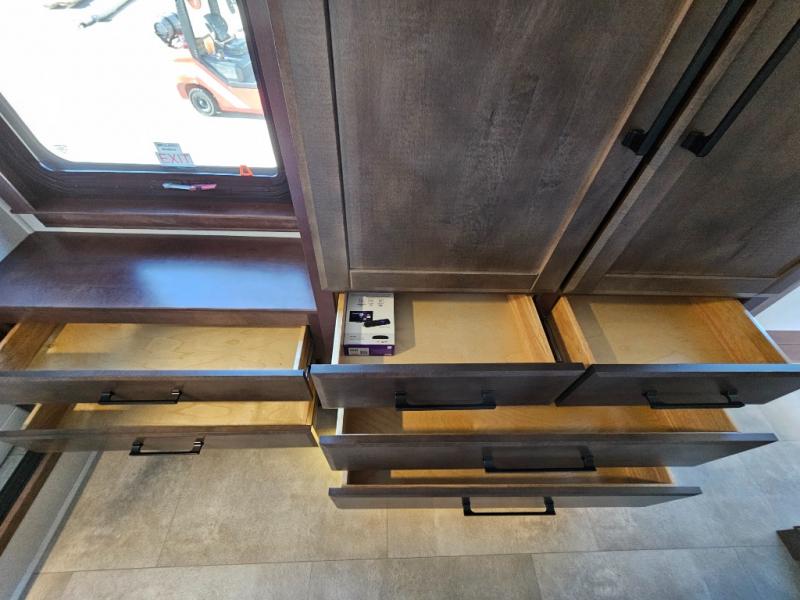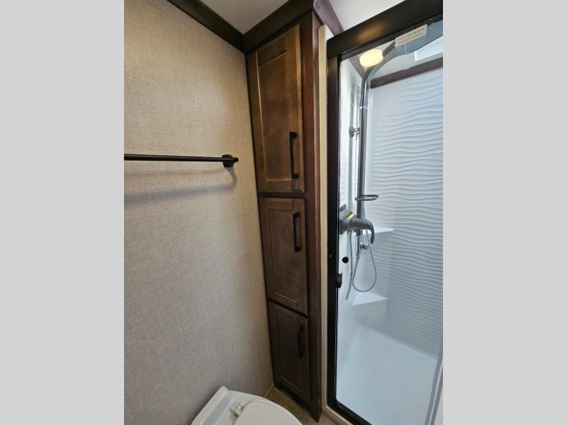 This is the perfect fifth wheel to travel with friends since there are two private bedrooms, one of which is a rear master with a full bath and its own exterior entry door. There is also a Murphy sofa here for your guests to sleep on, along with a wardrobe for their clothes and overhead storage. Head to the front private bedroom where you'll find a king bed slide, a dresser and a bench, a front wardrobe, plus a washer and dryer to make life at the campground easier than ever. The middle of this unit features the kitchen and living area. There is plenty of counter space plus a hutch and pantry for added storage. A sectional sofa provides tons of comfort, especially since its in perfect view of the fireplace and swinging entertainment center. There is also a dinette with four chairs where you can dine together and play a game of cards in the evening!