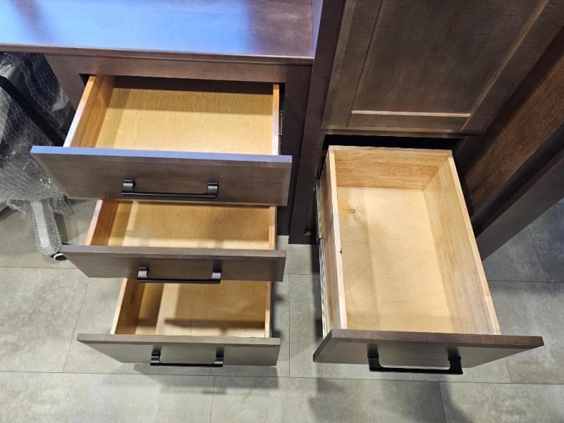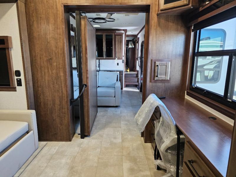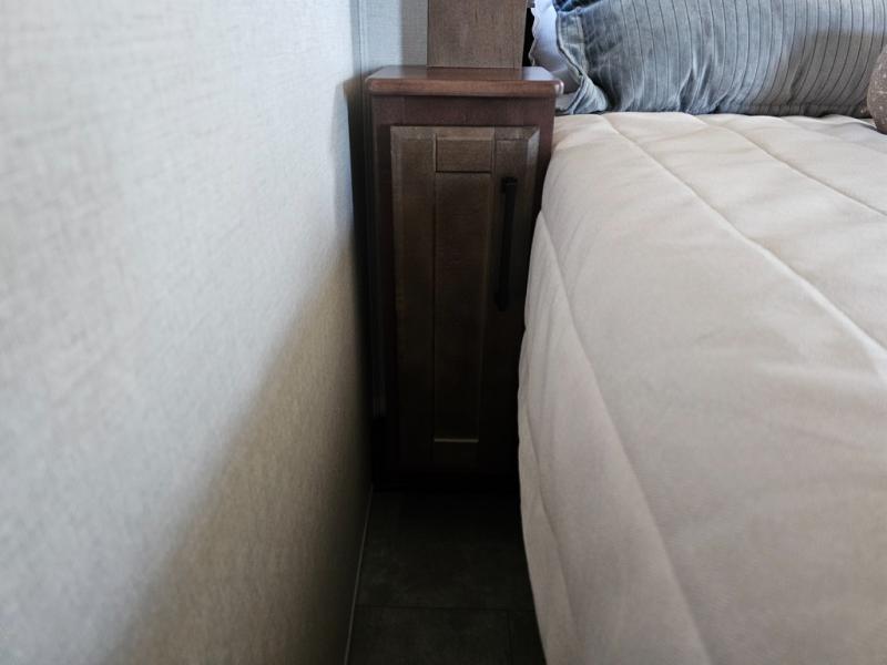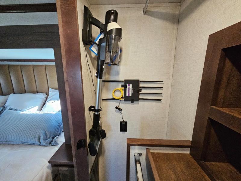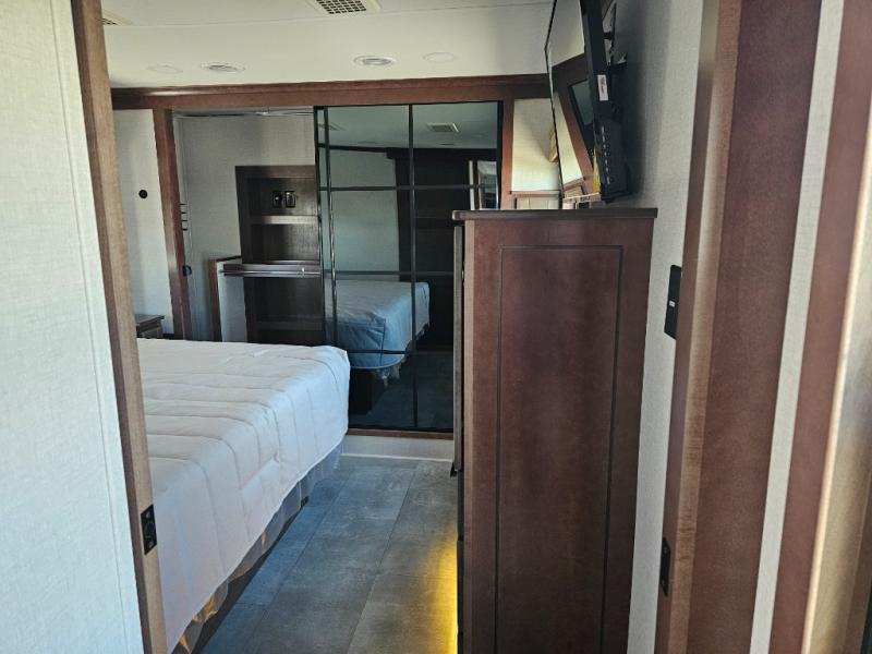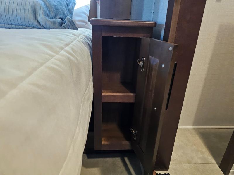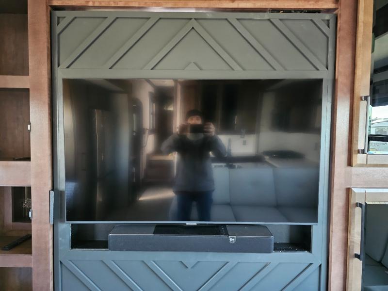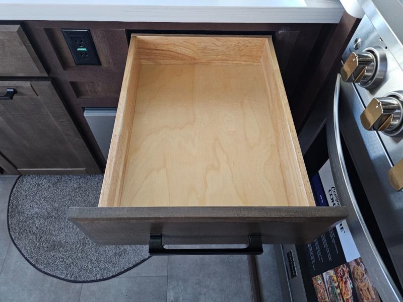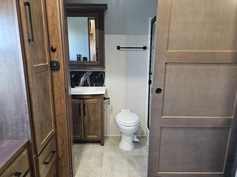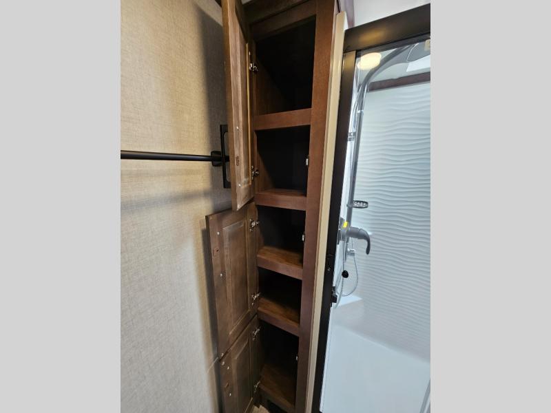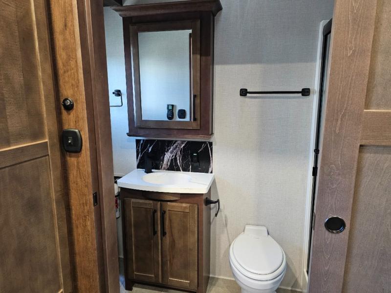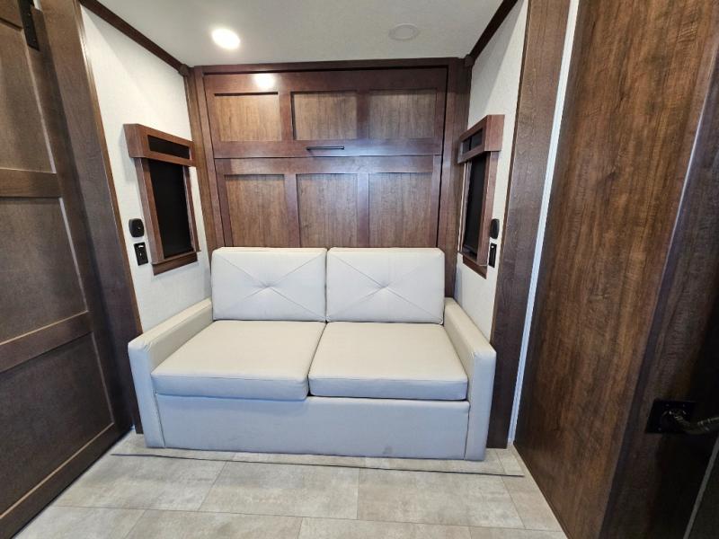 This is the perfect fifth wheel to travel with friends since there are two private bedrooms, one of which is a rear master with a full bath and its own exterior entry door. There is also a Murphy sofa here for your guests to sleep on, along with a wardrobe for their clothes and overhead storage. Head to the front private bedroom where you'll find a king bed slide, a dresser and a bench, a front wardrobe, plus a washer and dryer to make life at the campground easier than ever. The middle of this unit features the kitchen and living area. There is plenty of counter space plus a hutch and pantry for added storage. A sectional sofa provides tons of comfort, especially since its in perfect view of the fireplace and swinging entertainment center. There is also a dinette with four chairs where you can dine together and play a game of cards in the evening!