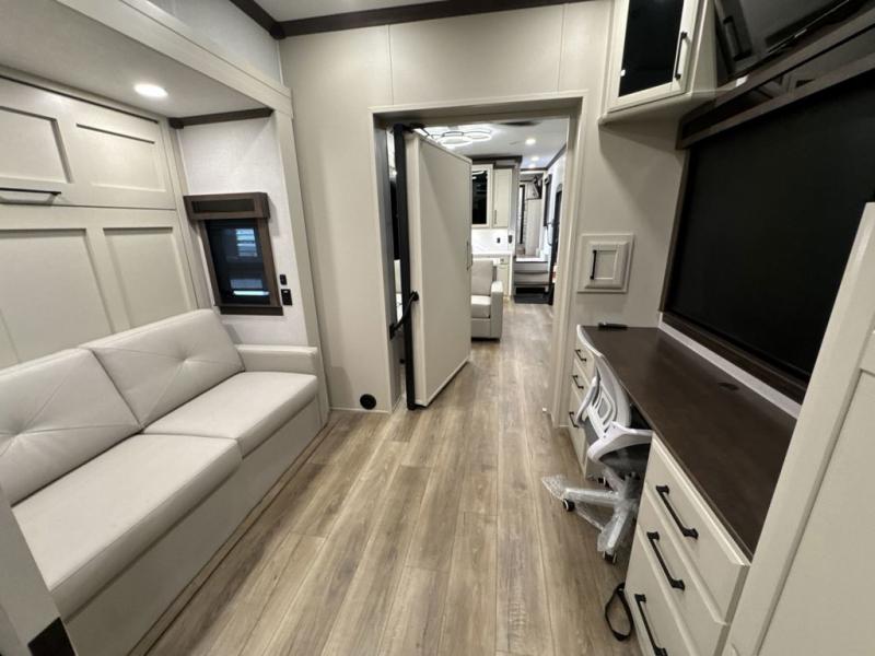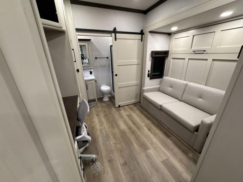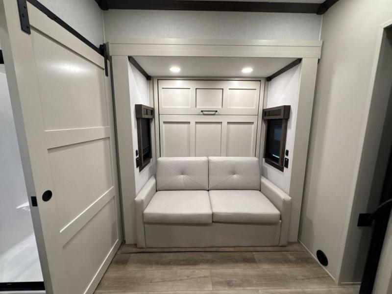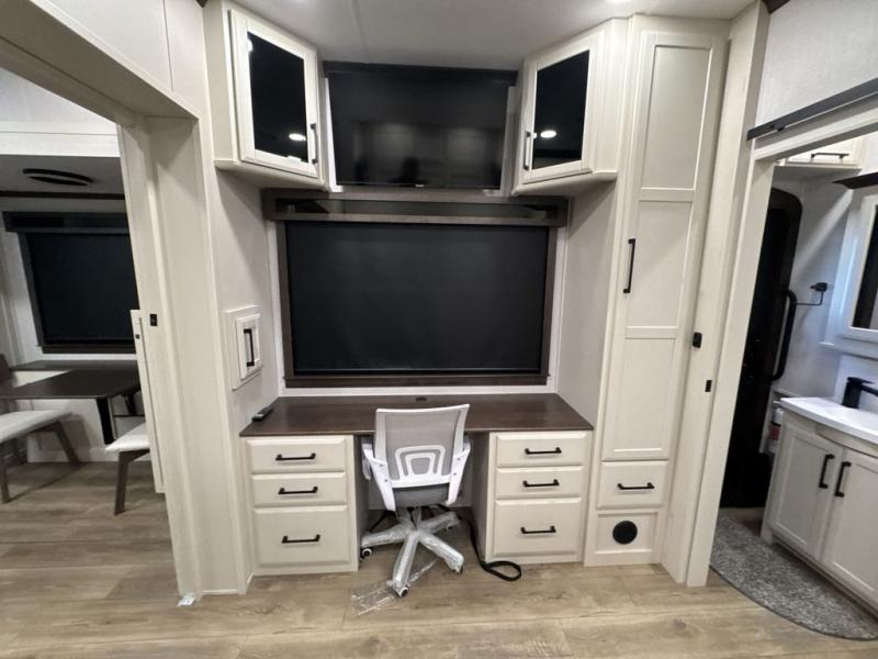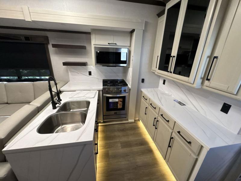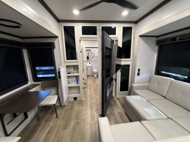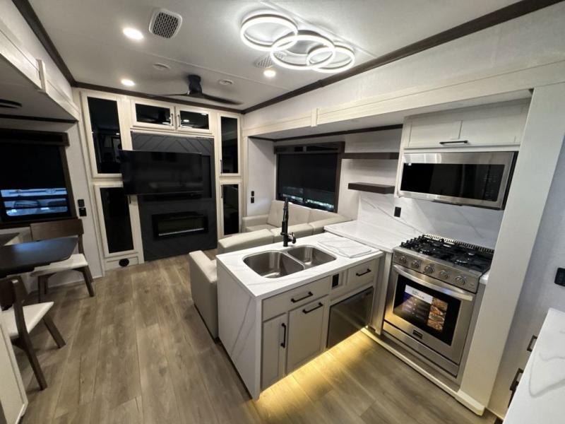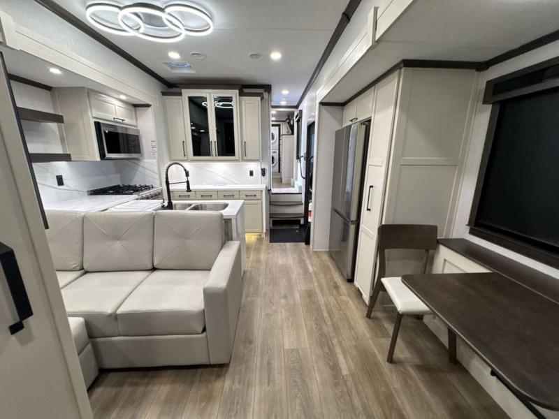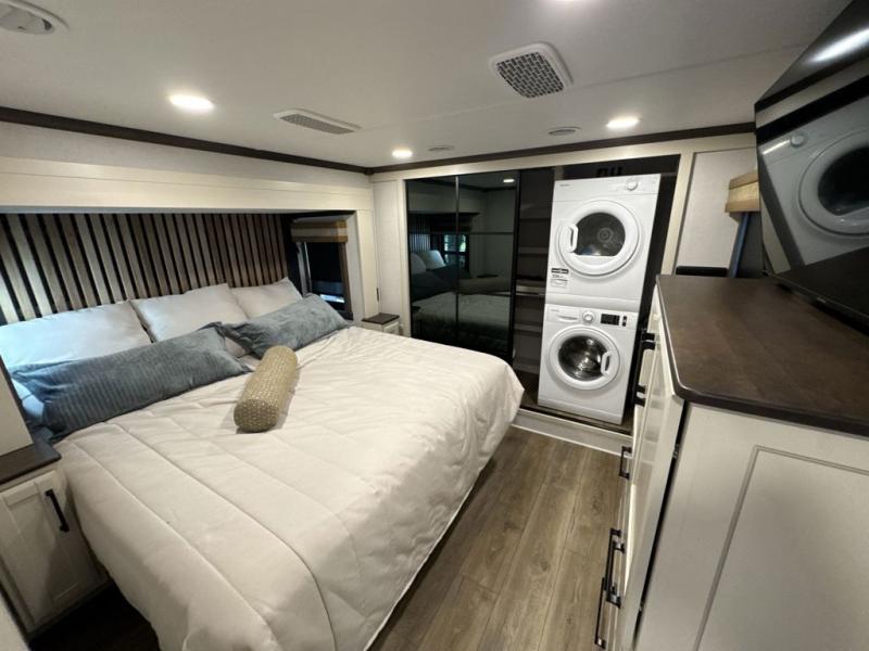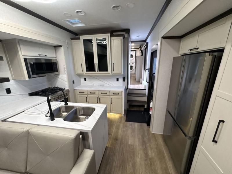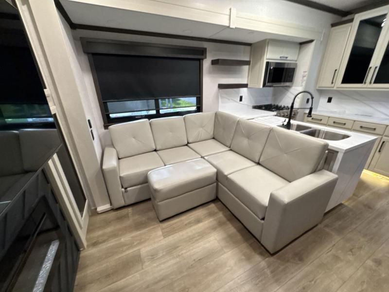 This is the perfect fifth wheel to travel with friends since there are two private bedrooms, one of which is a rear master with a full bath. There is also a Murphy sofa here for your guests to sleep on, along with a wardrobe for their clothes and overhead storage. Head to the front private bedroom where you'll find a king bed slide, a dresser and a bench, a front wardrobe, plus a washer and dryer to make life at the campground easier than ever. The middle of this unit features the kitchen and living area. There is plenty of counter space plus a hutch and pantry for added storage. A sectional sofa provides tons of comfort, especially since its in perfect view of the fireplace and swinging entertainment center. There is also a dinette where you can dine together and play a game of cards in the evening!