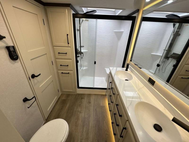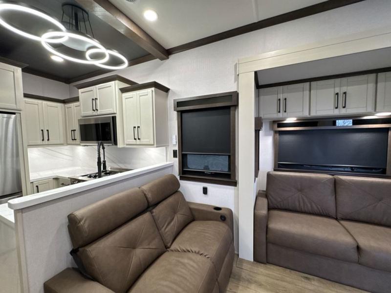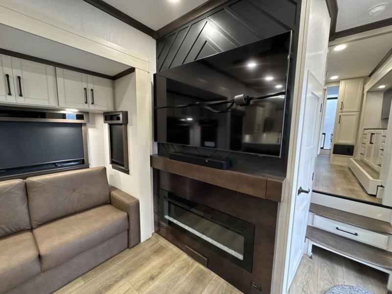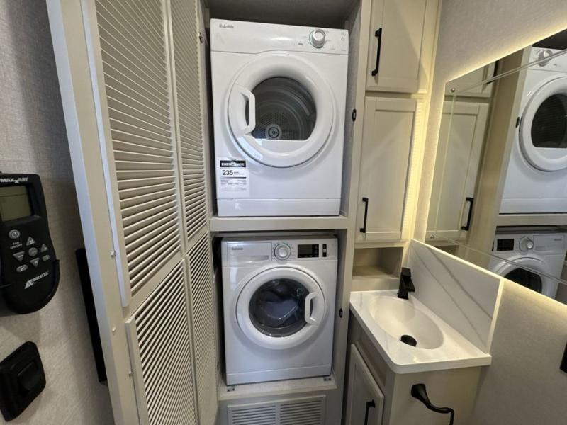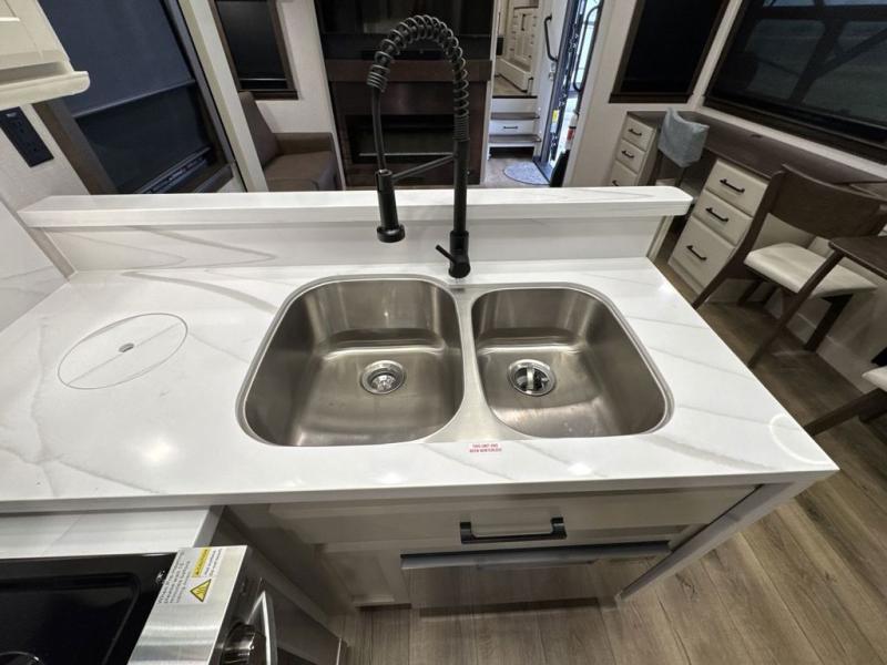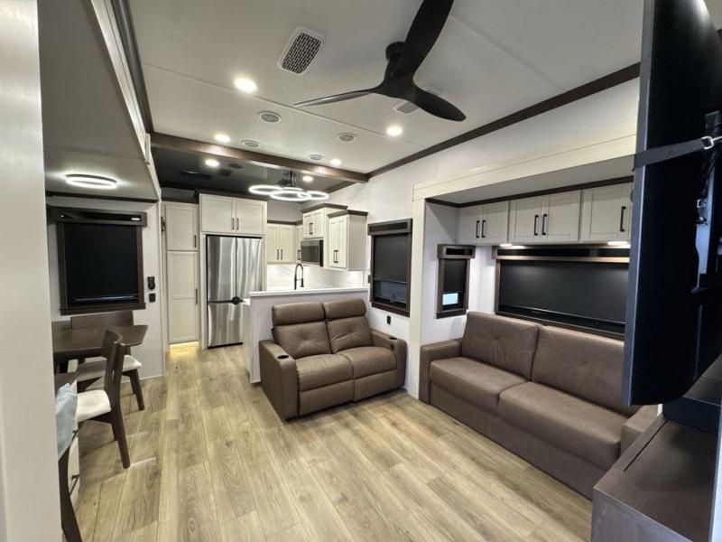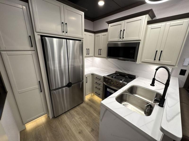The Forest River RiverStone fifth wheels and toy haulers are luxurious units that have it all! You'll find an automatic six-point hydraulic level-up system to keep your unit in place, and there is preparation for a four-camera observation system. The TravlFi Journey XTR 4G/LTE router and WiFi extender will help you stay connected to the outside world, and you'll never have to overpack again since the Splendid “Astral” stackable washer and dryer will let you clean the small amount of clothes you've brought with you. Another high luxury is the Fischer Paykal dishwasher which will allow you to spend more time enjoying your camp life and less time cleaning up. Each unit is built with an LCI Road Armour suspension system, dual-pane frameless windows, a full docking station, a 200W solar panel, and a BMPro touch control system.