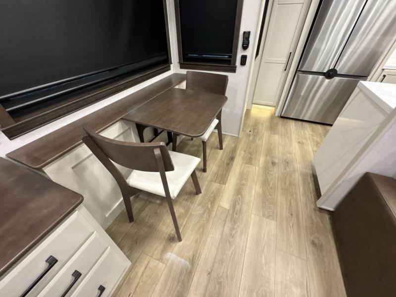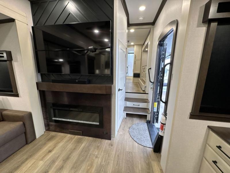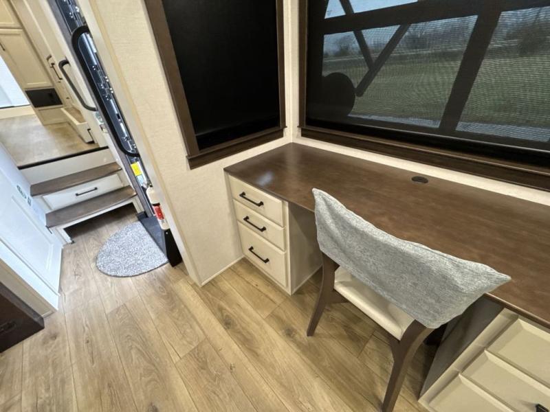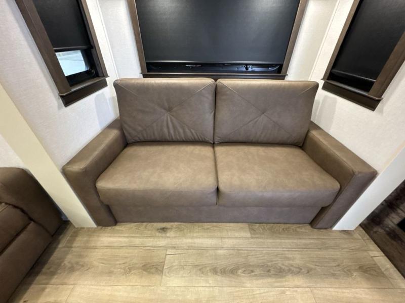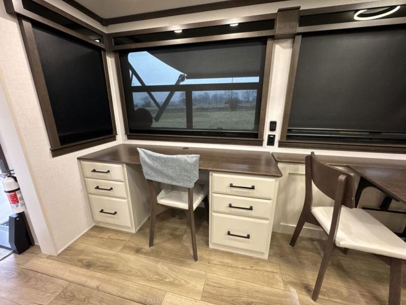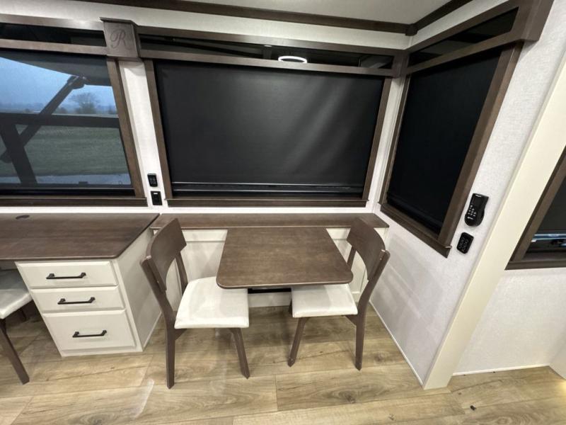 Show your family a good time with this RiverStone fifth wheel! You will get to stay in a super comfortable master suite at the front of this unit which has a dual-sink vanity in the full bathroom. The bedroom offers you a king-size bed that you can rest on while you watch the 40" LED TV across from you, and there is a half bathroom just outside the bedroom for your friends or family to use. If you've decided to bring work with you on the road, you'll be grateful to find a desk in the living area, and the pull-out dinette is a great place to sit down for meals. Work your magic in the kitchen and prepare something delicious on the four-burner range for everyone to eat.