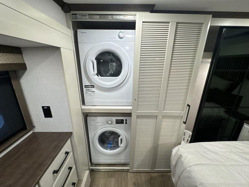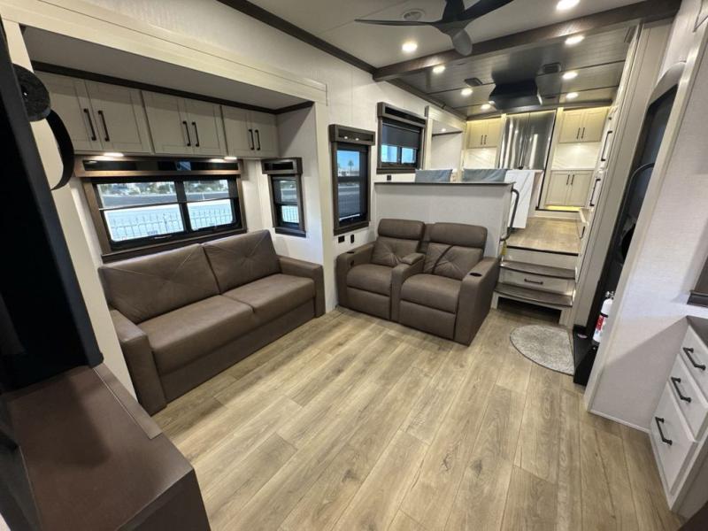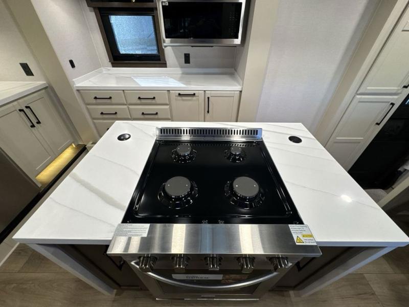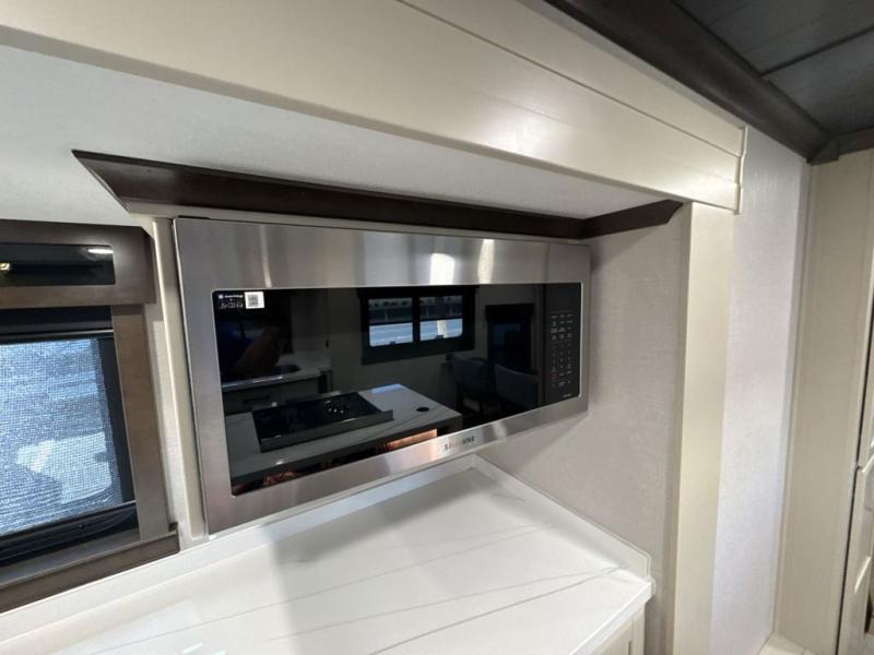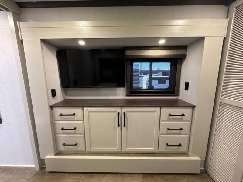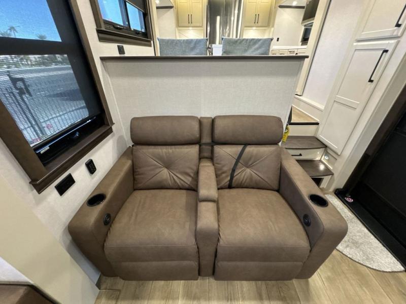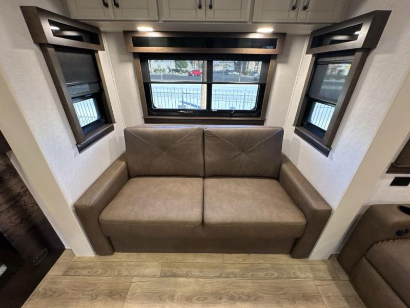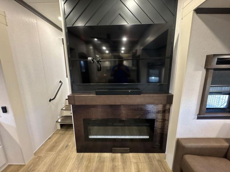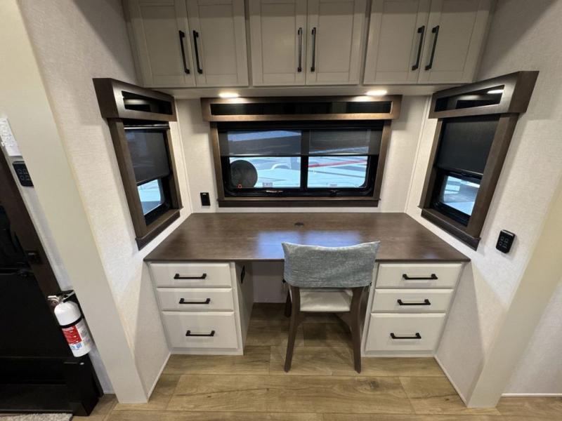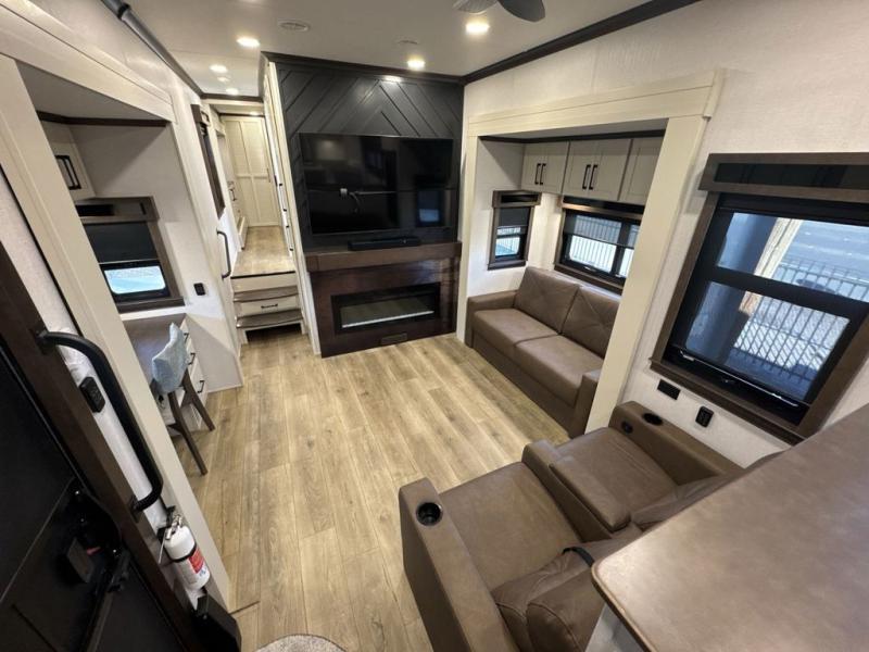 You will feel right at home in this fifth wheel! The rear private bedroom has a 72" x 80" king bed slide for a good night's rest, a rear large wardrobe with the washer and dryer next to it, and even a dresser with a 40" LED TV. And two can get ready at once in the full bathroom with the dual sink vanity. You can then head to either the desk slide to get some work done or whip up some scrambled eggs on the three burner cooktop at the island in the front kitchen. The kitchen even has a dishwasher for easy clean up and two bar stools at the high top dinette that overlooks the middle living area. Relax each night in true comfort on either the E-Z Glide sofa bed slide or the theater seating across from the entertainment center which has a fireplace and 65" Samsung LED Smart TV to watch your favorite movies!