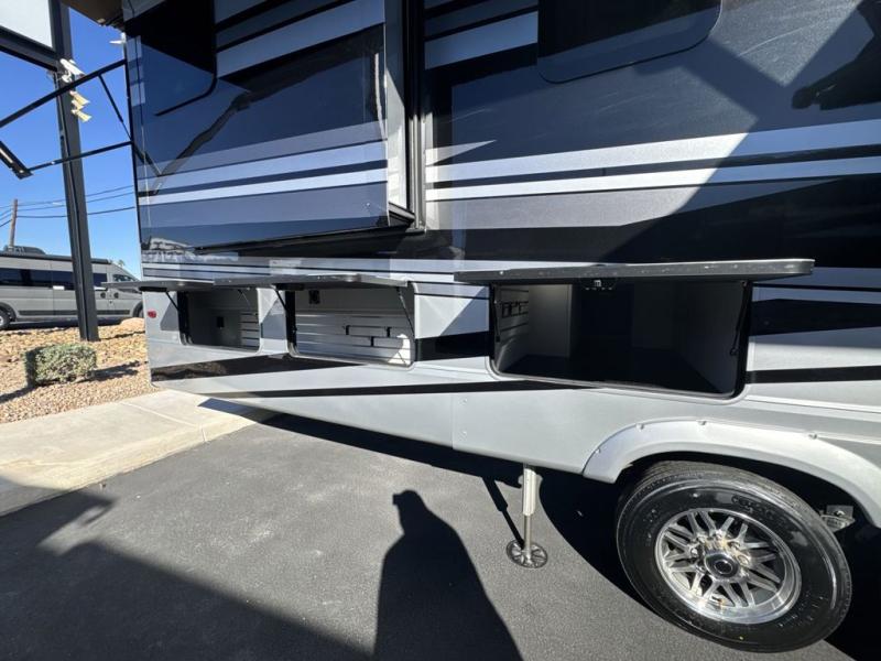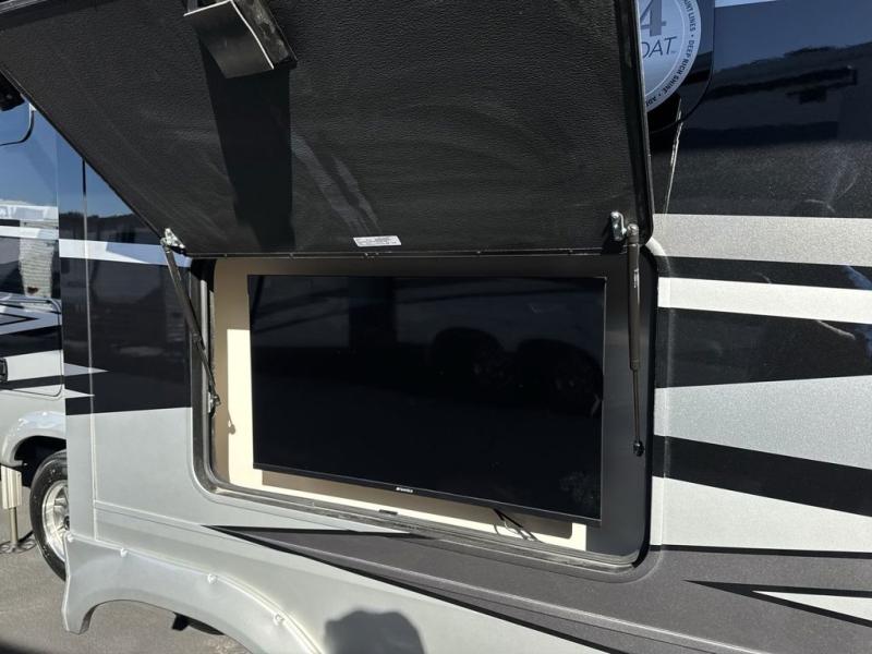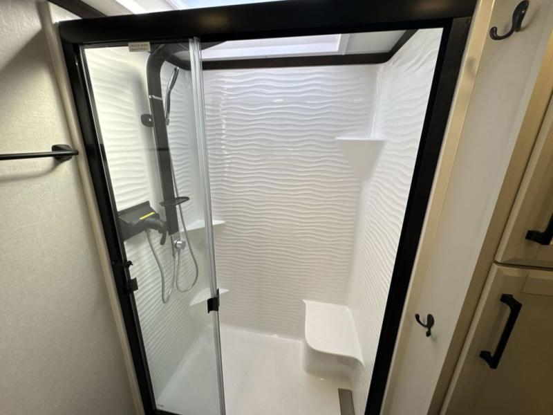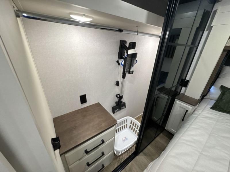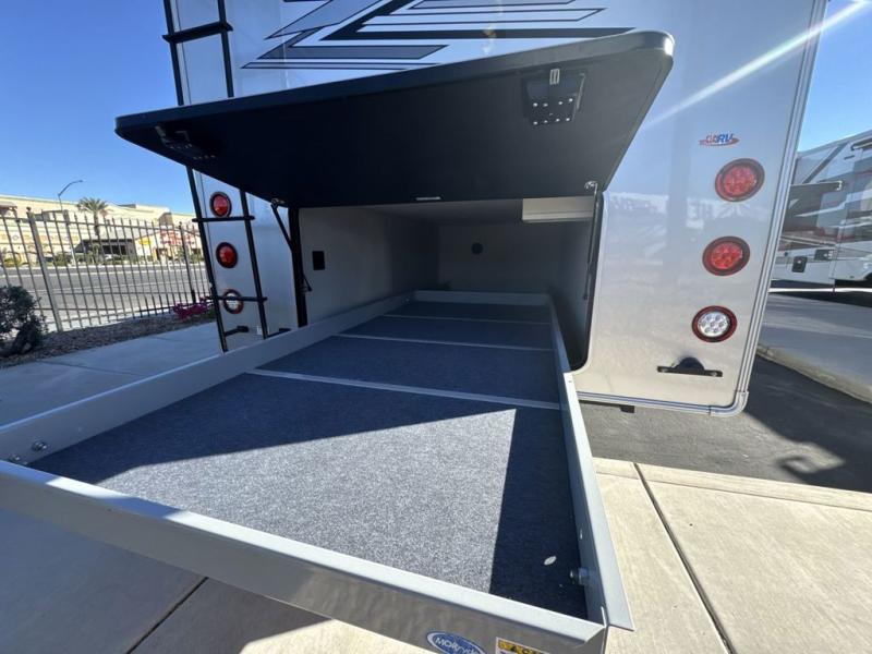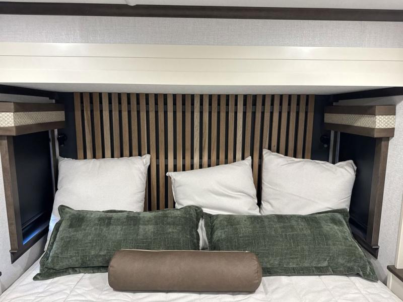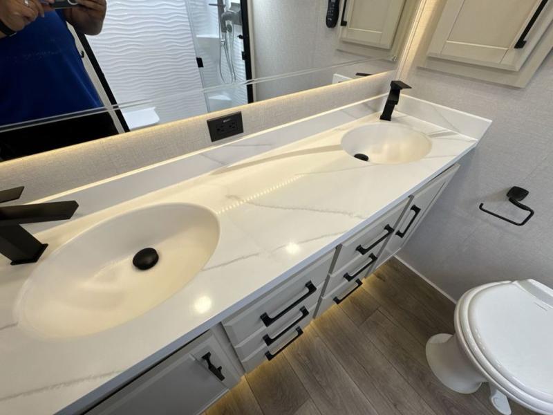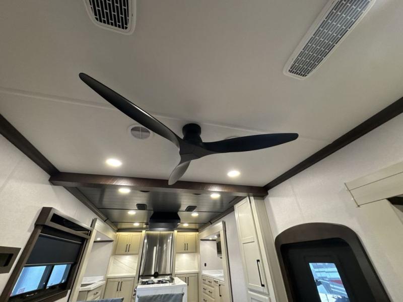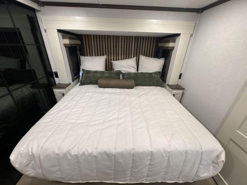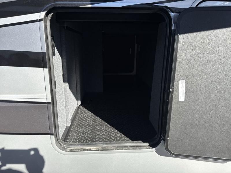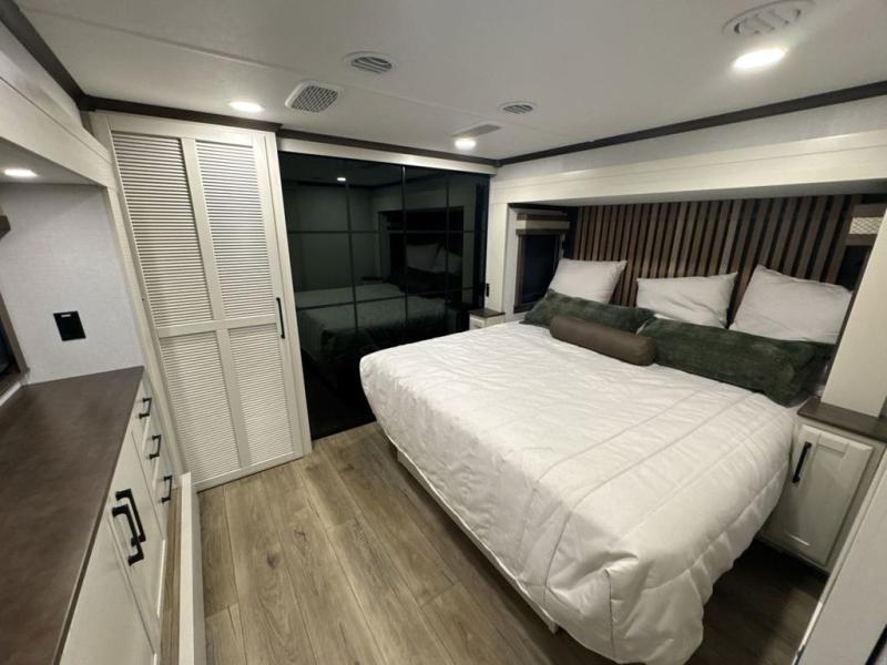 You will feel right at home in this fifth wheel! The rear private bedroom has a 72" x 80" king bed slide for a good night's rest, a rear large wardrobe with the washer and dryer next to it, and even a dresser with a 40" LED TV. And two can get ready at once in the full bathroom with the dual sink vanity. You can then head to either the desk slide to get some work done or whip up some scrambled eggs on the three burner cooktop at the island in the front kitchen. The kitchen even has a dishwasher for easy clean up and two bar stools at the high top dinette that overlooks the middle living area. Relax each night in true comfort on either the E-Z Glide sofa bed slide or the theater seating across from the entertainment center which has a fireplace and 65" Samsung LED Smart TV to watch your favorite movies!