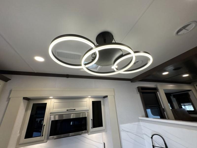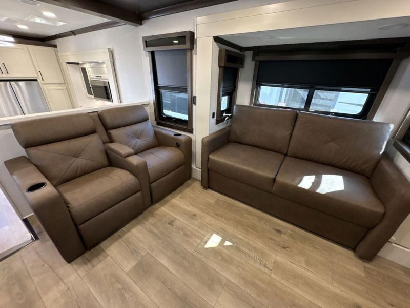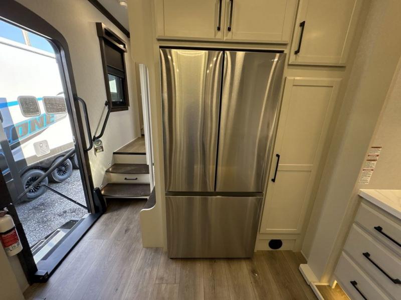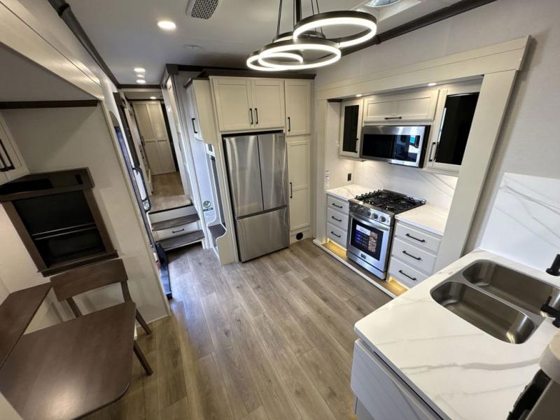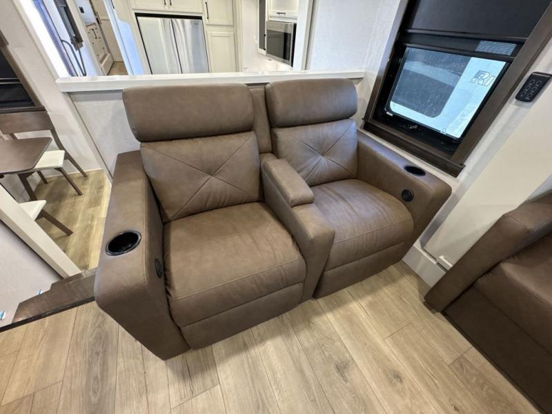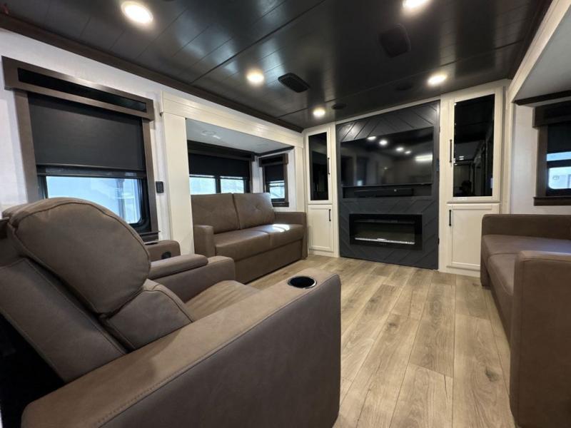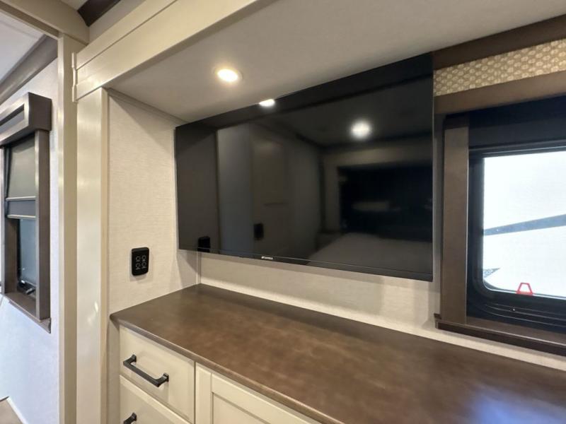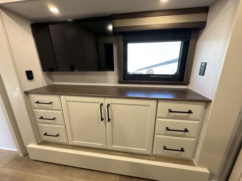 Pack your bags and head to your most comfortable camping trip ever in this packed out fifth wheel! The rear private bedroom has a 72" x 80" king bed slide for a good night's rest, a rear large wardrobe with the washer and dryer next to it, and even a dresser with a 40" LED TV. Get ready in the full bathroom with the shower then head to either the pull-out dinette to read the morning paper or whip up some scrambled eggs on the three burner cooktop in the middle kitchen. The kitchen even has two pantries for all your favorite snacks and a coat rack to hang your jacket. You can relax in the evenings on the two E-Z Glide sofa beds or the theater sofa across from the Samsung LED Smart TV. What's behind the swinging entertainment center is where the real convenience is found with this model; a hidden front office with ample counter space to get your work done!