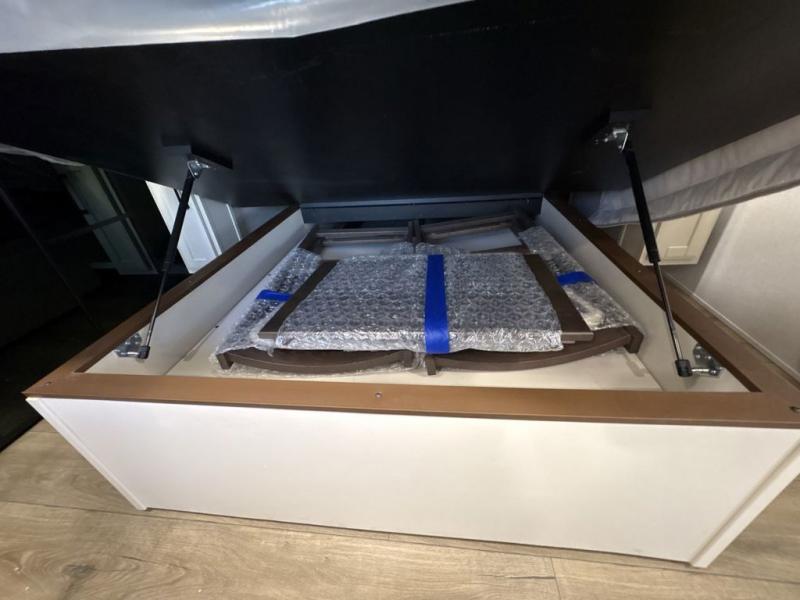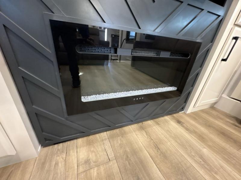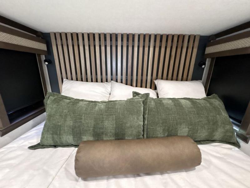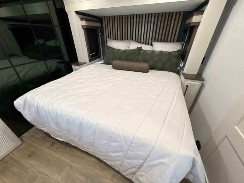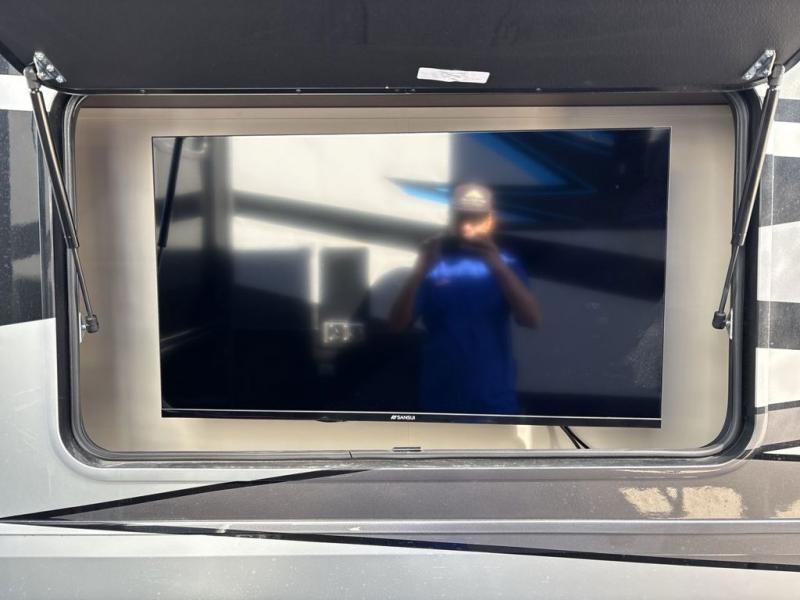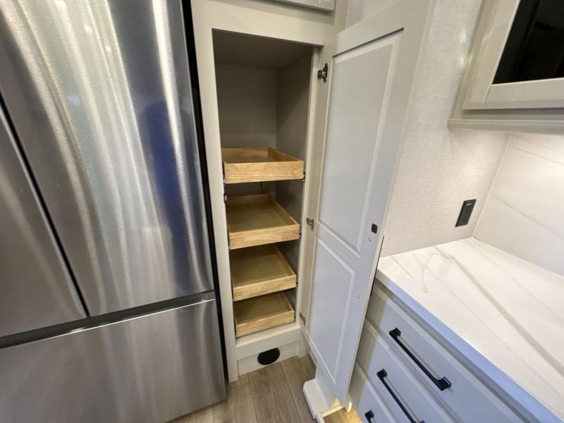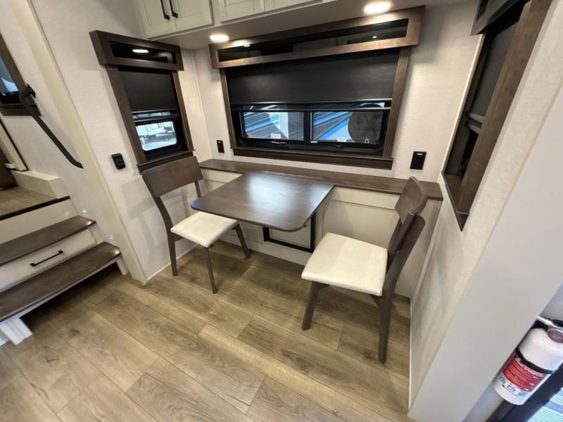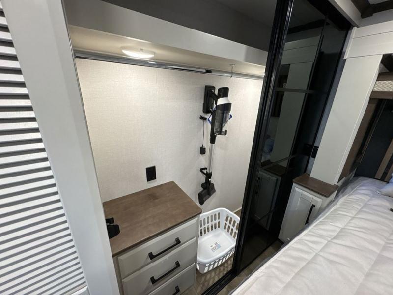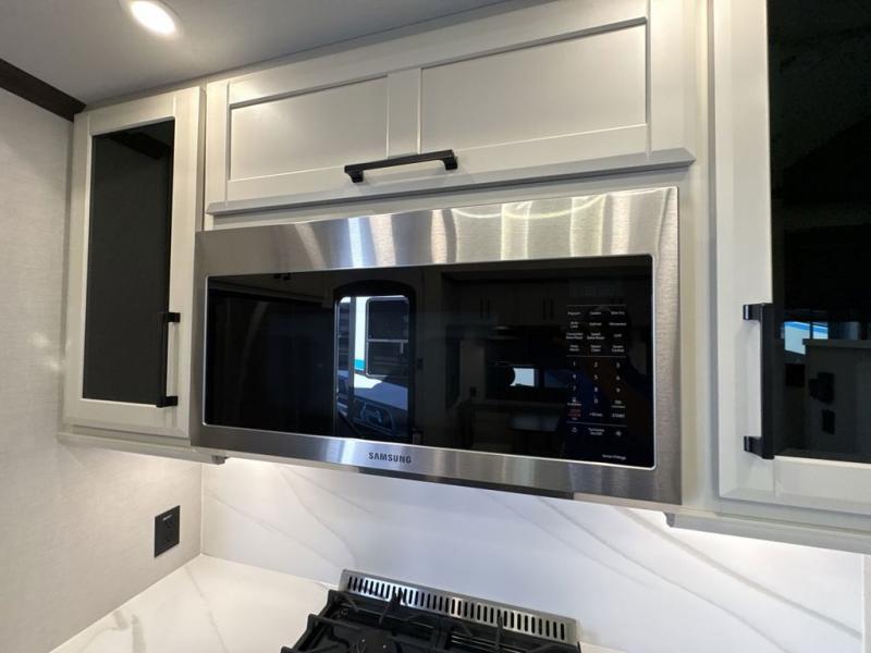 Pack your bags and head to your most comfortable camping trip ever in this packed out fifth wheel! The rear private bedroom has a 72" x 80" king bed slide for a good night's rest, a rear large wardrobe with the washer and dryer next to it, and even a dresser with a 40" LED TV. Get ready in the full bathroom with the shower then head to either the pull-out dinette to read the morning paper or whip up some scrambled eggs on the three burner cooktop in the middle kitchen. The kitchen even has two pantries for all your favorite snacks and a coat rack to hang your jacket. You can relax in the evenings on the two E-Z Glide sofa beds or the theater sofa across from the Samsung LED Smart TV. What's behind the swinging entertainment center is where the real convenience is found with this model; a hidden front office with ample counter space to get your work done!