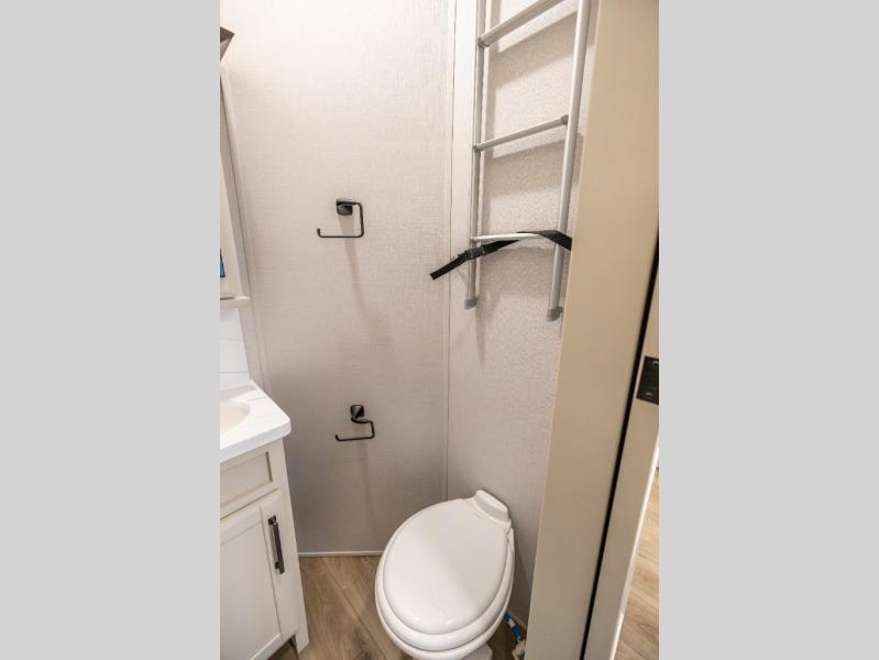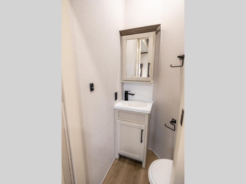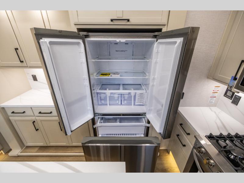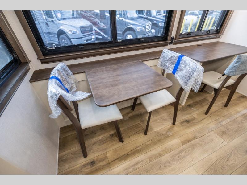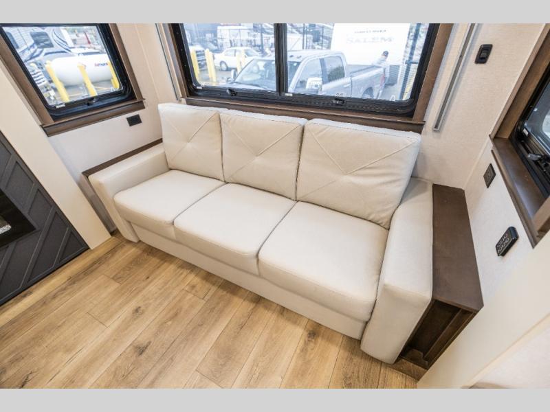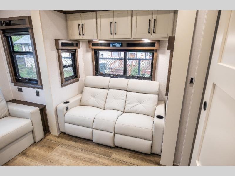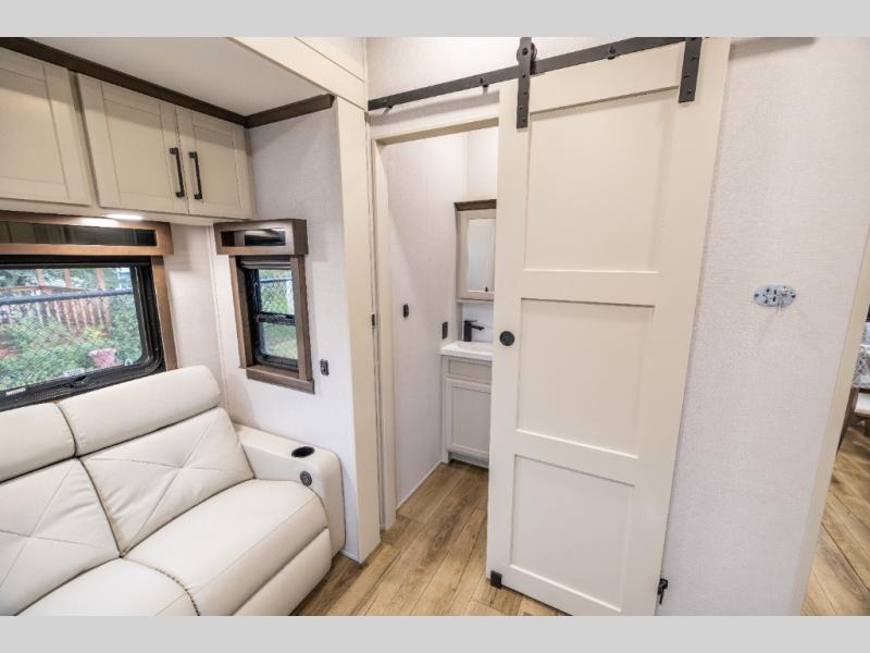 This RiverStone fifth wheel has an amazing den in the back! This area is not only an excellent lounging space with its theater sofa, hide-a-bed sofa, and entertainment center, but it is also a comfortable guest suite because it contains its own half bathroom and a drop-down queen bed. Each section of this unit has opposing slides, so you'll have plenty of living space, and the kitchen area has a pull-out dinette so that you can sit down with hot meals each night. You have a large pantry for snacks and an 18-cubic foot French door refrigerator with ice maker for cold beverages. The ceiling fan allows you to cool off the interior without overworking the AC, and the cordless vacuum will help you clean up messes.