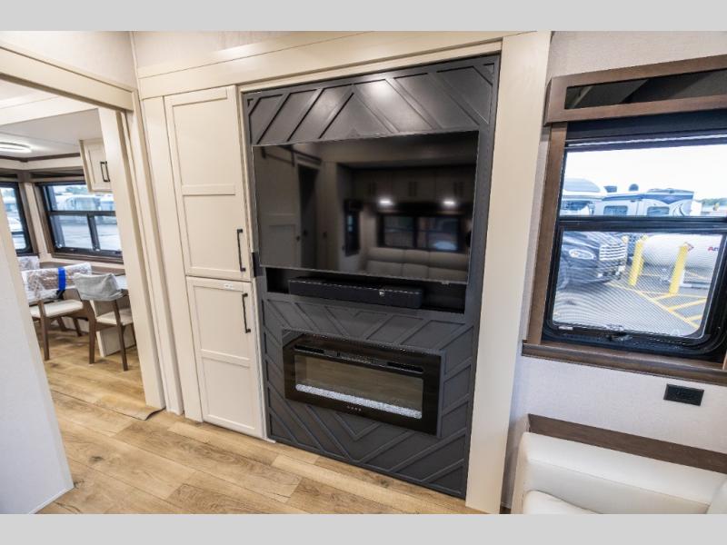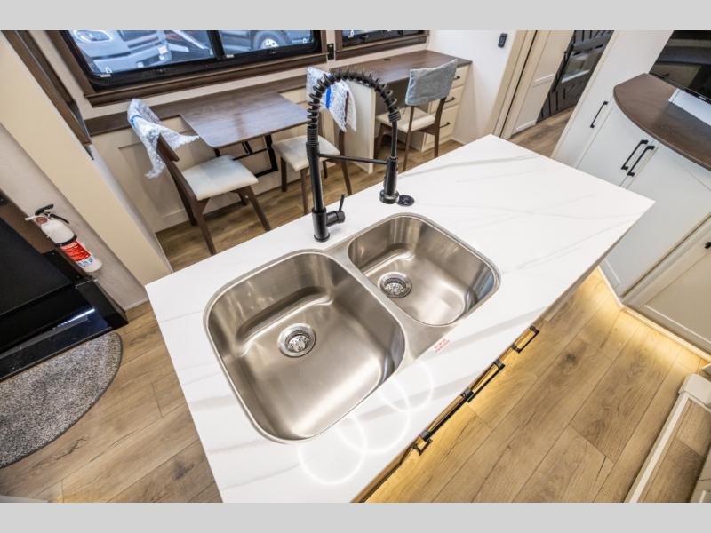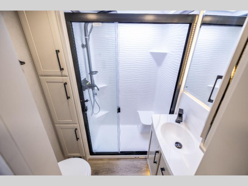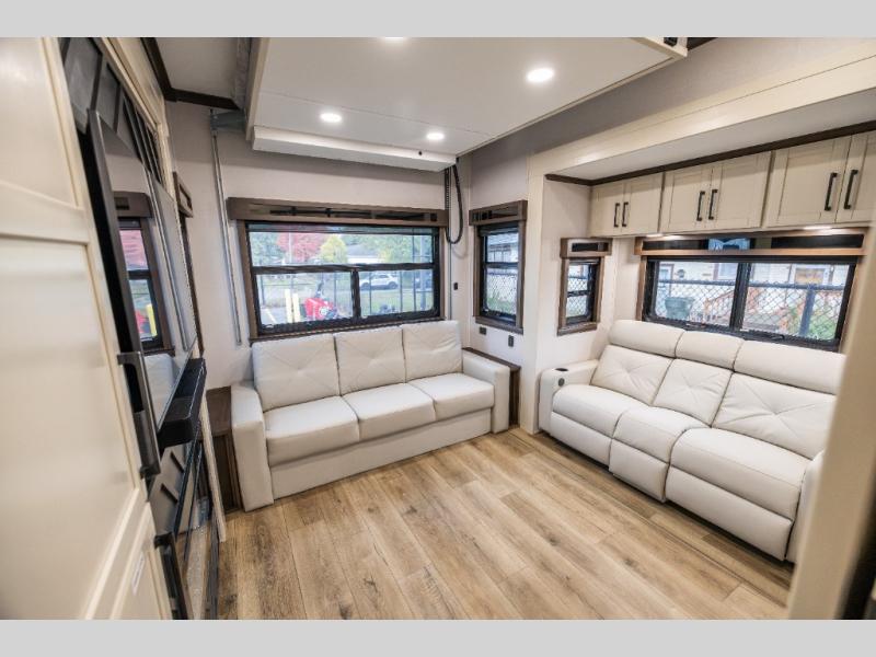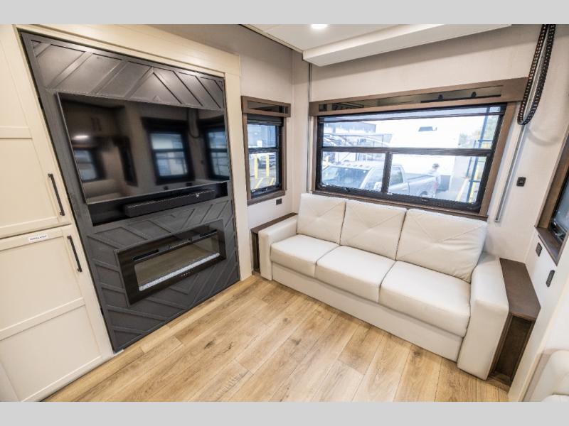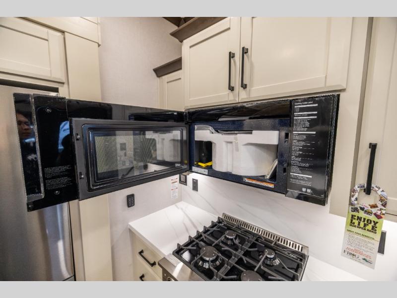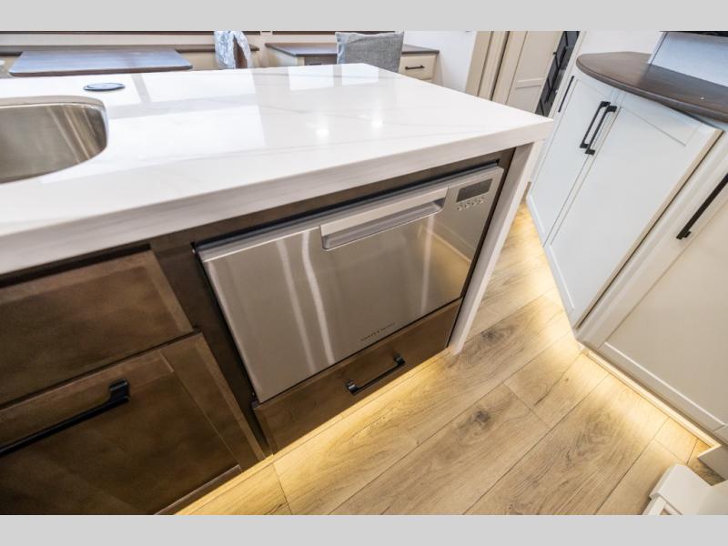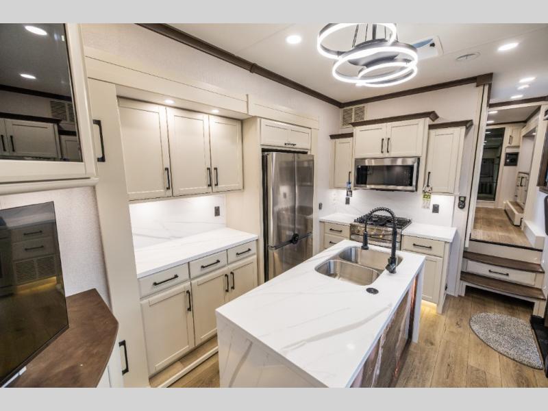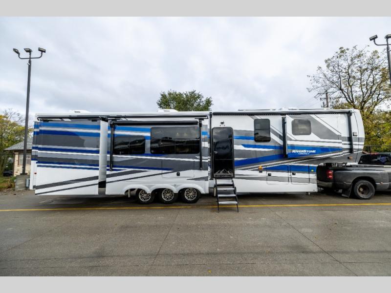 The Forest River RiverStone fifth wheels and toy haulers are luxurious units that have it all! You'll find an automatic six-point hydraulic level-up system to keep your unit in place, and there is preparation for a four-camera observation system. The TravlFi Journey XTR 4G/LTE router and WiFi extender will help you stay connected to the outside world, and you'll never have to overpack again since the Splendid “Astral” stackable washer and dryer will let you clean the small amount of clothes you've brought with you. Another high luxury is the Fischer Paykal dishwasher which will allow you to spend more time enjoying your camp life and less time cleaning up. Each unit is built with a LCI Road Armour suspension system, dual-pane frameless windows, a full docking station, a 200W solar panel, and a BMPro touch control system.