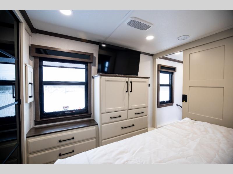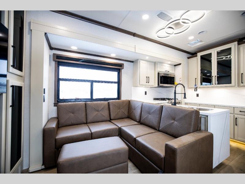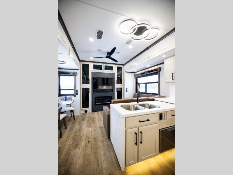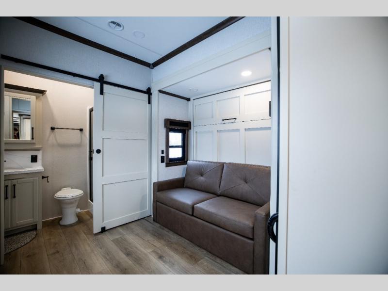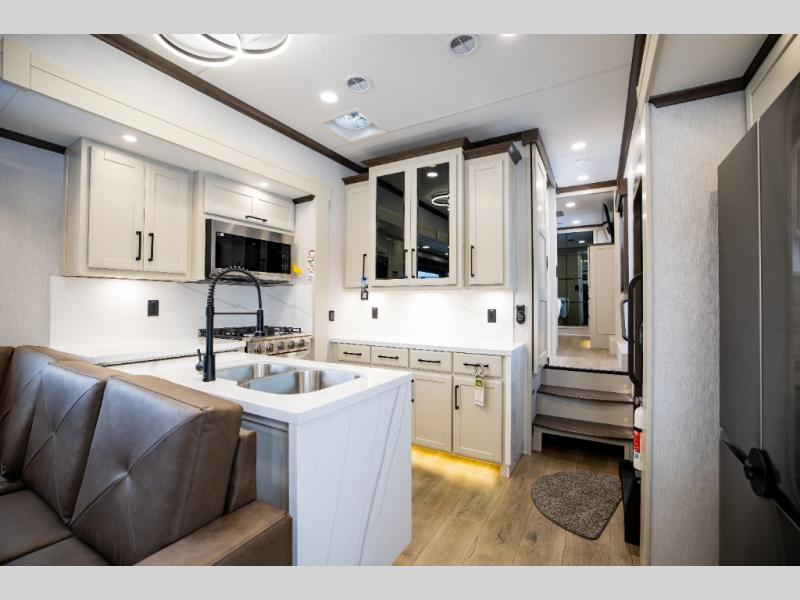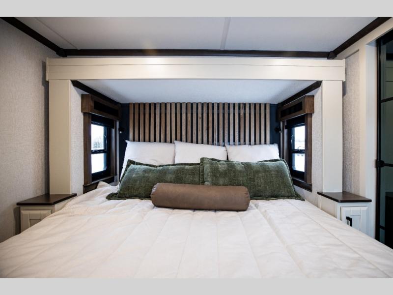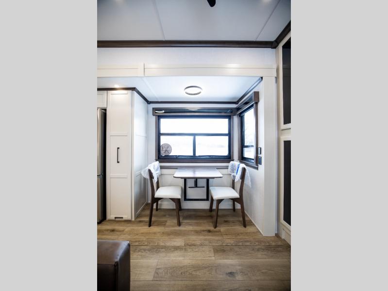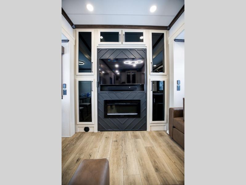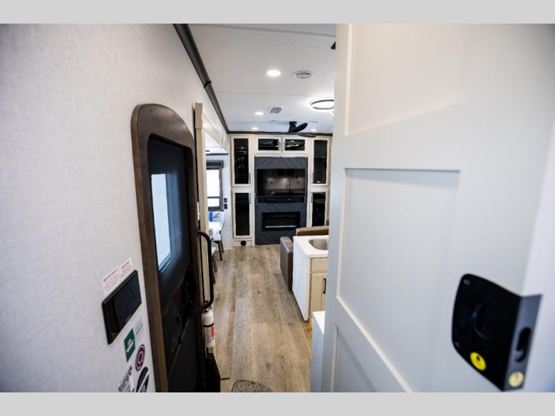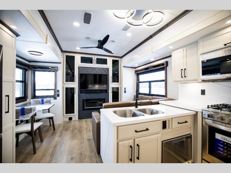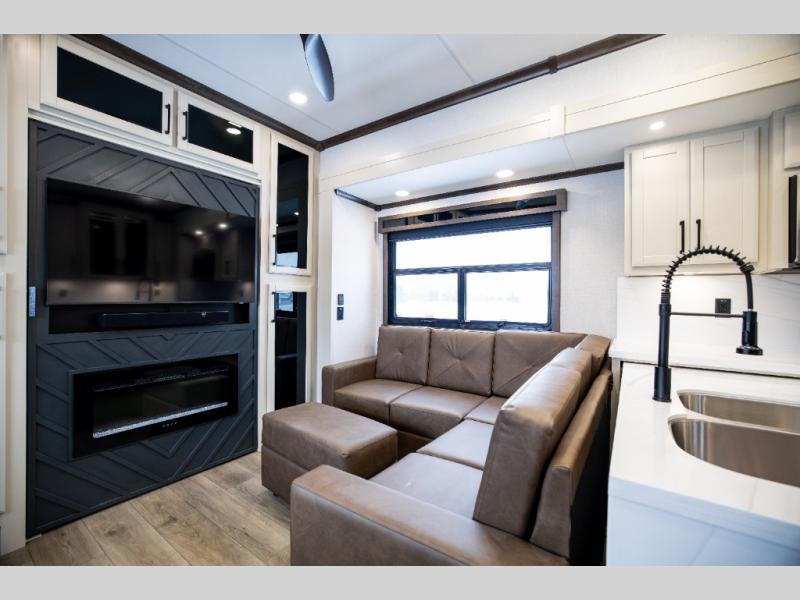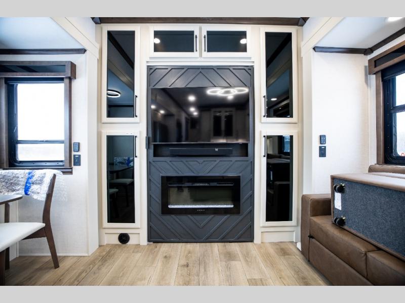This is the perfect fifth wheel to travel with friends since there are two private bedrooms, one of which is a rear master with a full bath and its own exterior entry door. There is also a Murphy sofa here for your guests to sleep on, along with a wardrobe for their clothes and overhead storage. Head to the front private bedroom where you'll find a king bed slide, a dresser and a bench, a front wardrobe, plus a washer and dryer to make life at the campground easier than ever. The middle of this unit features the kitchen and living area. There is plenty of counter space plus a hutch and pantry for added storage. A sectional sofa provides tons of comfort, especially since its in perfect view of the fireplace and swinging entertainment center. There is also a dinette with four chairs where you can dine together and play a game of cards in the evening!
