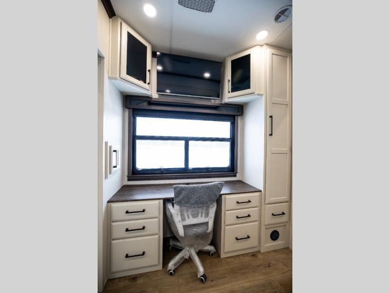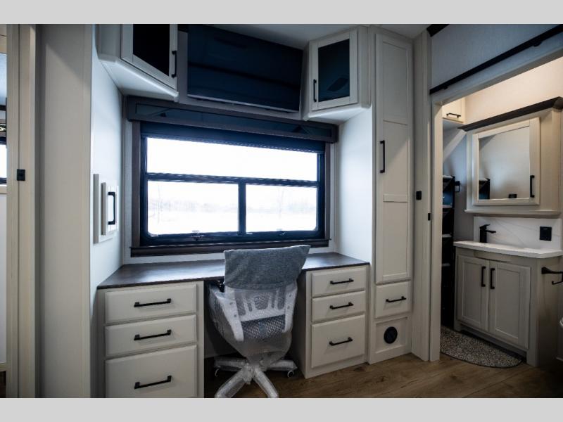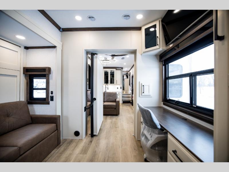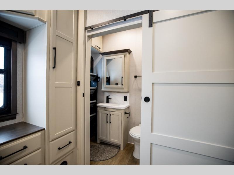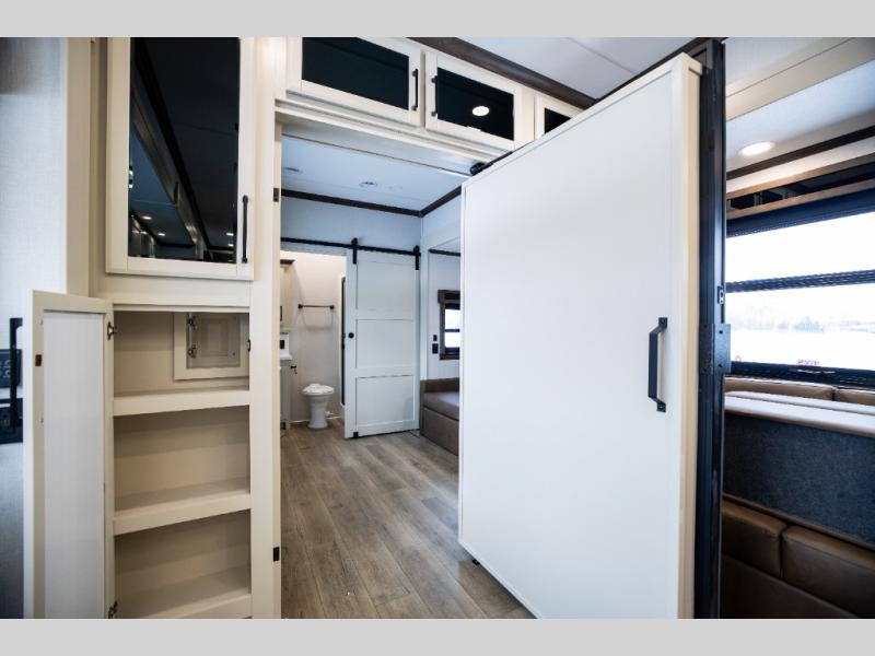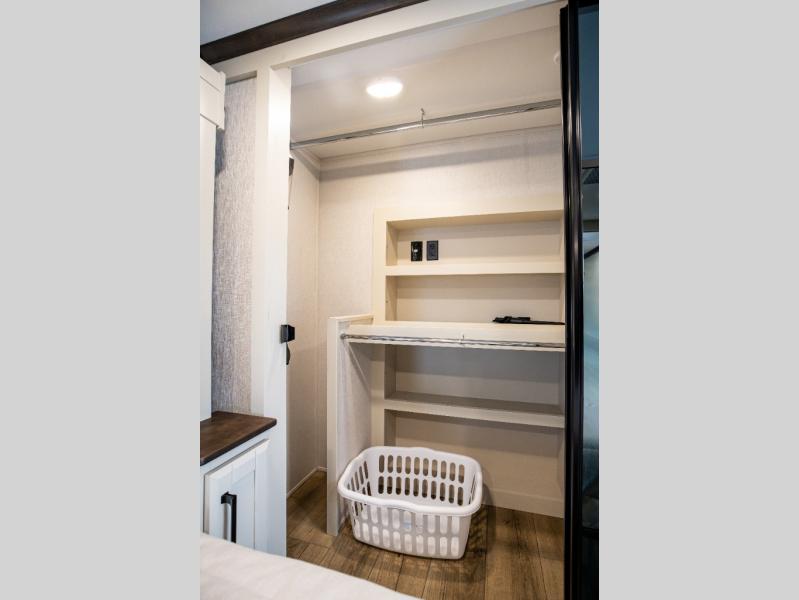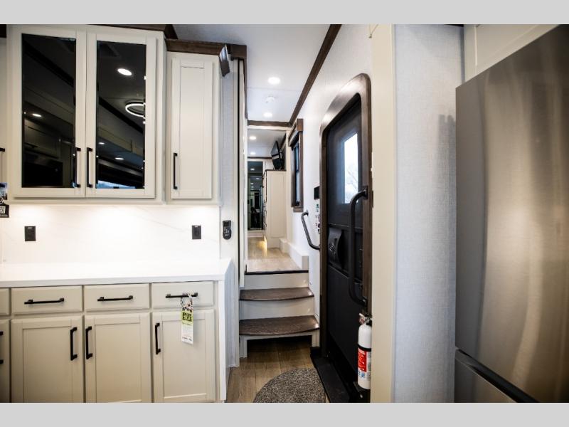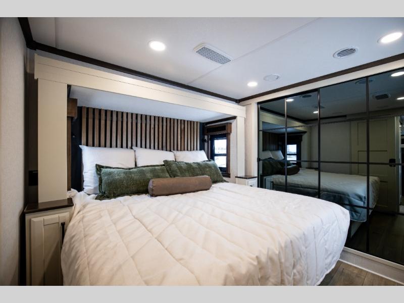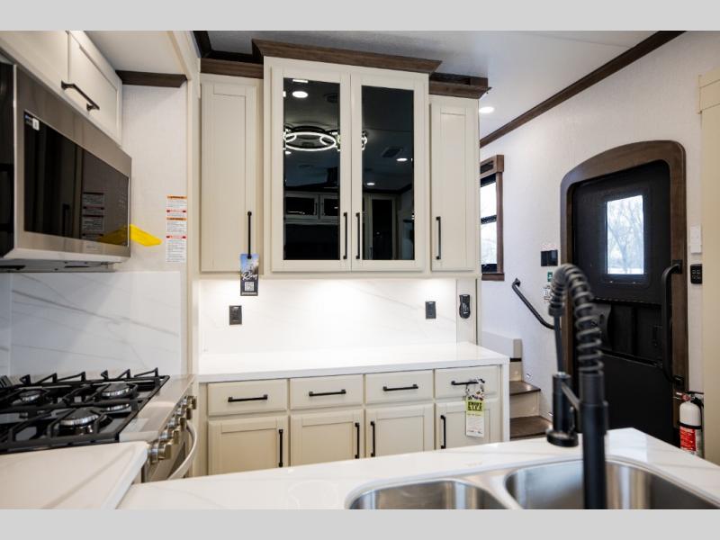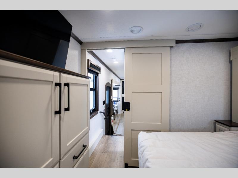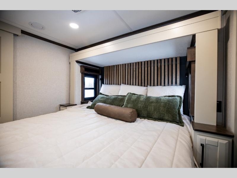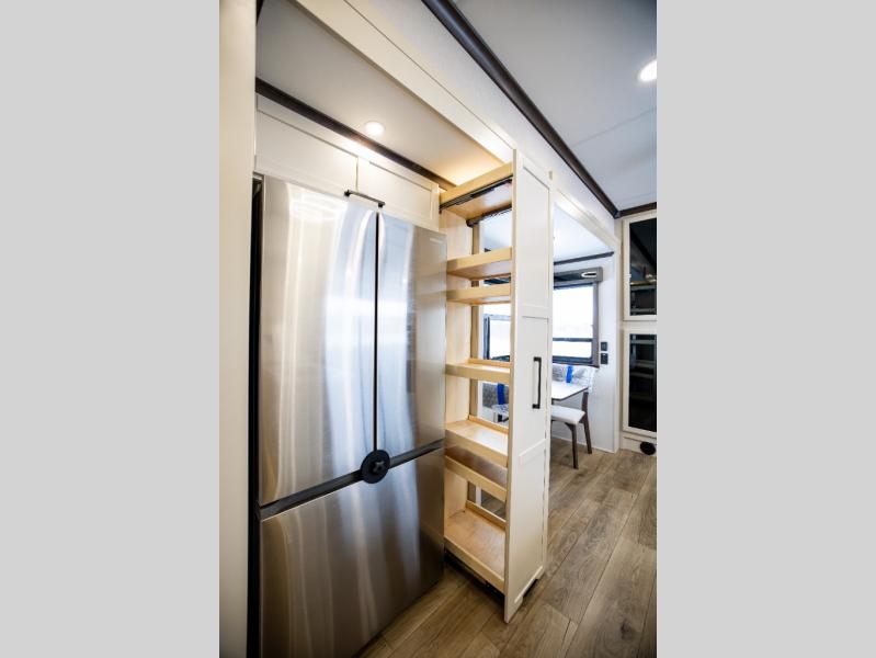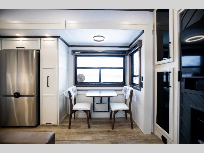 This is the perfect fifth wheel to travel with friends since there are two private bedrooms, one of which is a rear master with a full bath and its own exterior entry door. There is also a Murphy sofa here for your guests to sleep on, along with a wardrobe for their clothes and overhead storage. Head to the front private bedroom where you'll find a king bed slide, a dresser and a bench, a front wardrobe, plus a washer and dryer to make life at the campground easier than ever. The middle of this unit features the kitchen and living area. There is plenty of counter space plus a hutch and pantry for added storage. A sectional sofa provides tons of comfort, especially since its in perfect view of the fireplace and swinging entertainment center. There is also a dinette with four chairs where you can dine together and play a game of cards in the evening!