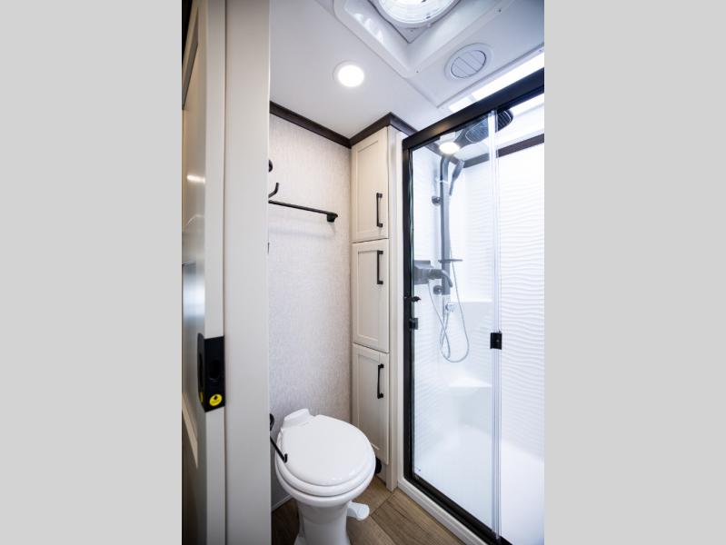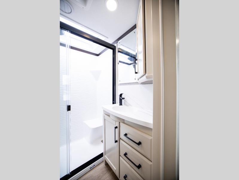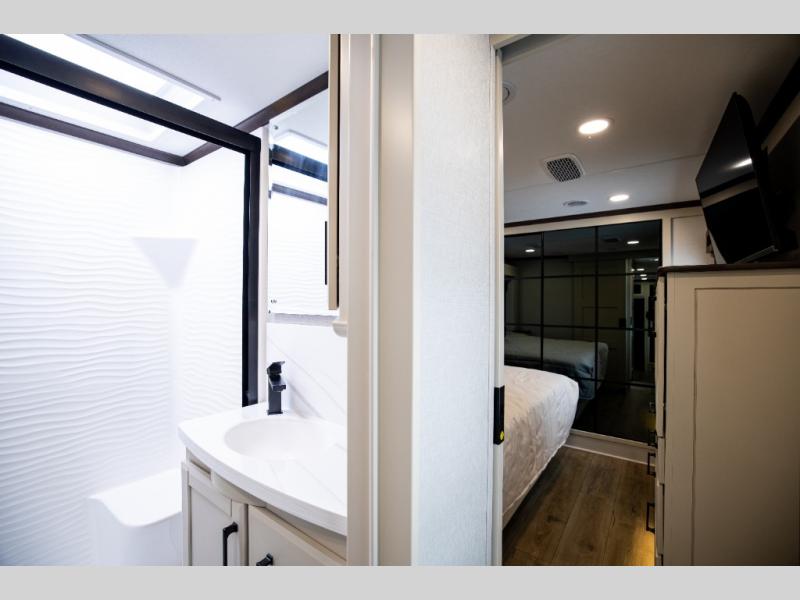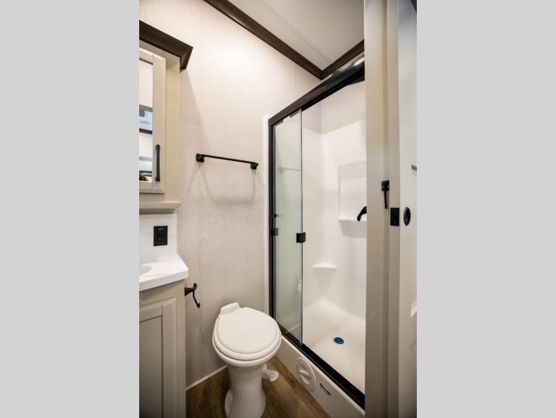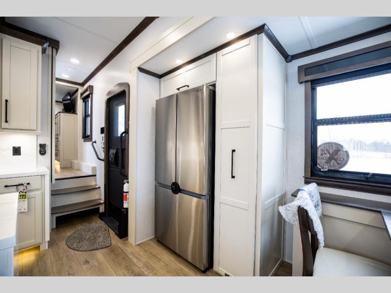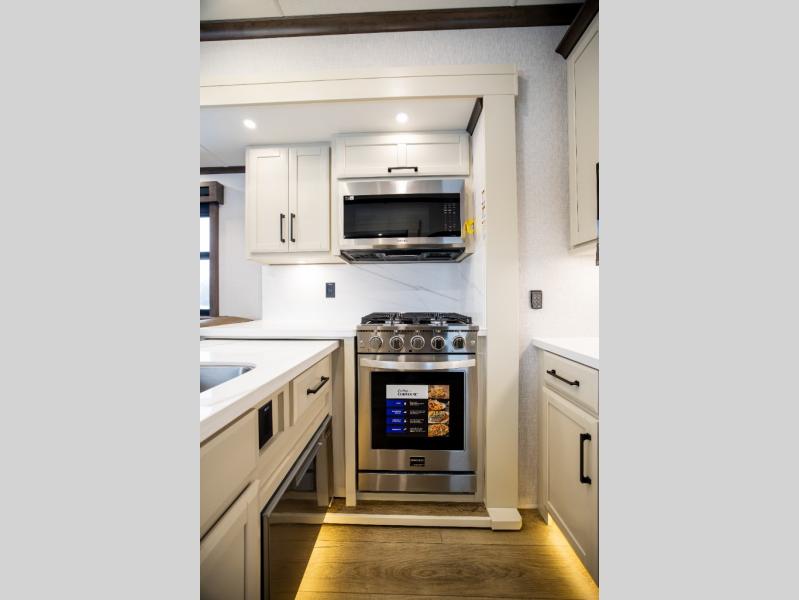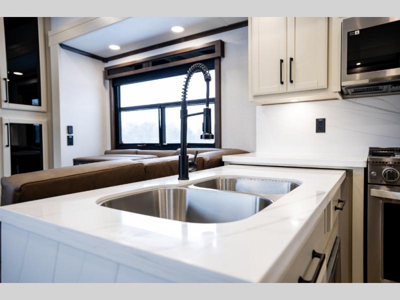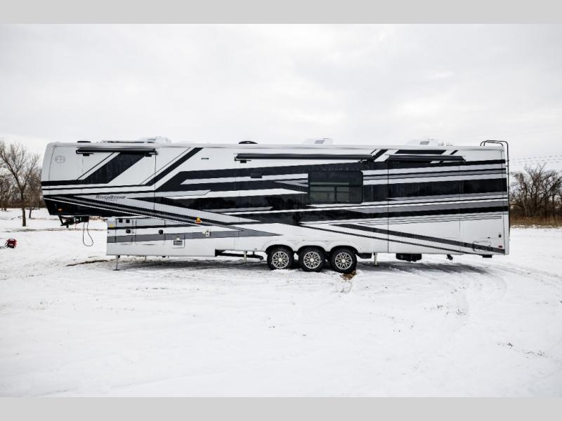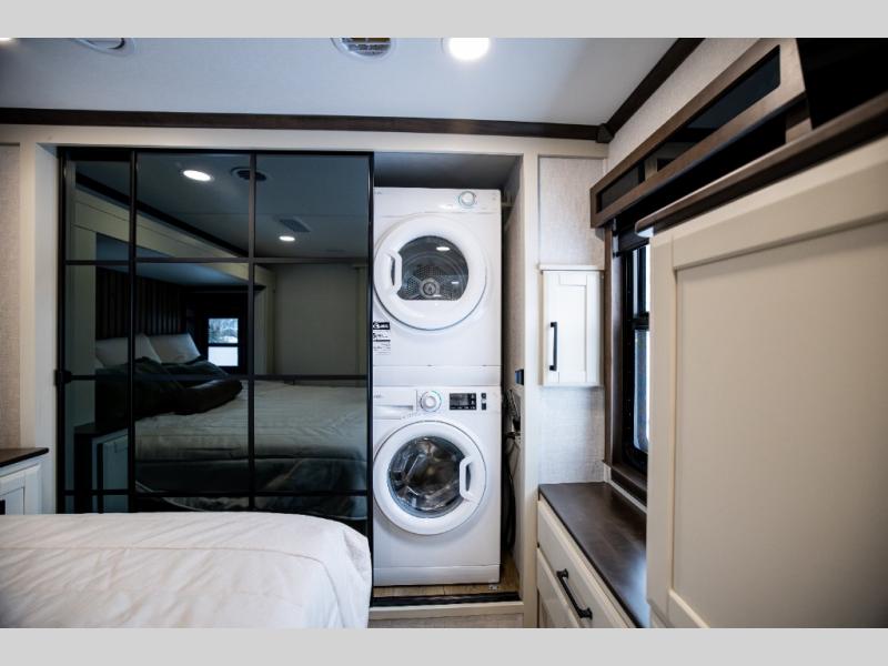 The Forest River RiverStone fifth wheels and toy haulers are luxurious units that have it all! You'll find an automatic six-point hydraulic level-up system to keep your unit in place, and there is preparation for a four-camera observation system. The TravlFi Journey XTR 4G/LTE router and WiFi extender will help you stay connected to the outside world, and you'll never have to overpack again since the Splendid “Astral” stackable washer and dryer will let you clean the small amount of clothes you've brought with you. Another high luxury is the Fischer Paykal dishwasher which will allow you to spend more time enjoying your camp life and less time cleaning up. Each unit is built with an LCI Road Armour suspension system, dual-pane frameless windows, a full docking station, a 200W solar panel, and a BMPro touch control system.