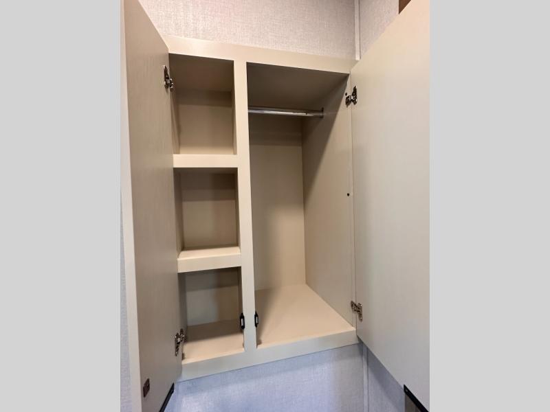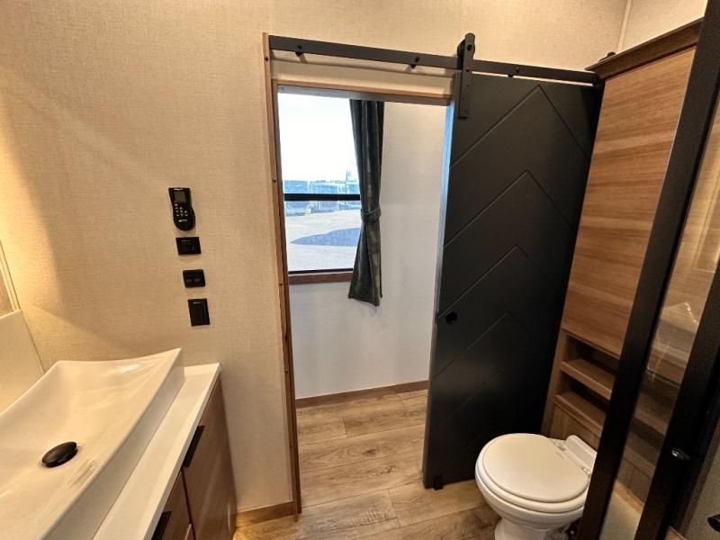 It won't be hard to find comfort in this dual slide, dual entry destination trailer! One of the entry doors conveniently opens to the front private bedroom where you'll find a queen bed slide out with a king bed option, dual closets with shelves in between, plus a dresser to keep everything tidy. If you have guests staying over, they can sleep on the L-shaped sleeper sofa in the rear living area, which is also directly across from the entertainment center for easy viewing. The chef of your group will love the spacious kitchen, complete with all the kitchen appliances to create their best meals and a large kitchen island with four chairs.