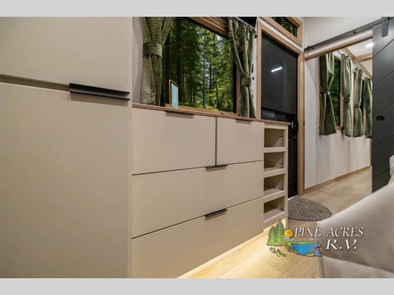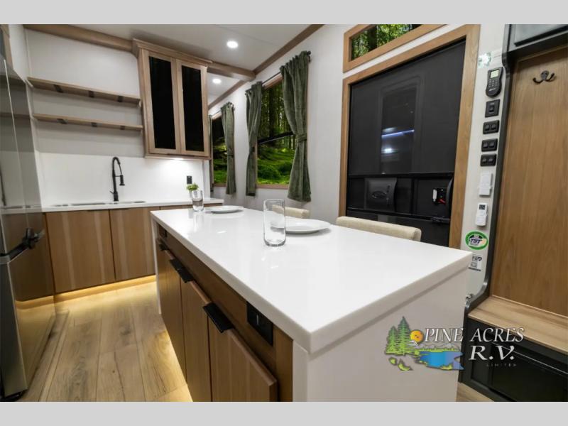 Luxury abounds in the Lost Pines destination trailer by Forest River. Each model features 3" hung wall construction, a rolled fiberglass roof, a thermofoil lined underbelly, and an Azdel gel coat fiberglass exterior wall for added durability. The full-body paint with 4x Clear Coat is sure to turn heads as you travel to your destination, and the LCI Road Armor suspension system will provide a smooth tow. You'll also find dual 40 lb. LP tanks outside, along with a heated full docking station, and MORryde entry steps and Safe-T-Rail. The interior of the Lost Pines is outfitted with luxury vinyl flooring, residential appliances, LED lighting throughout, plus upgraded solid surface countertops and backsplash!