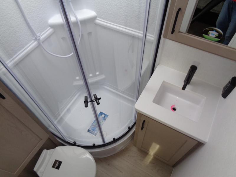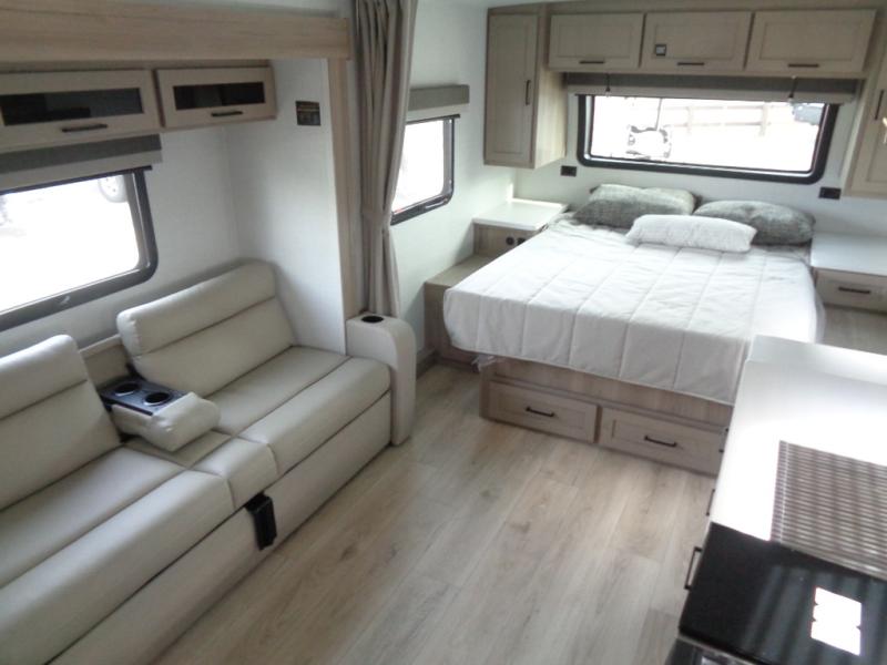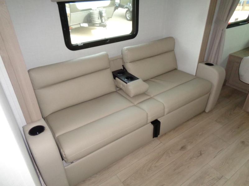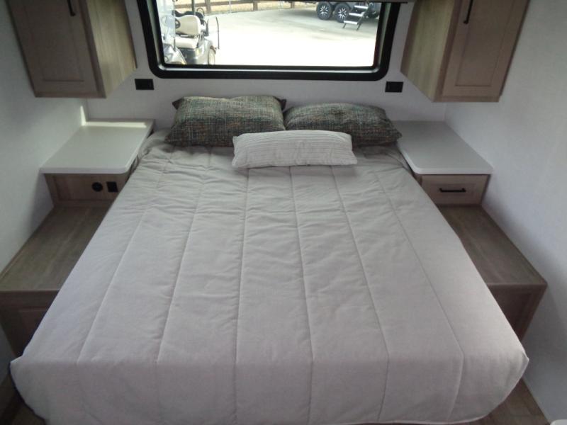 Wherever you decide to camp, you will love every minute in this cute couple's trailer. The sofa slide with a table will provide a place to relax, eat, and even sleep an extra guest if you have one, and the front RV queen bed includes a privacy curtain to enjoy your own space. There are dual bedroom wardrobes to keep your clothes tidy, and you'll find two pass-through storage compartments for your larger gear. Since there is a full bath on board you won't have to use the camp's facilities, and you can make it a movie night with the TV in the main living area!