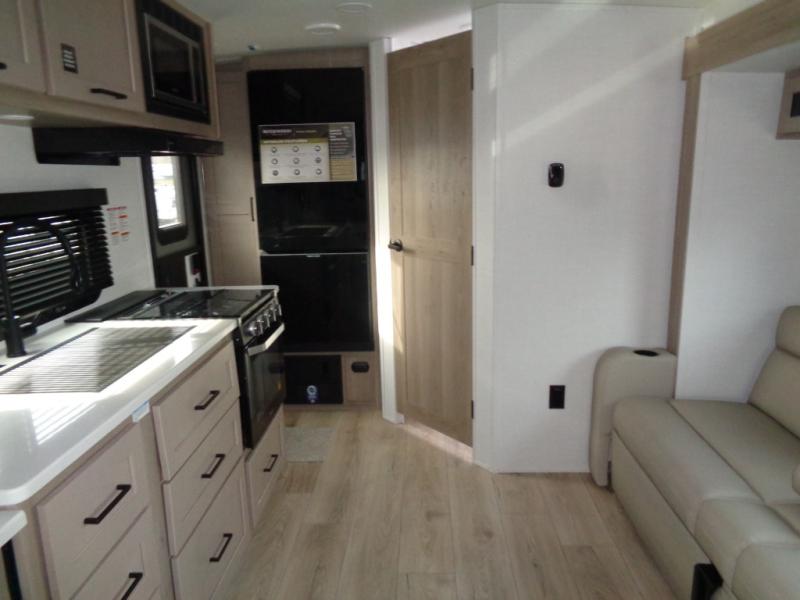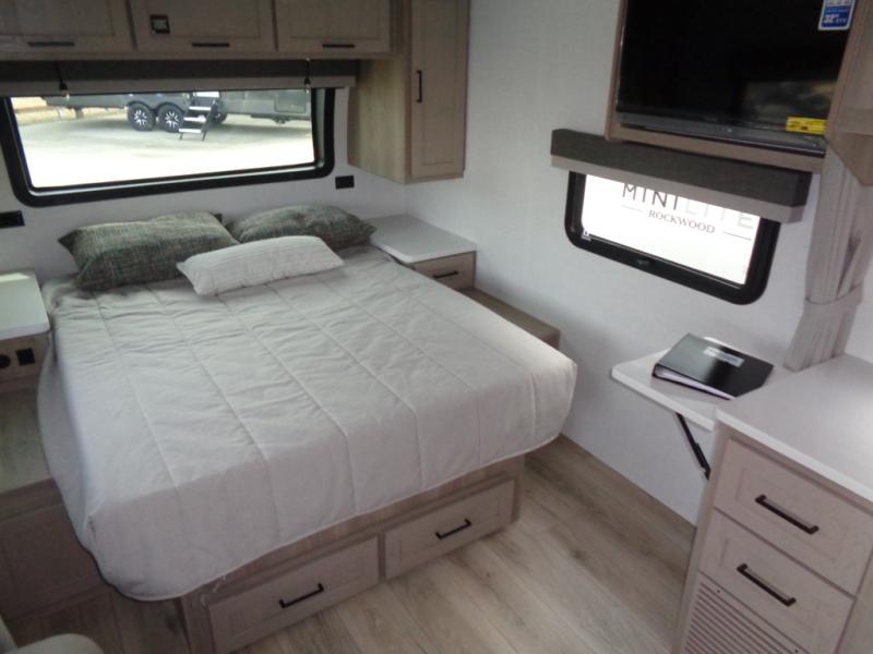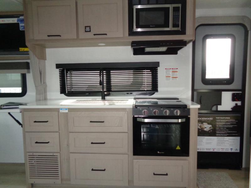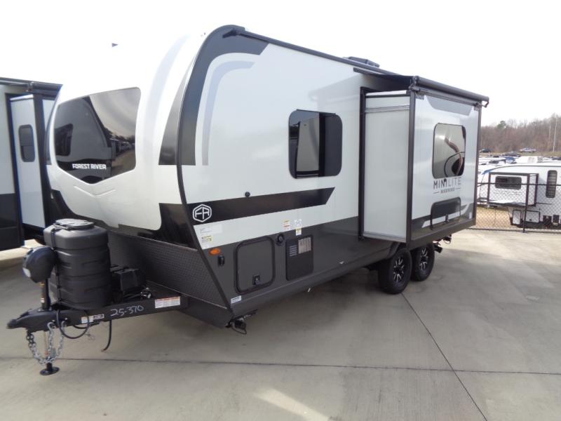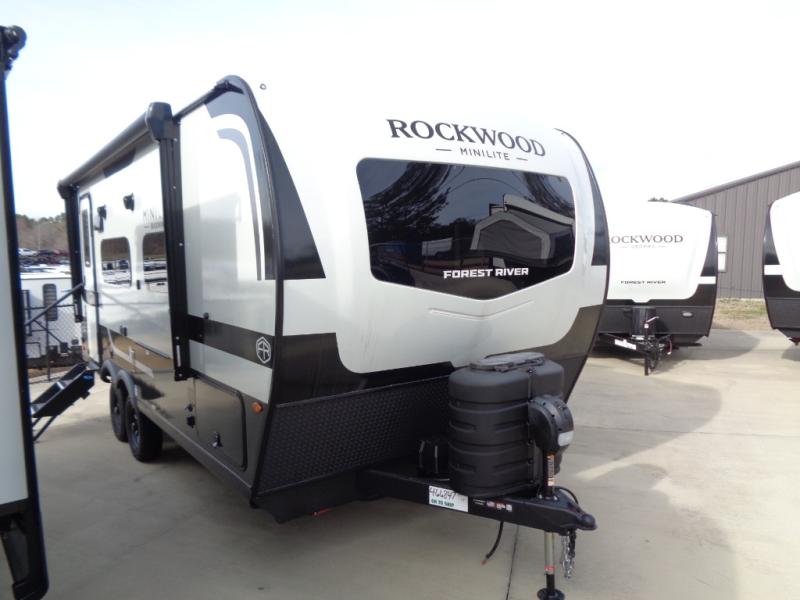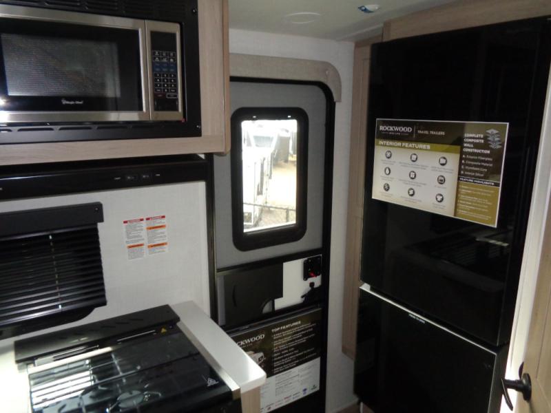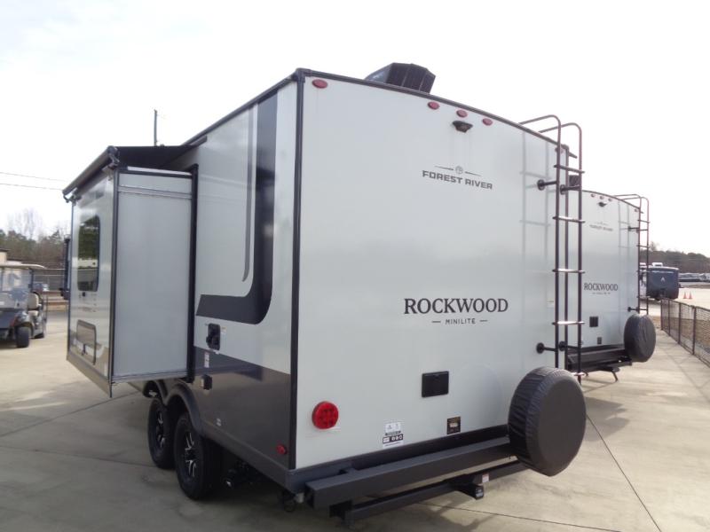 Each Rockwood Mini Lite travel trailer by Forest River is constructed with a fully laminated one-piece walkable roof, sleek frameless windows, and a six-sided full aluminum frame for strength and durability. The 12V thermostatically controlled heated tanks, plus radiant foil in the underbelly will allow you to camp well into the colder months, and the 200W roof solar panel will be perfect for a little off-gridding. Each model includes solid surface kitchen countertops, hidden hinge cabinet doors, roller shades, plus many more interior features. Having an AIR 360+ omnidirectional antenna with WiFi prep on board gives you the option to get some work done if it's needed, and the power tongue jack provides hassle-free set up, so you can enjoy more time relaxing!