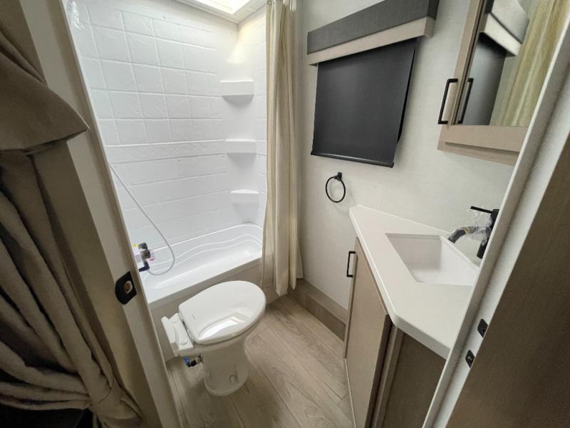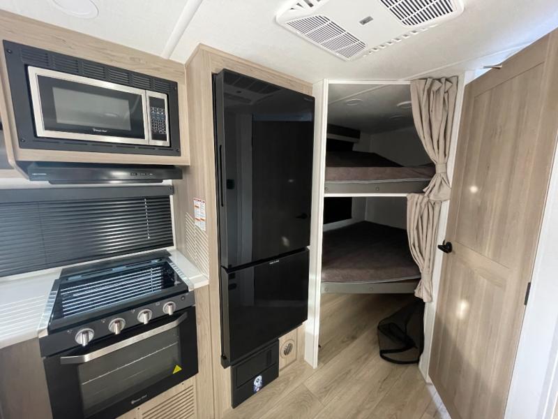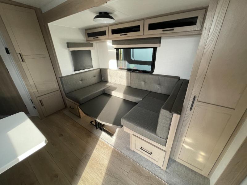 Finally, a lightweight travel trailer with double-size bunks for the kids or your guests! You'll find the versatile Murphy bed up front will be super convenient when you need more space to move around, and the 72" sofa will provide comfy seating space when the bed is put up. This model also includes a U-shaped dinette slide perfect to dine around, play games, and sleep additional guests. A 32" TV in the main living area will allow you to watch your favorite shows in the evenings, or you may just find yourselves outdoors under the 18' power awning with LED lights. And check out the pass-through storage, plus additional exterior storage for your hiking gear!
