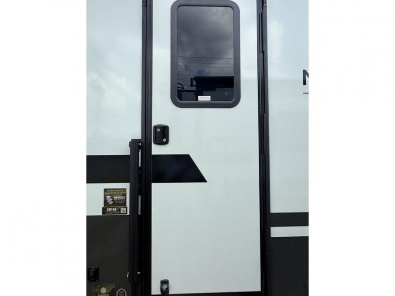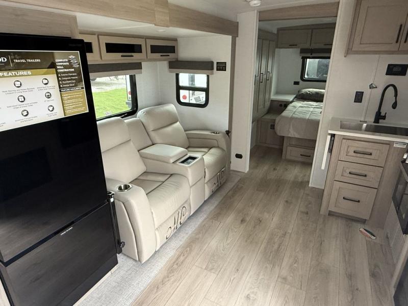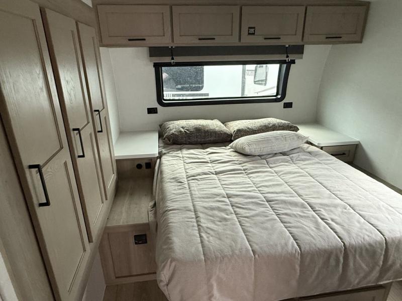 Camping trips to the lake just got sweeter with this dual slide out travel trailer in tow! Once you arrive, unload your gear from the exterior drop-frame pass-through storage, then start lunch on the exterior griddle. If you need a rest after traveling all day, the RV queen bed in the front bedroom is sure to give you comfort, or you can relax on the theater seating. The fireplace and entertainment center with a 32" TV will make this space feel just like home, and check out the spacious full rear bath for added privacy. This model also includes an entryway closet/pantry for jackets, shoes, and food!
