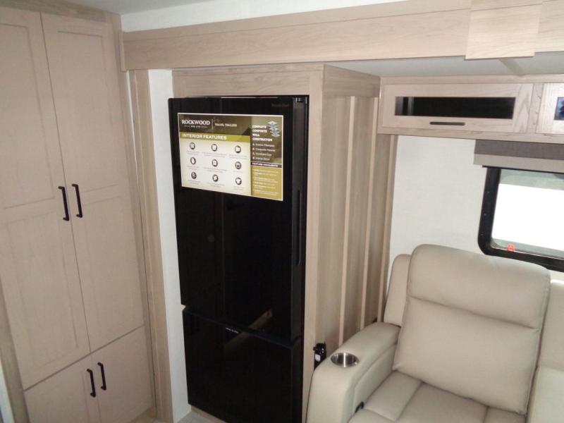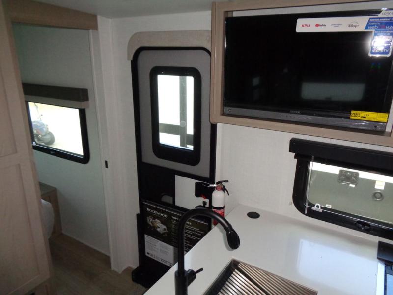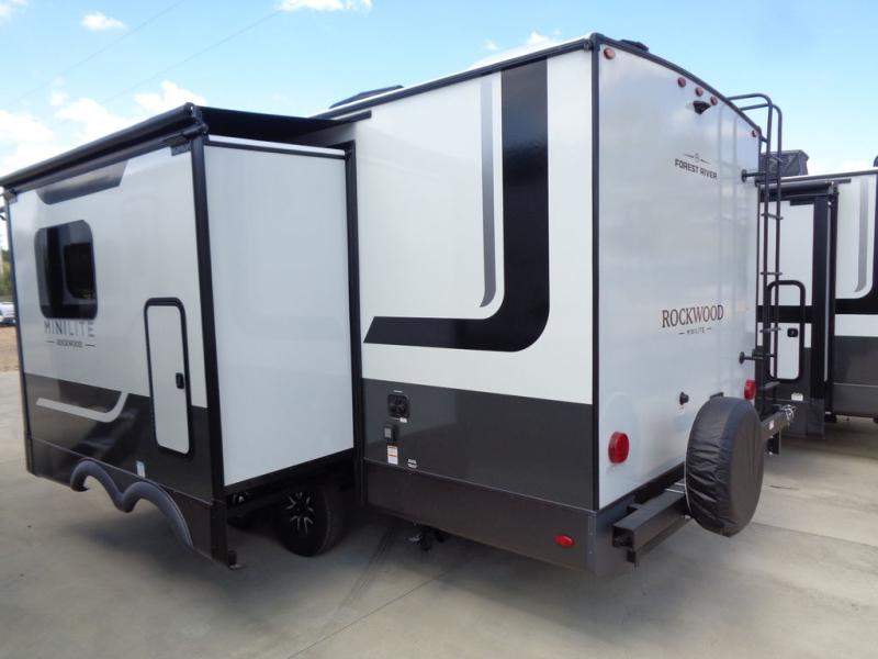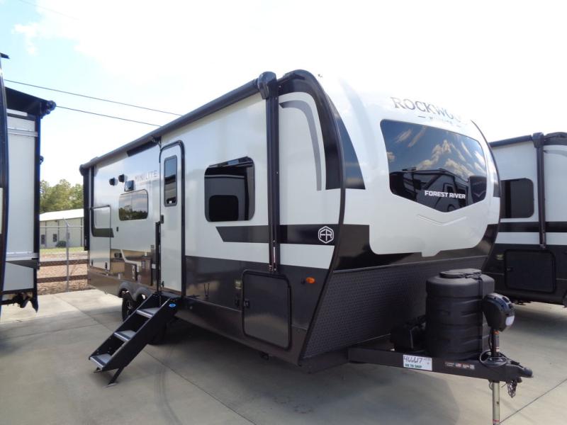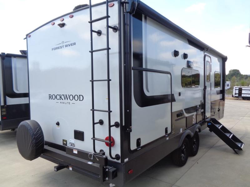 Each Rockwood Mini Lite travel trailer by Forest River is constructed with a fully laminated one-piece walkable roof, sleek frameless windows, and a six-sided full aluminum frame for strength and durability. The 12V thermostatically controlled heated tanks, plus radiant foil in the underbelly will allow you to camp well into the colder months, and the 200W roof solar panel will be perfect for a little off-gridding. Each model includes solid surface kitchen countertops, hidden hinge cabinet doors, roller shades, plus many more interior features. Having an AIR 360+ omnidirectional antenna with WiFi prep on board gives you the option to get some work done if it's needed, and the power tongue jack provides hassle-free set up, so you can enjoy more time relaxing!