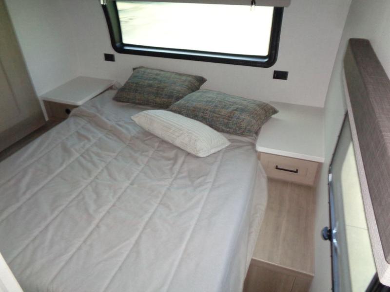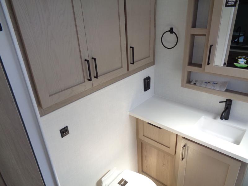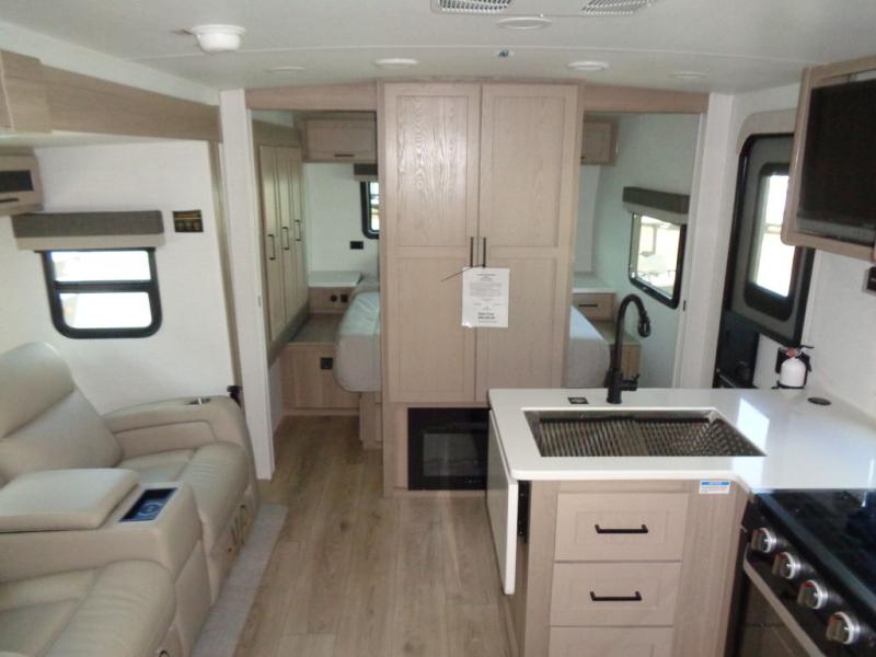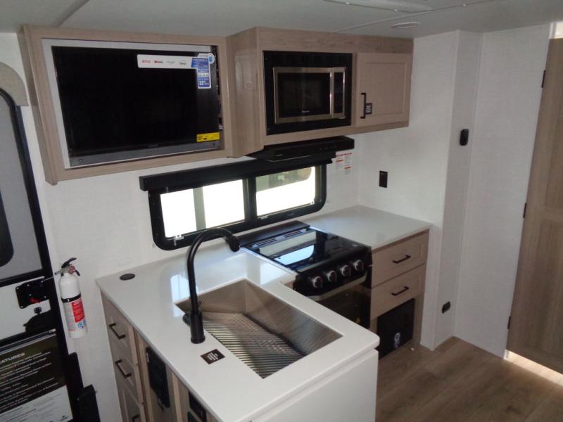 This is the perfect travel trailer for two people looking for comfortable camping trips! You will have your own RV queen bed to sleep on in the front private bedroom, and an optional TV can be added if you enjoy the morning news in bed. Breakfast can be made on the three burner cooktop, or head outdoors to cook on the outside kitchen. The theater seating with a table will provide a place to relax and dine together, and the spacious full rear bath will allow you to clean up before you head out for the day. This model includes plenty of storage space, including two pantries, a wardrobe slide out in the bedroom, plus a drop-frame pass-through storage for larger camp gear!