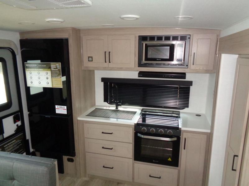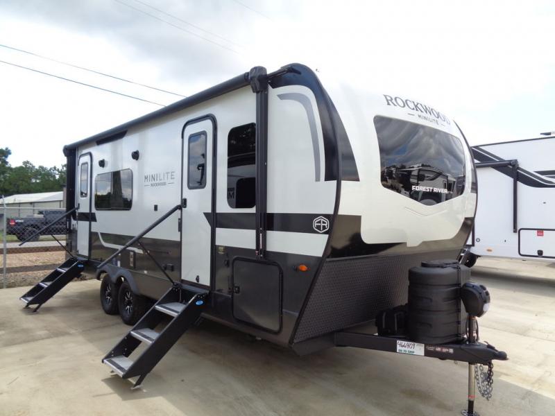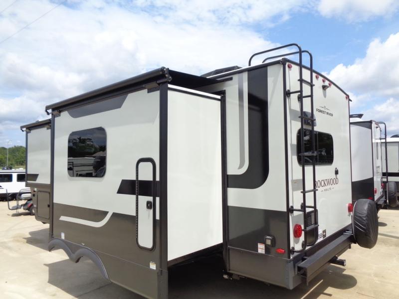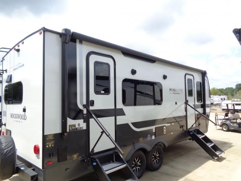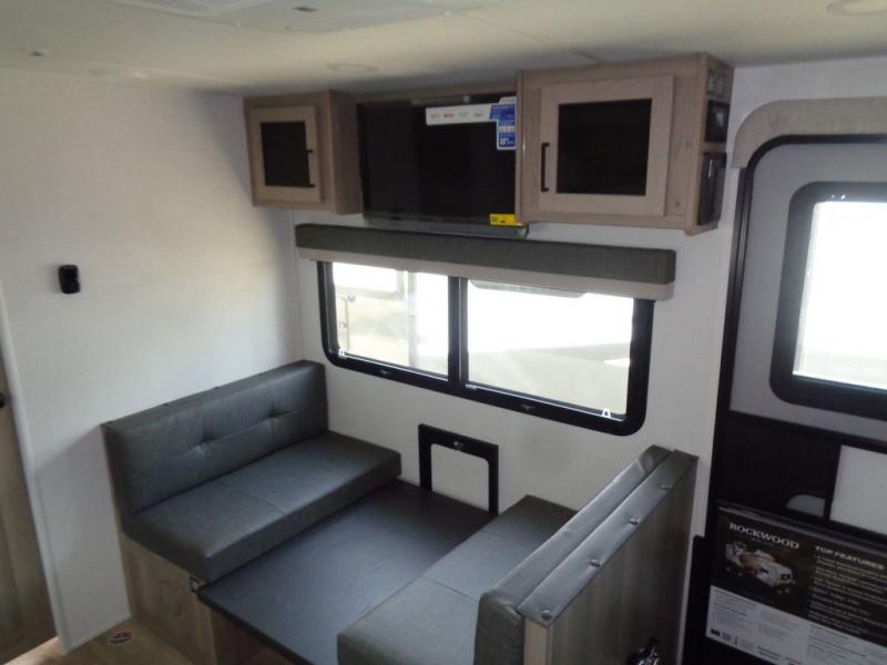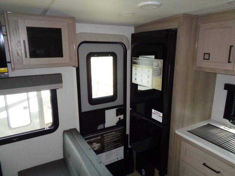 Each Rockwood Mini Lite travel trailer by Forest River is constructed with a fully laminated one-piece walkable roof, sleek frameless windows, and a six-sided full aluminum frame for strength and durability. The 12V thermostatically controlled heated tanks, plus radiant foil in the underbelly will allow you to camp well into the colder months, and the 200W roof solar panel will be perfect for a little off-gridding. Each model includes solid surface kitchen countertops, hidden hinge cabinet doors, roller shades, plus many more interior features. Having an AIR 360+ omnidirectional antenna with WiFi prep on board gives you the option to get some work done if it's needed, and the power tongue jack provides hassle-free set up, so you can enjoy more time relaxing!