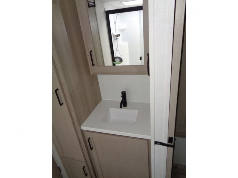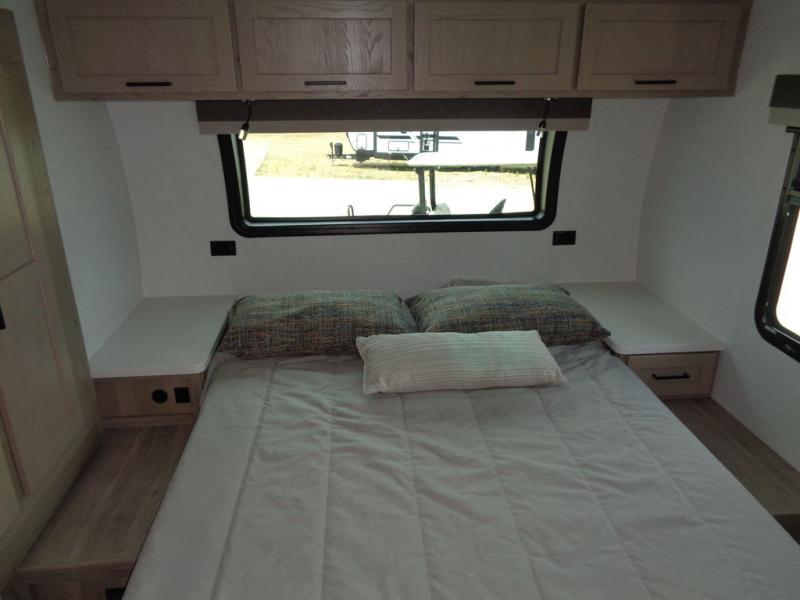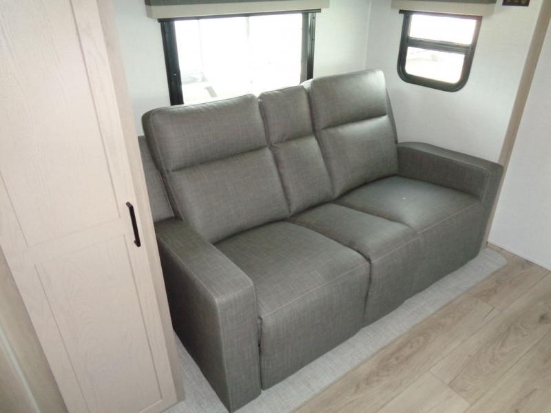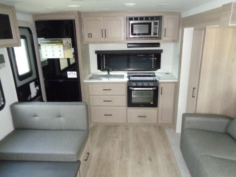 You and your spouse will have a great time camping in this travel trailer! You will have your own RV queen bed to sleep on in the front private bedroom, and an optional TV can be added if you enjoy the morning news in bed. Breakfast can be made on the three burner cooktop in the rear kitchen, or head outdoors to cook on the outside griddle. The 67" theater seating with cupholders will provide a place to relax and dine together, and the spacious walk-through bath will allow you to clean up before you head out for the day. This model includes plenty of storage space, including a pantry for your snacks, a wardrobe slide out in the bedroom, plus a drop-frame pass-through storage for larger camp gear!