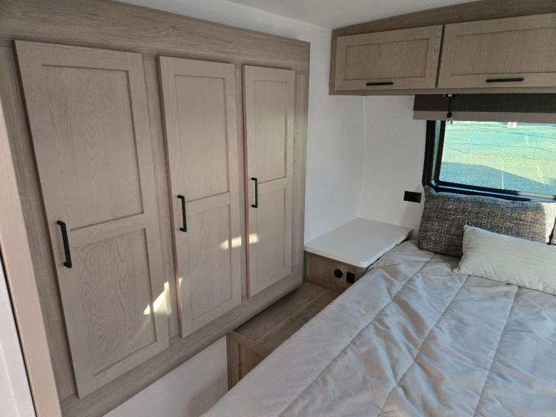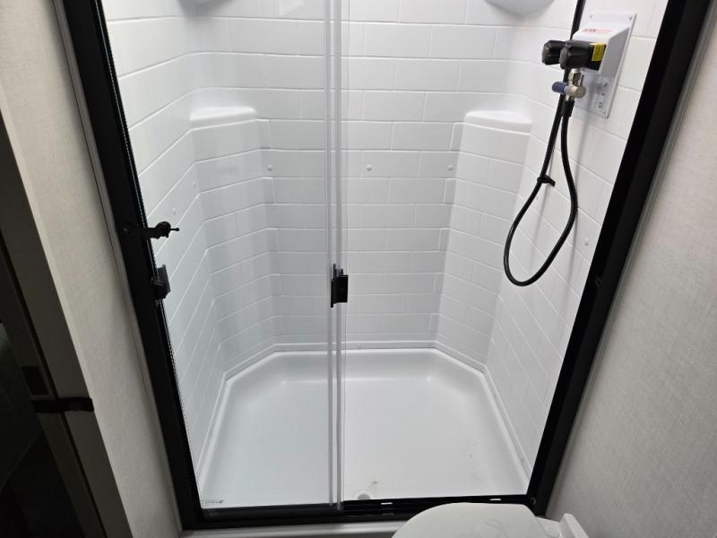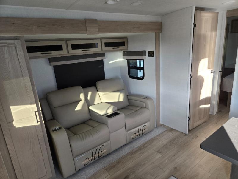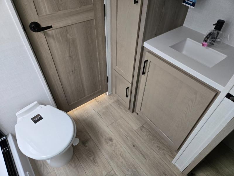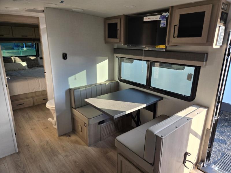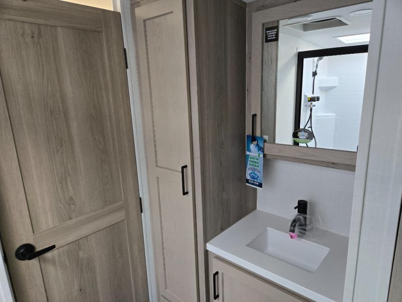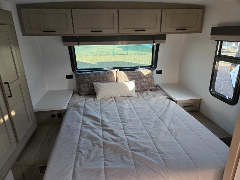 You and your spouse will have a great time camping in this travel trailer! You will have your own RV queen bed to sleep on in the front private bedroom, and an optional TV can be added if you enjoy the morning news in bed. Breakfast can be made on the three burner cooktop in the rear kitchen, or head outdoors to cook on the outside griddle. The 67" theater seating with cupholders will provide a place to relax and dine together, and the spacious walk-through bath will allow you to clean up before you head out for the day. This model includes plenty of storage space, including a pantry for your snacks, a wardrobe slide out in the bedroom, plus a drop-frame pass-through storage for larger camp gear!