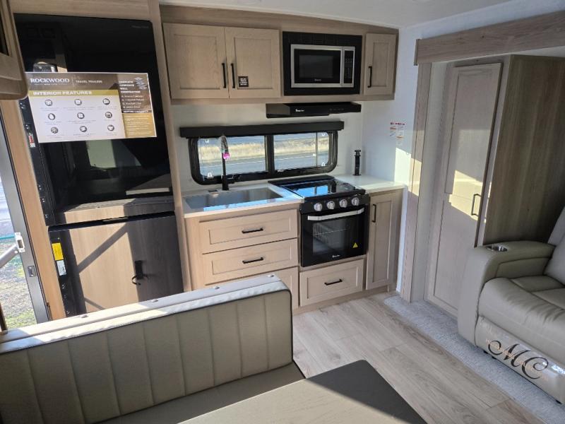 Each Rockwood Mini Lite travel trailer by Forest River is constructed with a fully laminated one-piece walkable roof, sleek frameless windows, and a six-sided full aluminum frame for strength and durability. The 12V thermostatically controlled heated tanks, plus radiant foil in the underbelly will allow you to camp well into the colder months, and the 200W roof solar panel will be perfect for a little off-gridding. Each model includes solid surface kitchen countertops, hidden hinge cabinet doors, roller shades, plus many more interior features. Having an AIR 360+ omnidirectional antenna with WiFi prep on board gives you the option to get some work done if it's needed, and the power tongue jack provides hassle-free set up, so you can enjoy more time relaxing!