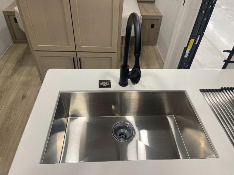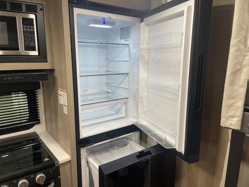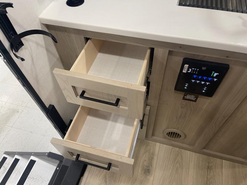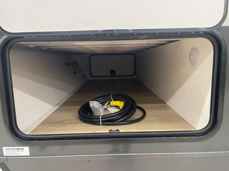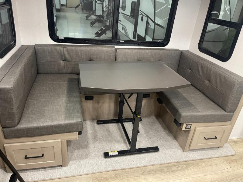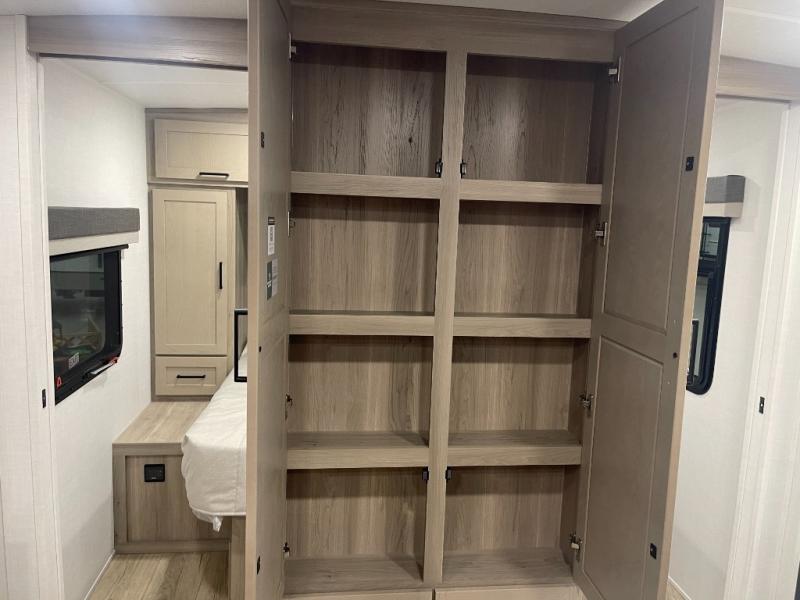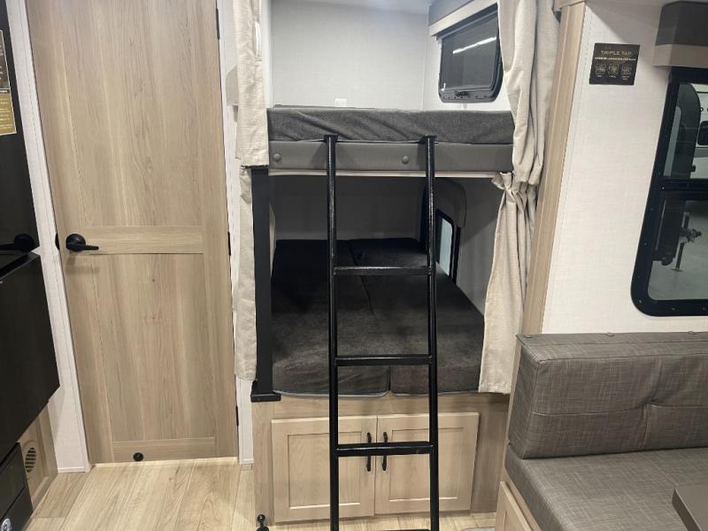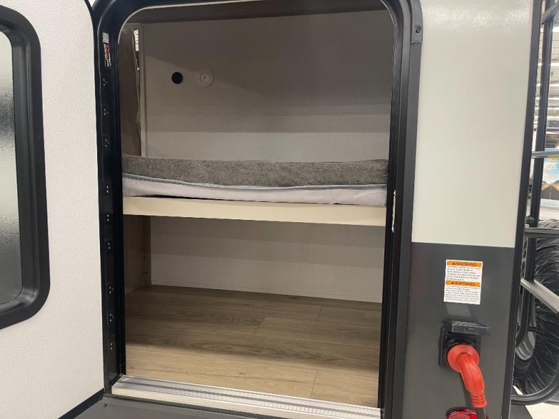 This bunkhouse model is perfect for your crew of six! You will appreciate the exterior bike door that lets you store gear under the flip-up bottom bunk, plus there is a pass-thru storage up front for even more storage. The RV queen bed in the front bedroom includes flip-up storage, two wardrobes, and a TV option if you like to stay up late with a movie. In the morning, everyone can meet in the combined kitchen and living area to dine around the U-shaped dinette, or you can take your plate outdoors to sit under the 18' power awning with LED lights. This model also includes an exterior griddle for a pancake breakfast!