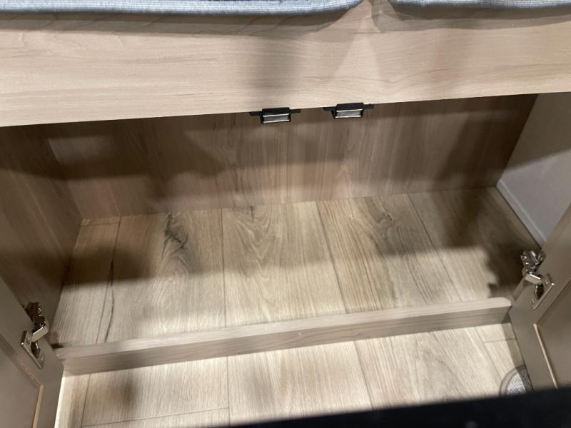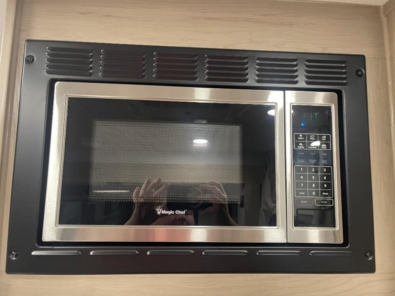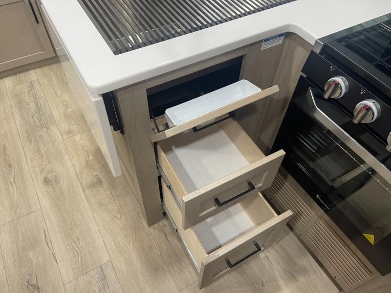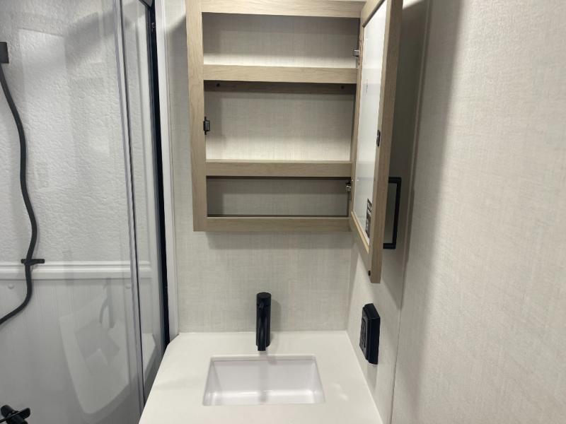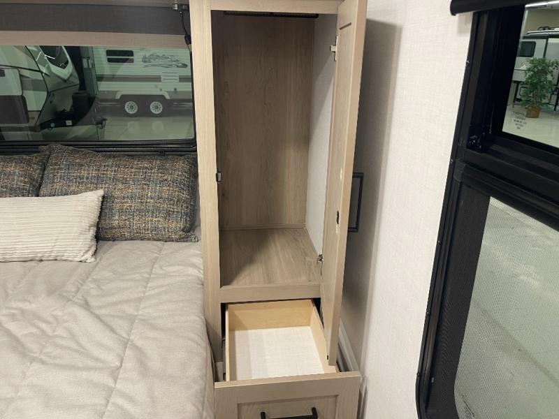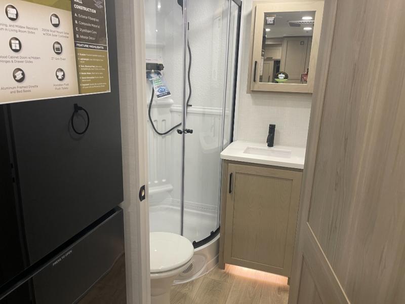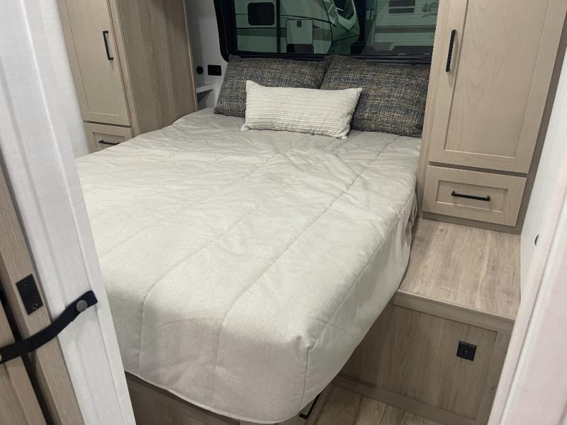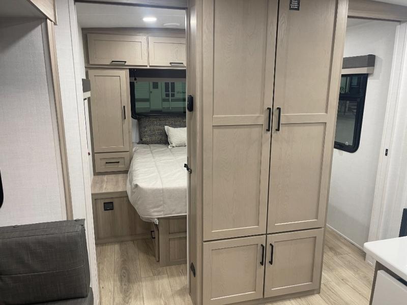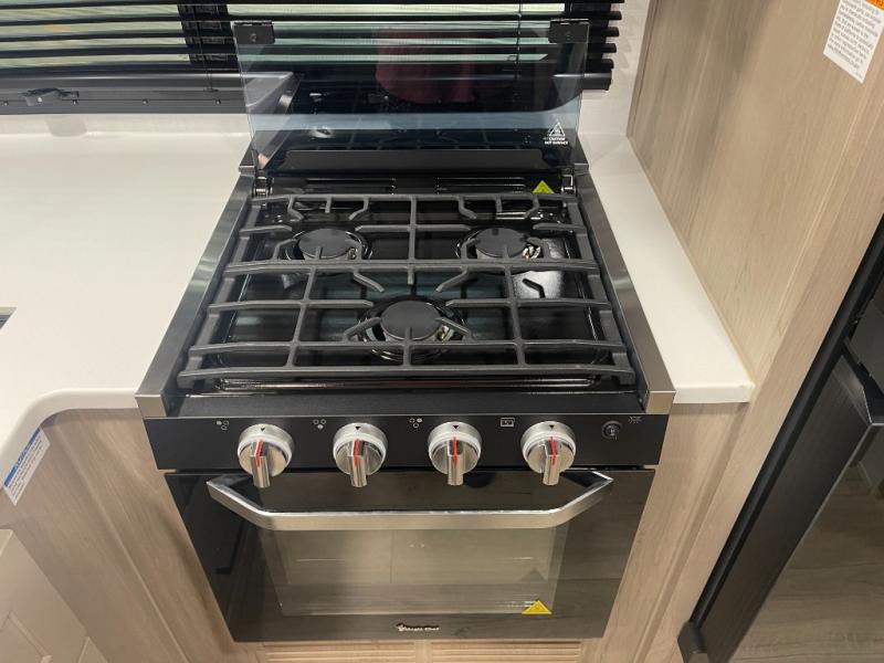 This bunkhouse model is perfect for your crew of six! You will appreciate the exterior bike door that lets you store gear under the flip-up bottom bunk, plus there is a pass-thru storage up front for even more storage. The RV queen bed in the front bedroom includes flip-up storage, two wardrobes, and a TV option if you like to stay up late with a movie. In the morning, everyone can meet in the combined kitchen and living area to dine around the U-shaped dinette, or you can take your plate outdoors to sit under the 18' power awning with LED lights. This model also includes an exterior griddle for a pancake breakfast!