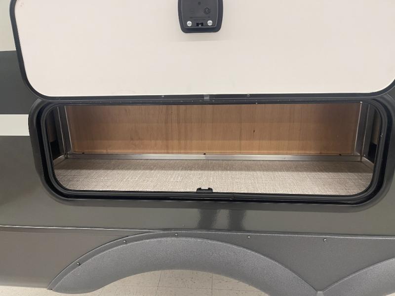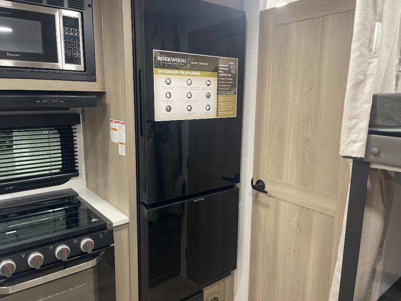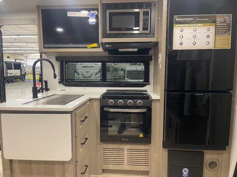 Each Rockwood Mini Lite travel trailer by Forest River is constructed with a fully laminated one-piece walkable roof, sleek frameless windows, and a six-sided full aluminum frame for strength and durability. The 12V thermostatically controlled heated tanks, plus radiant foil in the underbelly will allow you to camp well into the colder months, and the 200W roof solar panel will be perfect for a little off-gridding. Each model includes solid surface kitchen countertops, hidden hinge cabinet doors, roller shades, plus many more interior features. Having an AIR 360+ omnidirectional antenna with WiFi prep on board gives you the option to get some work done if it's needed, and the power tongue jack provides hassle-free set up, so you can enjoy more time relaxing!