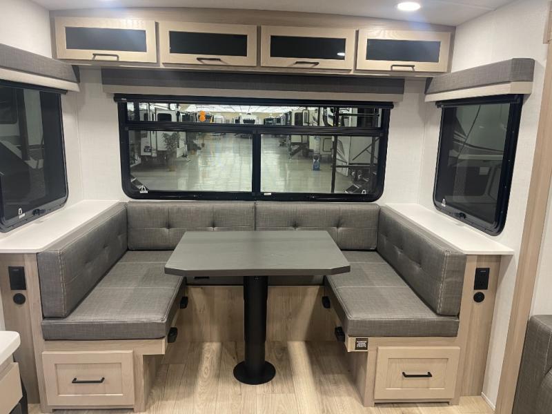 This double slide out travel trailer is perfect for weekend trips or extended stays! Your crew can play a game around the U-shaped dinette, relax on the theater seat across from the TV, or visit outdoors under the 21' awning. The fully-equipped kitchen allows you to make meals each day, and the walk-thru bath is easily accessible for everyone to use. This model also includes a front master bedroom with a queen bed, a wardrobe slide out, and one of the dual entry doors for convenience!