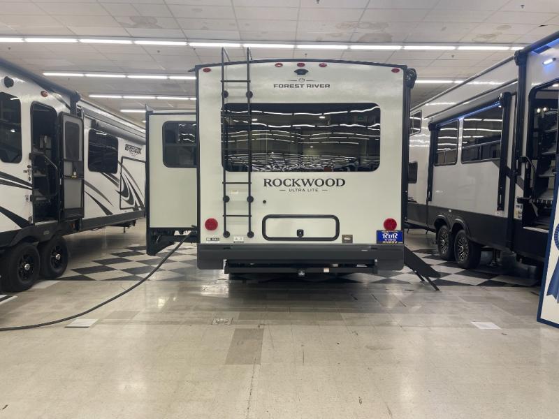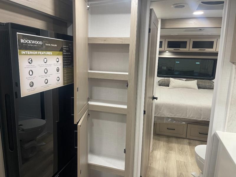 Each Rockwood Ultra Lite travel trailer by Forest River includes superior construction with a high gloss fiberglass cap, aluminum cage construction, and a power awning with LED lighting for a cozy and functional outdoor space. The torsion axle, power tongue jack will make towing smooth and hassle-free, along with the nitrogen filled, Goodyear Endurance tires and the tire pressure monitor system. Interior comforts include kitchen sink with high rise faucet, hidden hinge cabinet doors, and roller shades to name a few. Choose a Rockwood Ultra Lite travel trailer today!